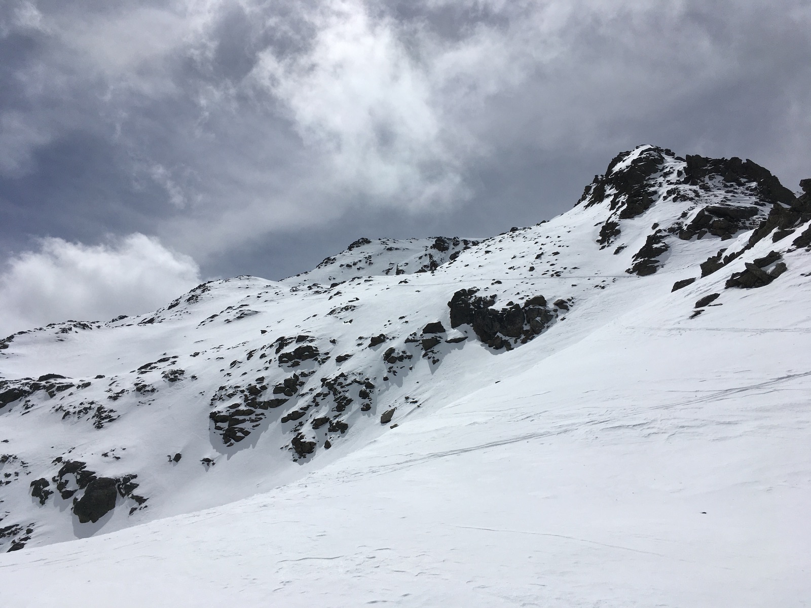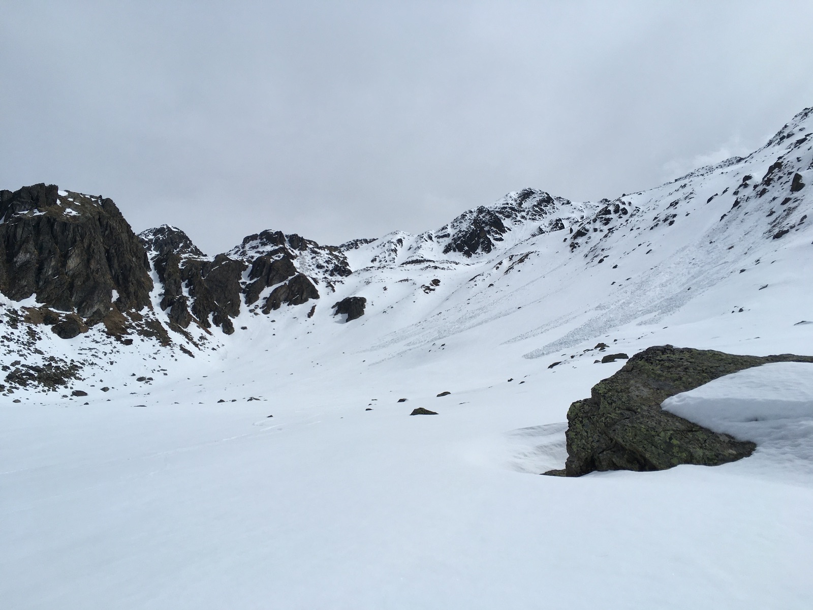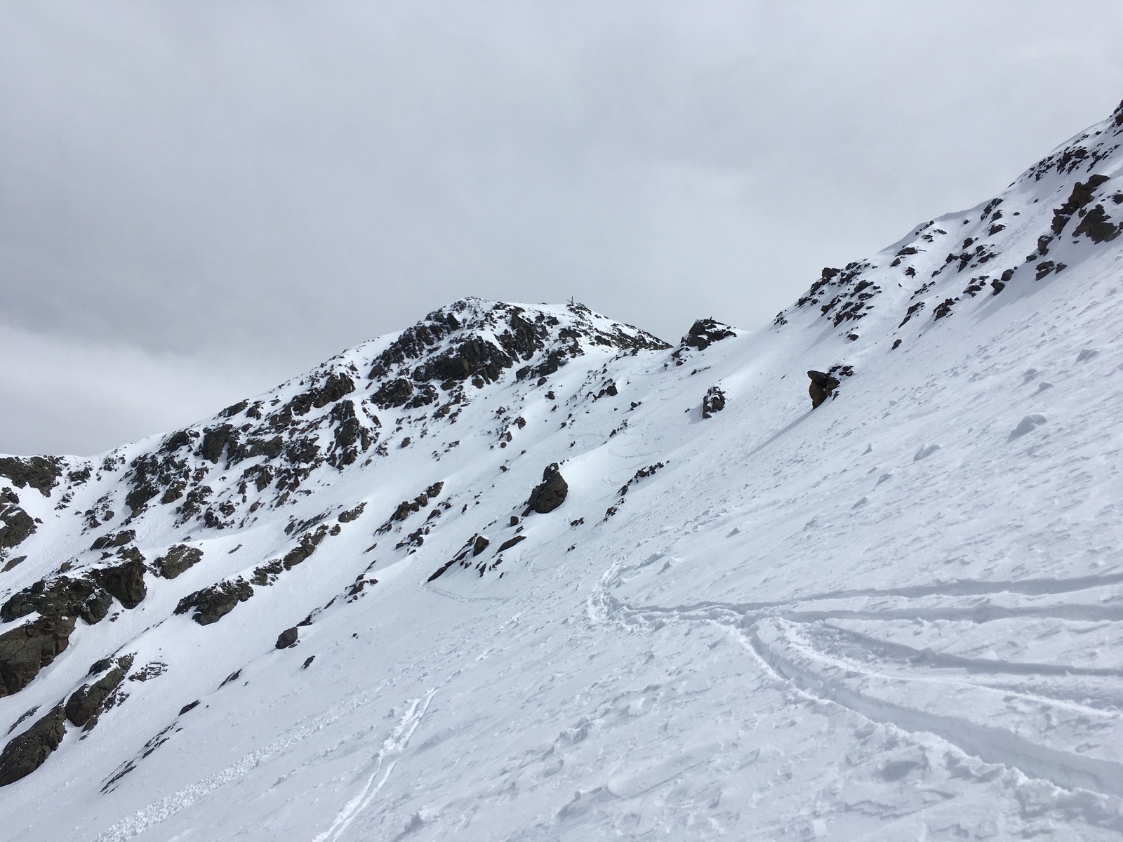 Für die Abfahrt folgte ich schon von unten erspähten Spuren, welche vom Westkamm des Furgler in das Kar nach Norden hinabführten. Dafür muss man knapp 100 Hm durch die steinige Westflanke abrutschen - ging leider nicht komplett ohne Belagschäden, weil doch recht wenig Schnee liegt. Zu Fuß wäre es aber auch nicht ideal (ggf. Steigeisen; u.U. Gefahr des Einbrechens zwischen Felsen). Nach den ersten sehr steilen Abfahrtsmetern in das Nordkar wird es rasch flacher. Hier noch Pulver. Leider dann ab ca. 2.400 m ziemlich tief bzw. bald Sumpfschnee. Ich habe es noch bis ca. 2.050 m versucht, dann aber entnervt aufgegeben und mich für einen Fußaufstieg zurück ins Skigebiet entschieden (praktisch vollständig schneefrei). Wahrscheinlich wäre es aber leichter gewesen, noch bis zur Medrig-Alpe durchzuhalten und von dort zurück ins Skigebiet zu queren. Die Winterabfahrt direkt zur Talabfahrt ist vermutlich nicht mehr machbar.