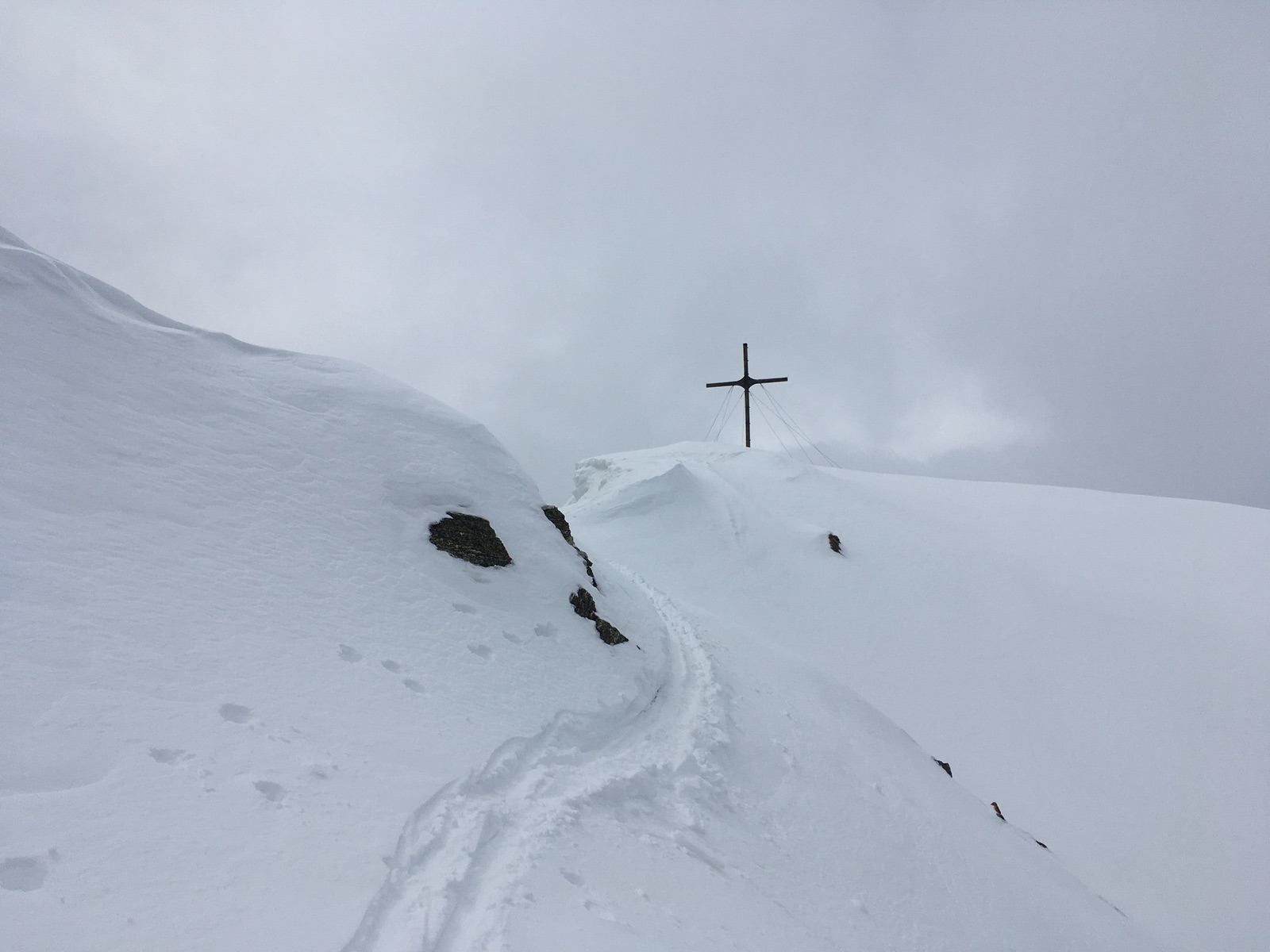 Durch den höheren Start besteht die Tour in erheblichem Umfang aus Querungen, erst unter dem Furglerjoch kommt ein "klassischer" Anstieg. Heute war der Weiterweg ab dem Furglerjoch gut eingespurt und es kein Problem, mit Skiern bis zum riesigen Gipfelkreuz zu kommen.