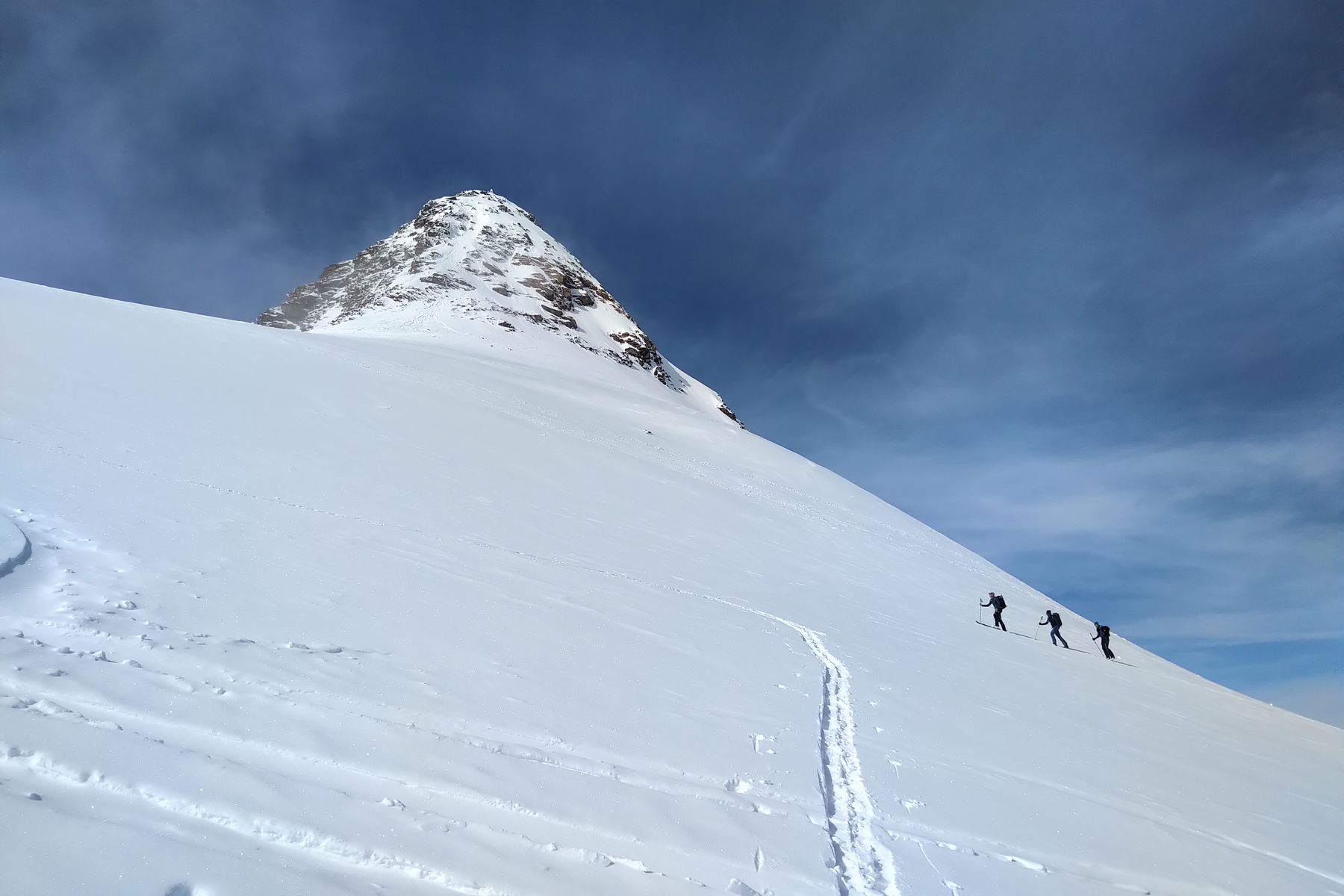 Die Verhältnisse beim Gipfelaufstieg sind jetzt ganz brauchbar, nachdem das heute gut eingetreten wurde. Beim Abstieg war's schon besser, als ich das beim Aufstieg eingeschätzt habe. Danke auch an den ersten Spurer (einen anderen Einzelgänger)! Die alten Spuren mussten nachgetreten werden (sind sie jetzt).