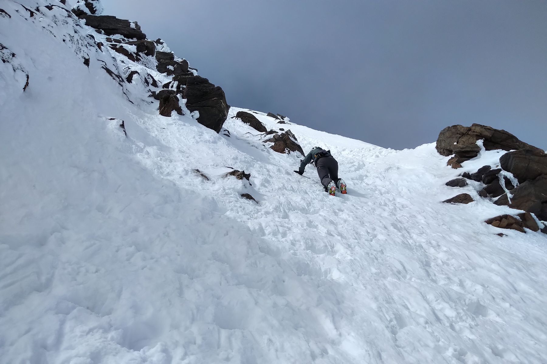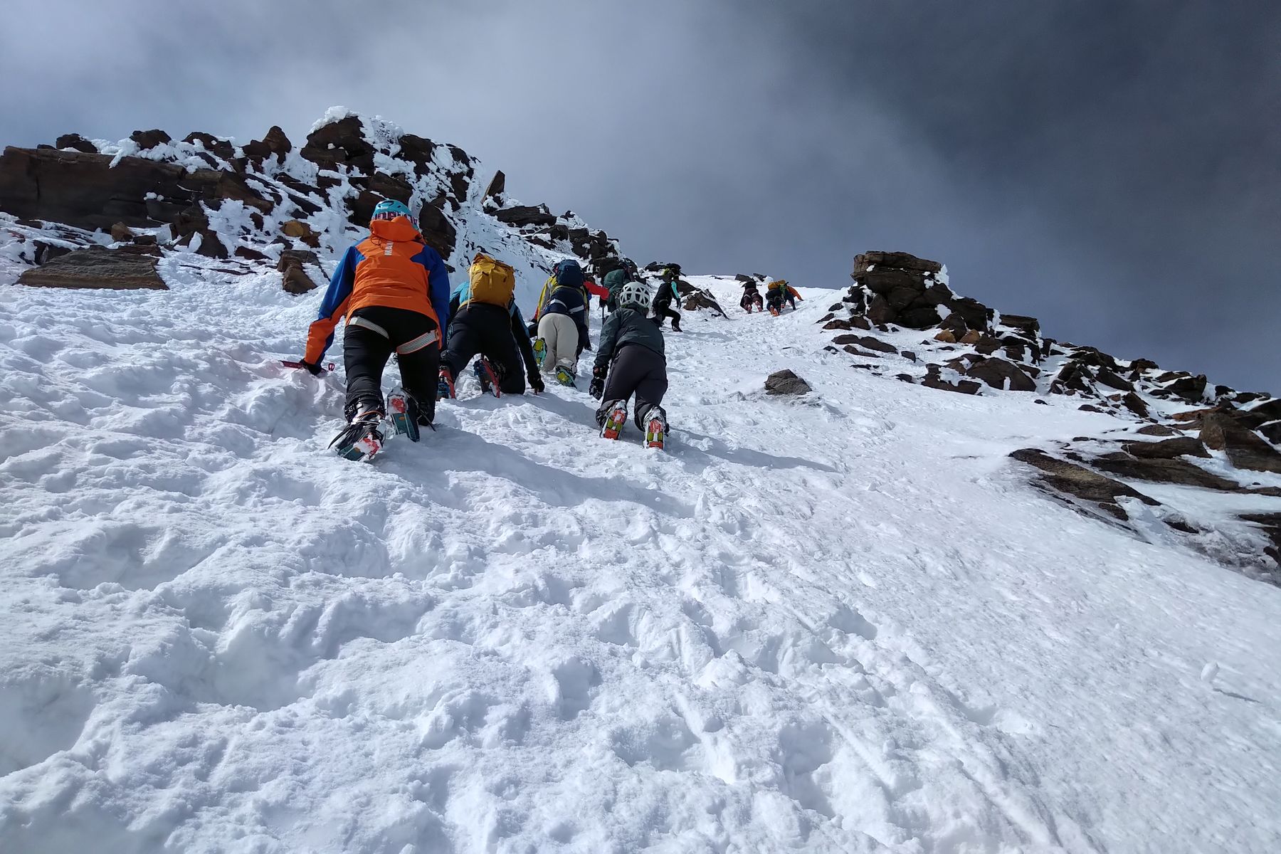 Aktuelle Schlüsselstelle beim Gipfelanstieg ist gerade überwunden (im Abstieg):