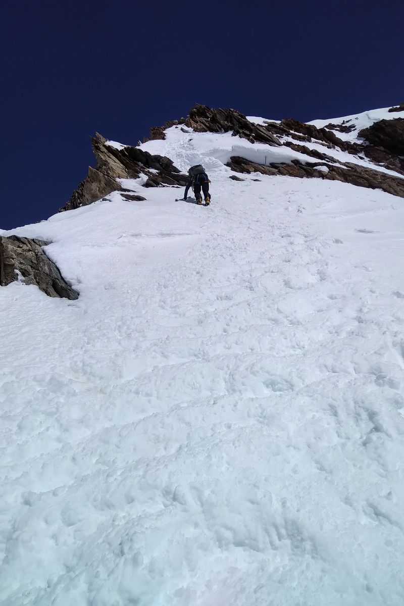 Ein Teil unserer 4er-Gruppe hat die fehlende Höhenanpassung besser weggesteckt, so dass wir uns auf ca. 3300 mit 2 Seilen in 2 Teams aufgeteilt haben. Das vordere Team hat die empfohlene Gipfel-Ankunftszeit erreicht, das andere Team (mit mir) war leider erst zur Mittagszeit auf dem Gipfel. Auch bei guten Verhältnissen zieht sich die SW-Rippe, wenn man nicht gut akklimatisiert ist! Auch wenn der Schnee bei unserer Abfahrt noch gut zu fahren war (nicht sumpfig), war das Risiko von Naßschnee-Lawinen für uns erhöht.