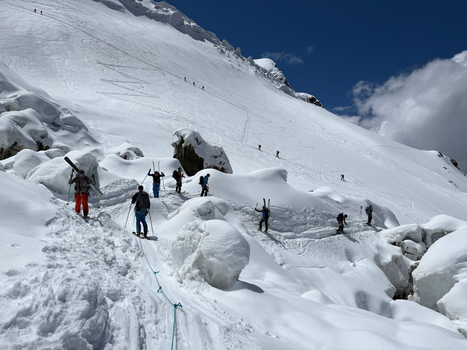 Nach dem Vallot Biwak noch ca. 100hm mit Ski aufwärts, bis der Bosses Grat Richtung Gipfel steil beginnt und es nur noch zu Fuß mit Steigeisen weiter geht.
