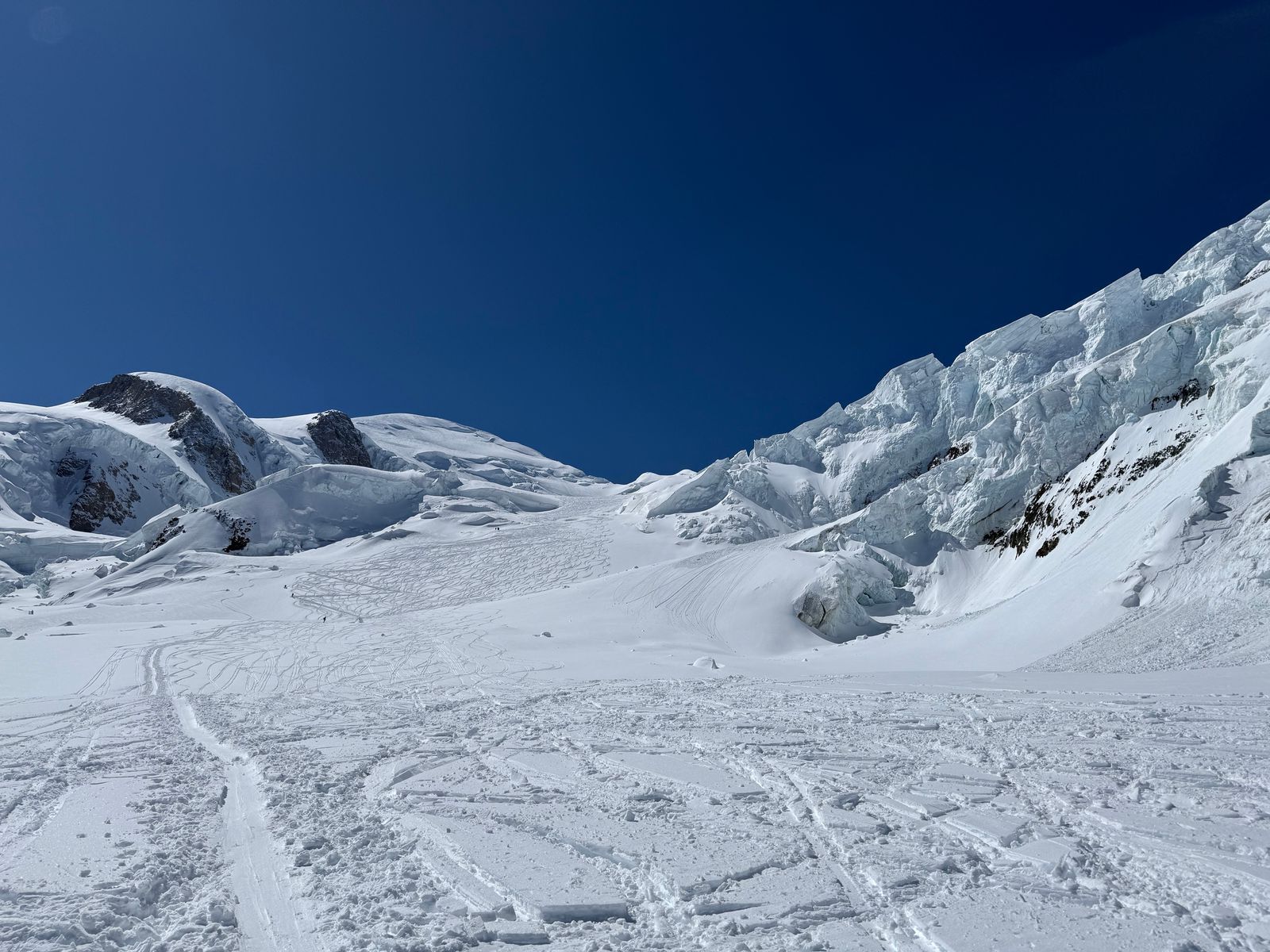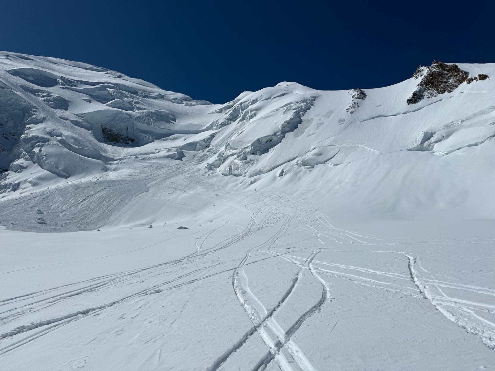 Nach kurzer Pause ging’s an die Abfahrt, kurz direkt nach Norden, dann abwärts links einschwenkend in die Face Nord (anfangs eher west- oder nordwestwärts) hinunter. Teils noch guter Pulver, etwas zerfahren, aber sehr anstrengend aufgrund der Höhe. Am Ende auf das Grand Plateau zurück, wobei die Ausfahrt kurz unter Eisabbrüchen quert und eher zügig zu passieren ist. Dann entlang der Aufstiegsroute zurück, endlich sahen wir dabei auch die in der Dunkelheit passierten furchterregenden Seracs am Petit Plateau. Die Schneequalität wechselte im Abfahrtsverlauf über tragfähige Deckel, Bruchharsch, Firn, und Sulz...
