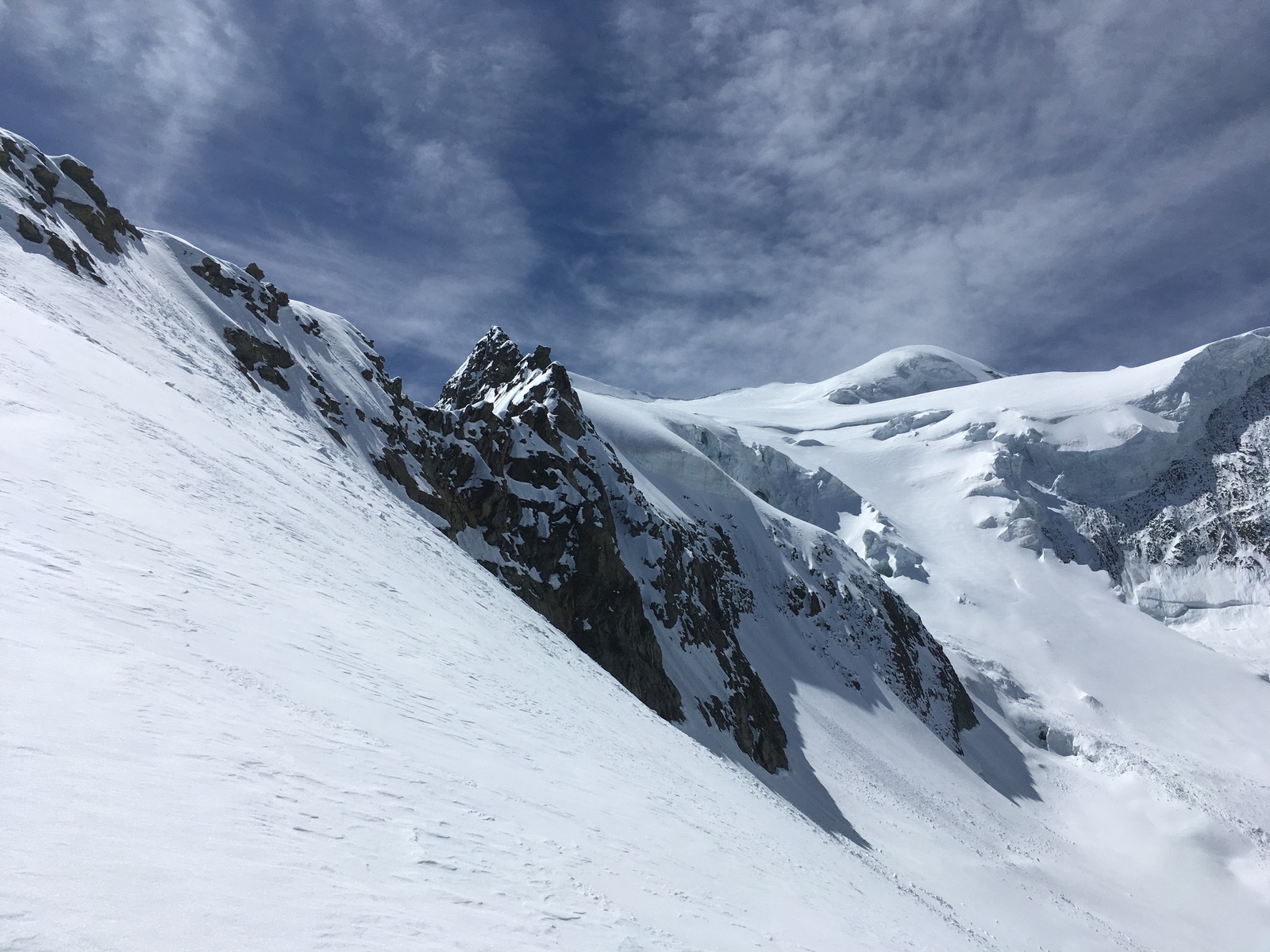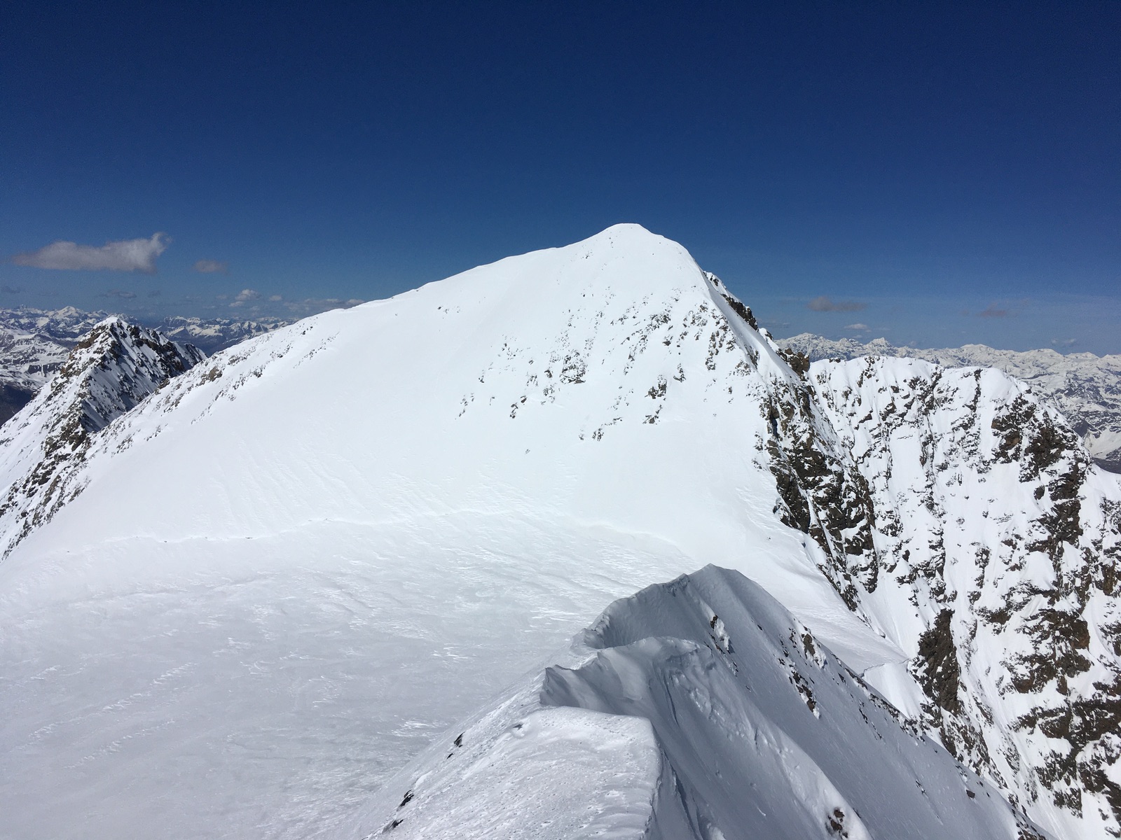 Daher über den Persgletscher bei enorm hoher Temperatur und knapp unter dem Gipfelfelsen der Gamsfreiheit Richtung Fortezzagrat. Dieser Grat schreckte mich für eine Winterbesteigung doch ab, aber man konnte kurz bevor die Felsen beginnen nach Westen über einen steilen Schneehang auskneifen (Harscheisen sinnvoll) und so zur Route über das "Foura" kommen. Bemerkenswerterweise gab es da keine Spuren, so musste ich alles spuren. Was bei einigen Centimentern Pulver auf einem Harschdeckel nicht nur zu Anstollen, sondern v.a. auch (gedanklichem) Fluchen wegen Wegrutschens führte. Mit Harscheisen und ohne Steighilfe ging es dann wieder etwas besser. Angekommen auf der Bellavista-Terrasse galt es einen Weg Richtung des Kares zwischen Piz Zupo & Piz Argient zu finden. Um es kurz zu fassen: Es geht nicht ohne Höhenverlust. Am besten fährt man gleich mit Fellen auf gut 3.700 m ab. Mein Versuch einer sehr hohen Querung führte nur dazu, dass ich sehr steile Hänge (abfahrend ohne Felle) zu queren hatte, wobei ich am Ende doch die Höhenmeter verlor. Im relativ flachen Kar angekommen "wurde die Luft dann dünner" und ich habe mich doch etwas abgeplagt, bis ich endlich am Skidepot auf ca. 3.920 m (deutlich oberhalb der Scharte 3.844 m, wo häufig das Skidepot gemacht wird) angekommen war. Den Rest ging es mit Steigeisen relativ problemlos bis zum schmucklosen Gipfel. Immerhin der zweithöchste Gipfel der Ostalpen! Man hätte auch die Skier mit hochschleppen und dann teilweise sehr steil die Westflanke abfahren können. Wenn ich mich schon einmal da hochgeplagt habe, dann musste natürlich auch noch mit gut 100 Hm Zusatzaufwand der Piz Argient mitgenommen werden - der offenbar beliebter ist, weil es fast bis zum Gipfel mit Skiern geht.