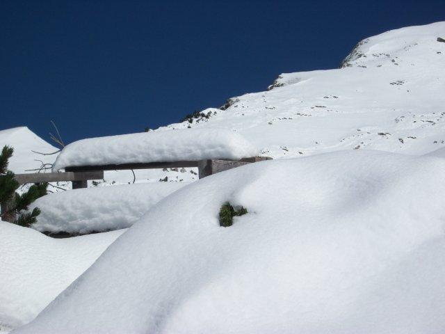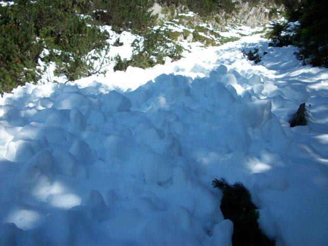 Gefahreneinschätzung: Heikel, der Wirt der Erfurter Hütte hat heute von allen Rofangipfeln abgeraten. Zurecht, wie wir auf dem Weg zur Dalfaz-Alm eindrucksvoll gesehen haben, hier sind - wahrscheinlich gestern - einige, für diese Jahreszeit ungewöhnlich, Lawinerl abgegangen, die man heute morgen gefahrlos queren konnte. Wir sind weiter richtung Streichkopf, haben aber dann ein Bankerl auf 2000 Meter zum "Gipfel" erklärt, nachdem einige Steilhänge noch nicht entladen waren. Lawinenausrüstung wäre weiter oben durchaus angebracht gewesen. Streichkopf und Hochiss haben wir uns deshalb gespart.