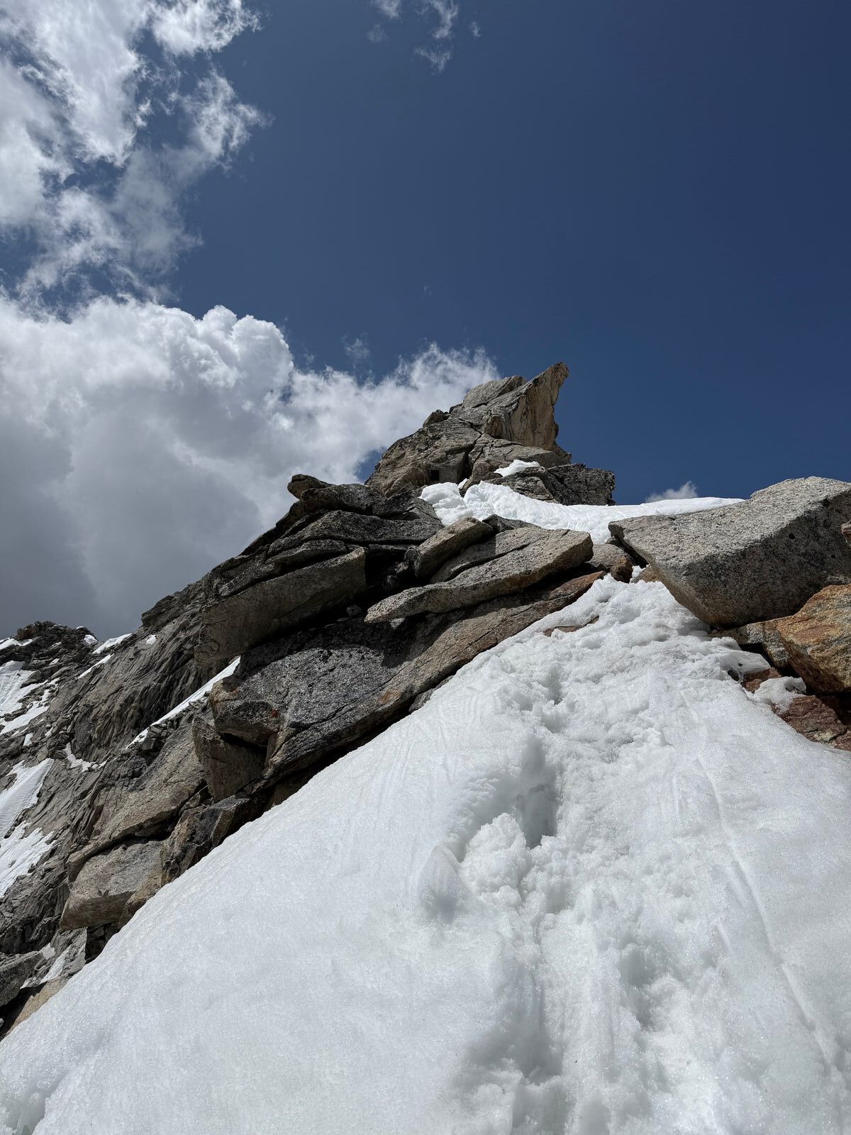 Am unangenehmsten fanden wir kurz vor dem Gipfel die Querung des kleinen Felstürmchens, wo schattseitig noch viel Schnee liegt und es sehr steil ist. Eine Zwischensicherung vorher war ausgegraben, danach haben wir noch eine an einem Felsköpchen dazu gemacht. Das hat alles gedauert, so dass wir ca. 5h zum Gipfel unterwegs waren.