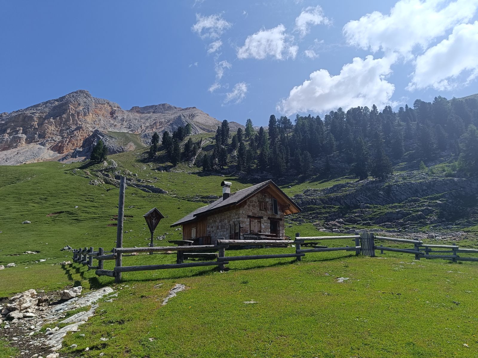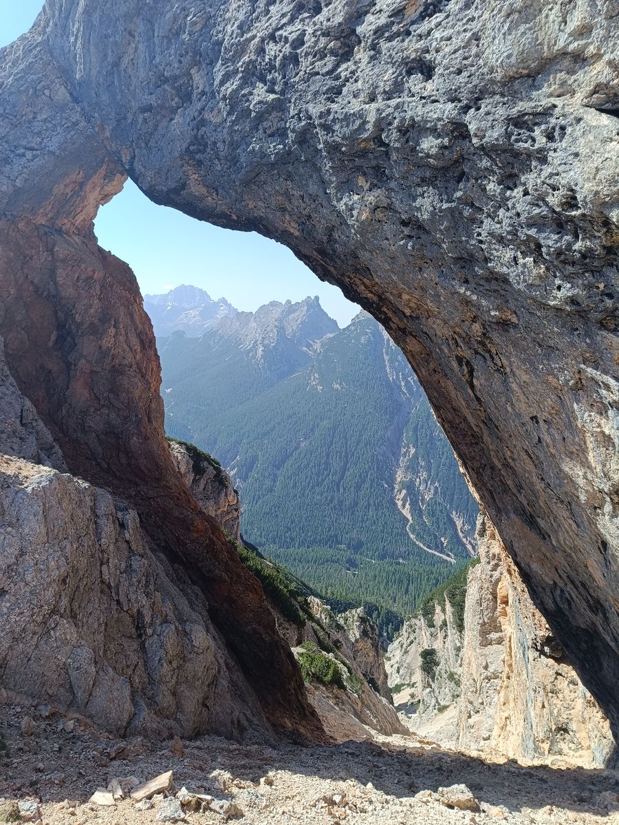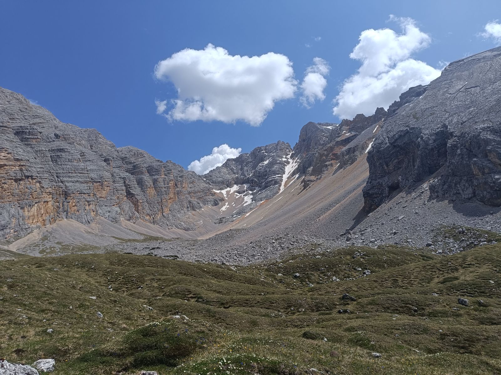 Route: Von der Malga Ra Stua zuerst auf den alten Militärweg (viel schöner als es sich anhört) und später auf Steig von Westen her auf die Croda. Diese kann sehr lohnend nach Osten zum Pian Lerosa überschritten werden, wobei der Abstieg deutlich einfacher ist als es zunächst den Anschein hat, da sich der Steig geschickt durch die Steilflanke mogelt. Ein besonderes Glanzlicht ist dabei ein riesiges Felsenfenster, eigentlich eher ein "Portal" (siehe Bilder). Vom Pian Lerosa (ab hier keine Markierung oder ähnliches) zur gleichnamigen Alm und nun völlig weglos zum Pian de Socroda (in der Locus-App ist die Route ersichtlich), wo man wieder auf Steinmandln trifft, da dort eine Route von unten zum ehemaligen Bivacco Helbig führt. Von dort könnte man noch weiter bis zu den Fosses-Seen gehen, aber da war ich ja erstens am Montag schon und zweitens ist das schon noch ein gutes Stück, was sich wegen der sich ankündigenden Gewitter nicht empfahl. Daher bin ich zurück zum Pian Socroda und hinab zur Malga Ra Stua.