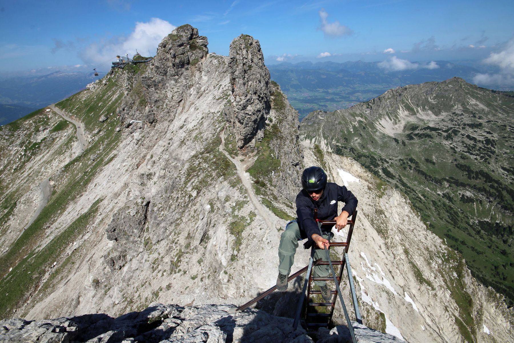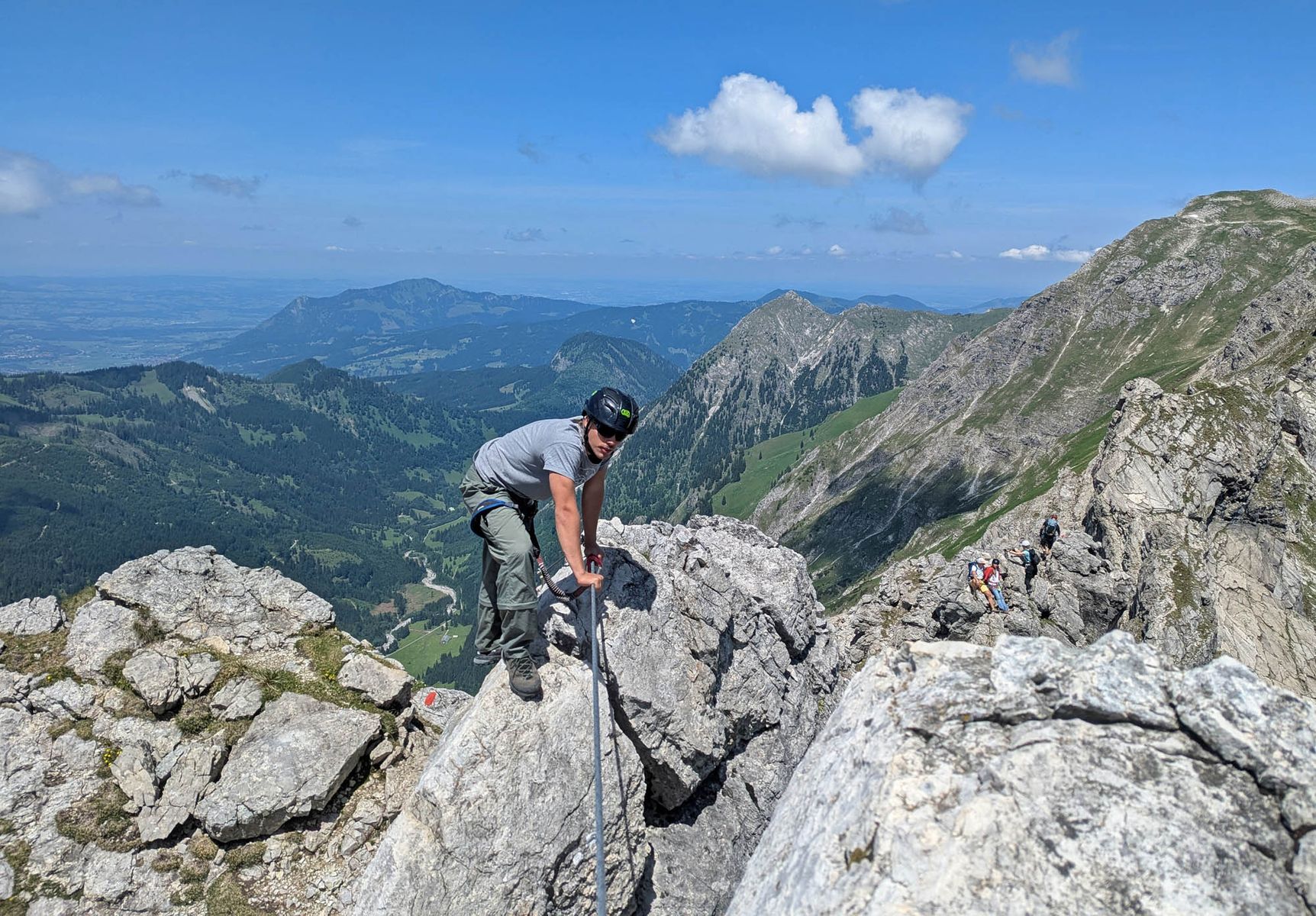Der Hindelanger Klettersteig war am Dienstag trocken und schneefrei. Wir sind zum warm werden vom Tal aus aufs Nebelhorn aufgestiegen, während die Kids mit der Seilbahn hochfuhren.