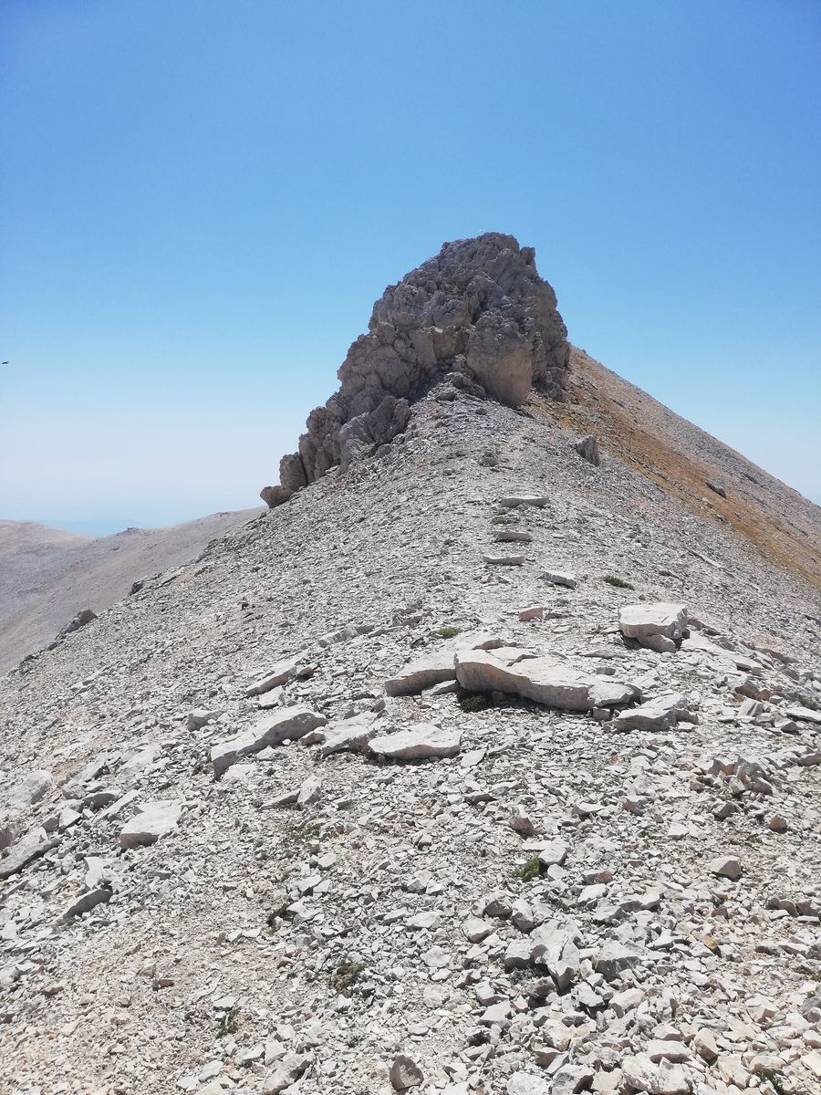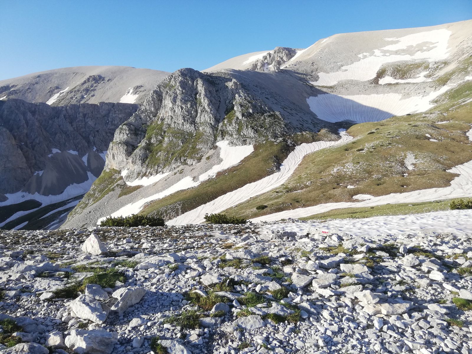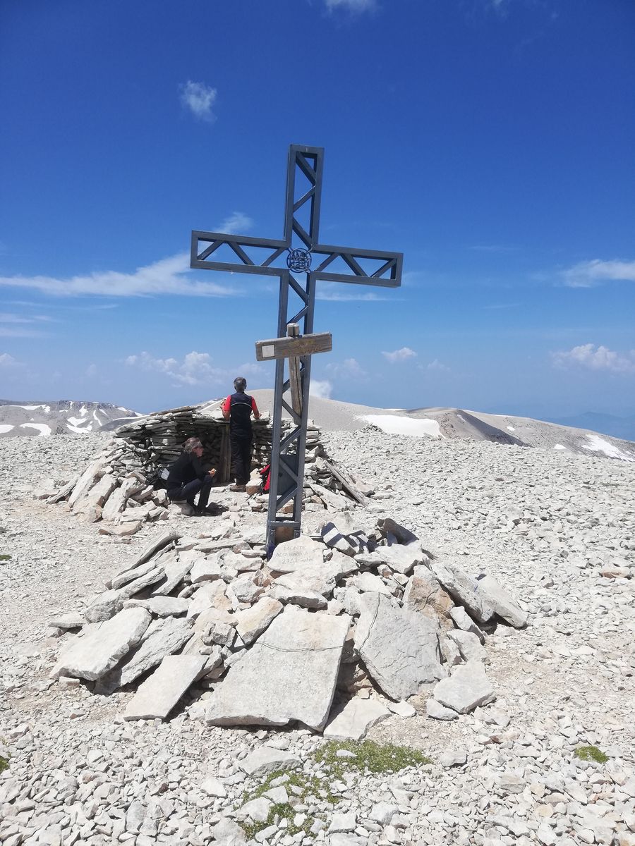 Vom Rifugio geht es zunächst auf der restlichen Straße bis zu einer Kapelle /Madonna, ab dieser dann auf deutlichem Steig nach links in die Flanke und länger auf und ab durch Latschen bis zum Sella Aquaviva mit der letzten Quelle auf der Tour. Ab hier geht's auf Steig durch Gelände, wie man es aus den Kalkapen kennt, hoch zum Monte Focalone. Danach macht man vorallem km. Erst über Gratrücken etwa 120Hm runter und etwa 100Hm rauf zur Cima Pomilio, wieder ca 100Hm runter, an einer Erhebung in der Flanke vorbei und ca 100Hm rauf auf einen Punkt, der (wohl) die Cima Tre Portoni ist, wieder flach etwa 50Hm runter auf eine Art Hochebene und in großem Bogen nach links knapp 200Hm auf den Monte Amaro. Das waren dann gut 13km und rund 1250Hm und man steht auf dem nach dem Gran Sasso zweithöchsten Berg der Abruzzen und der gesamten Appeninnen.