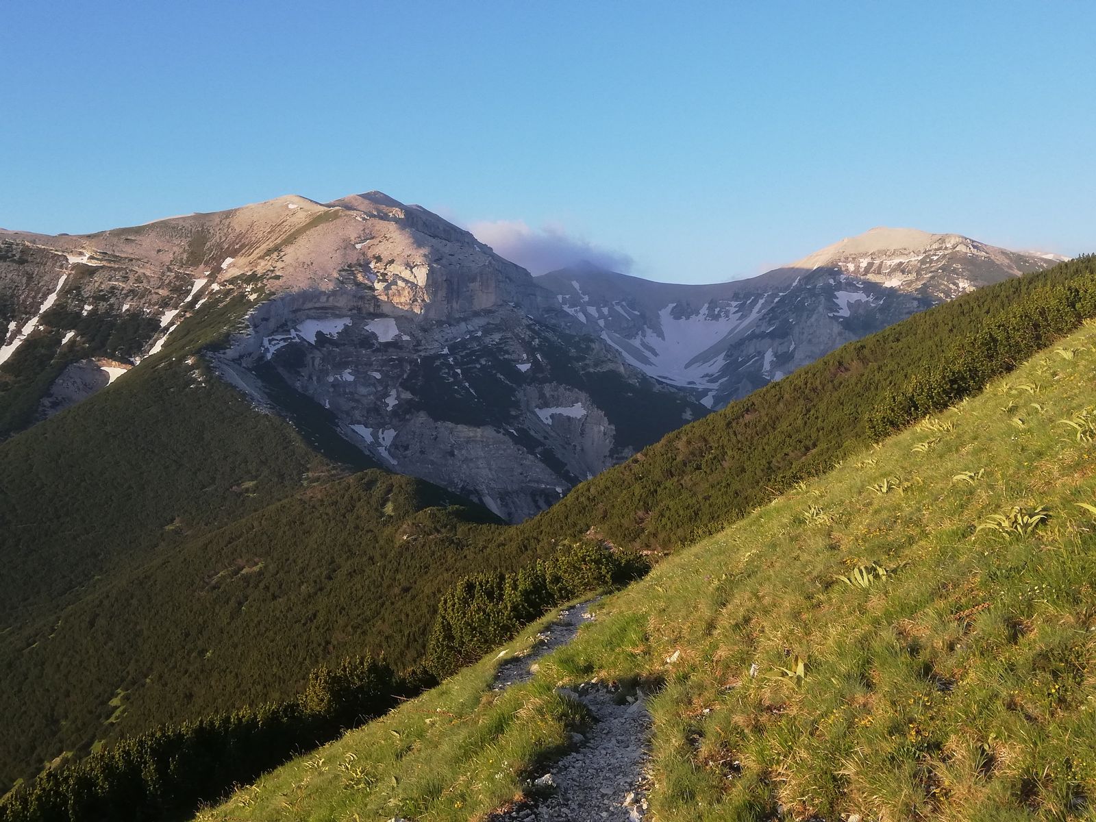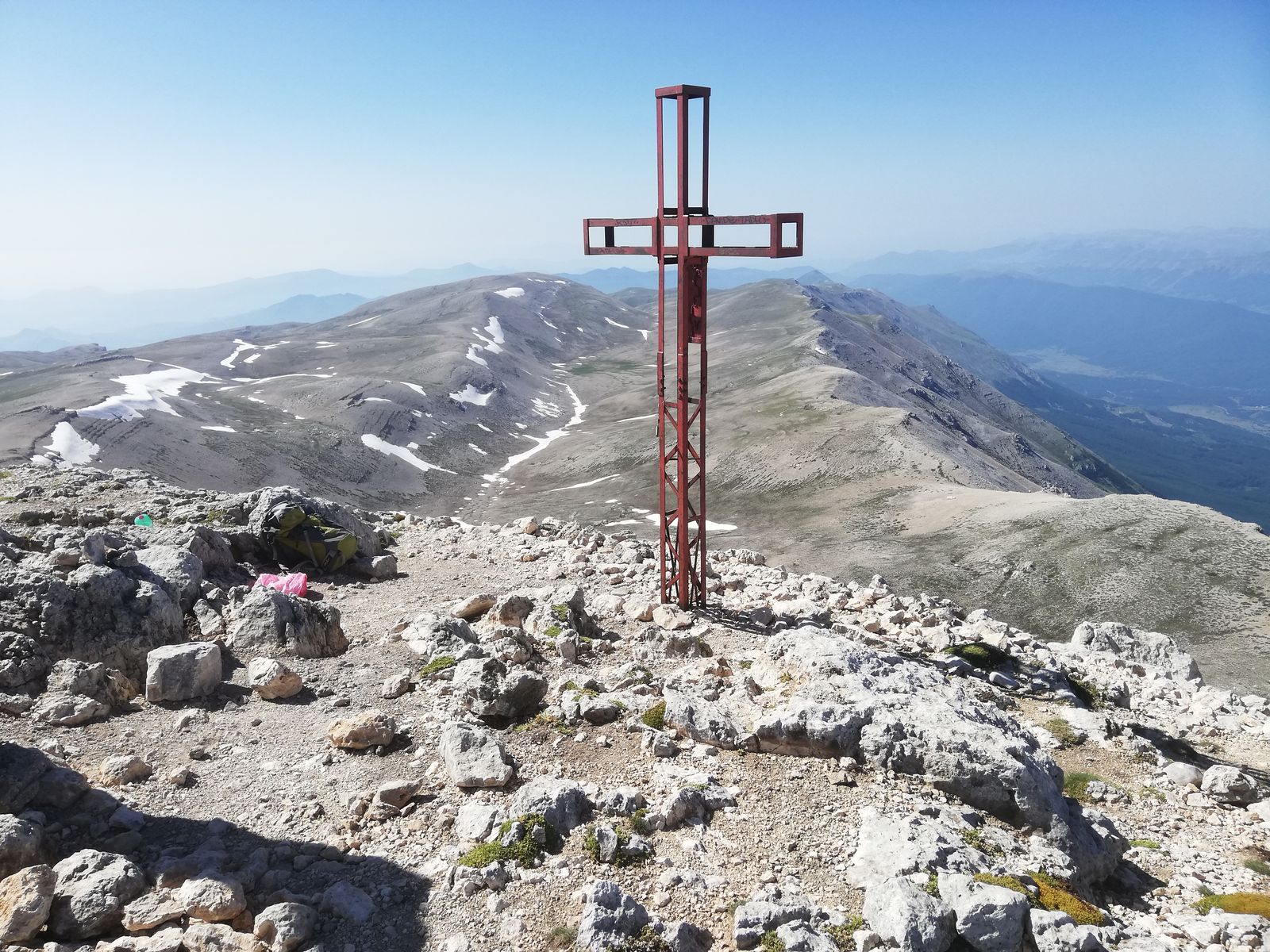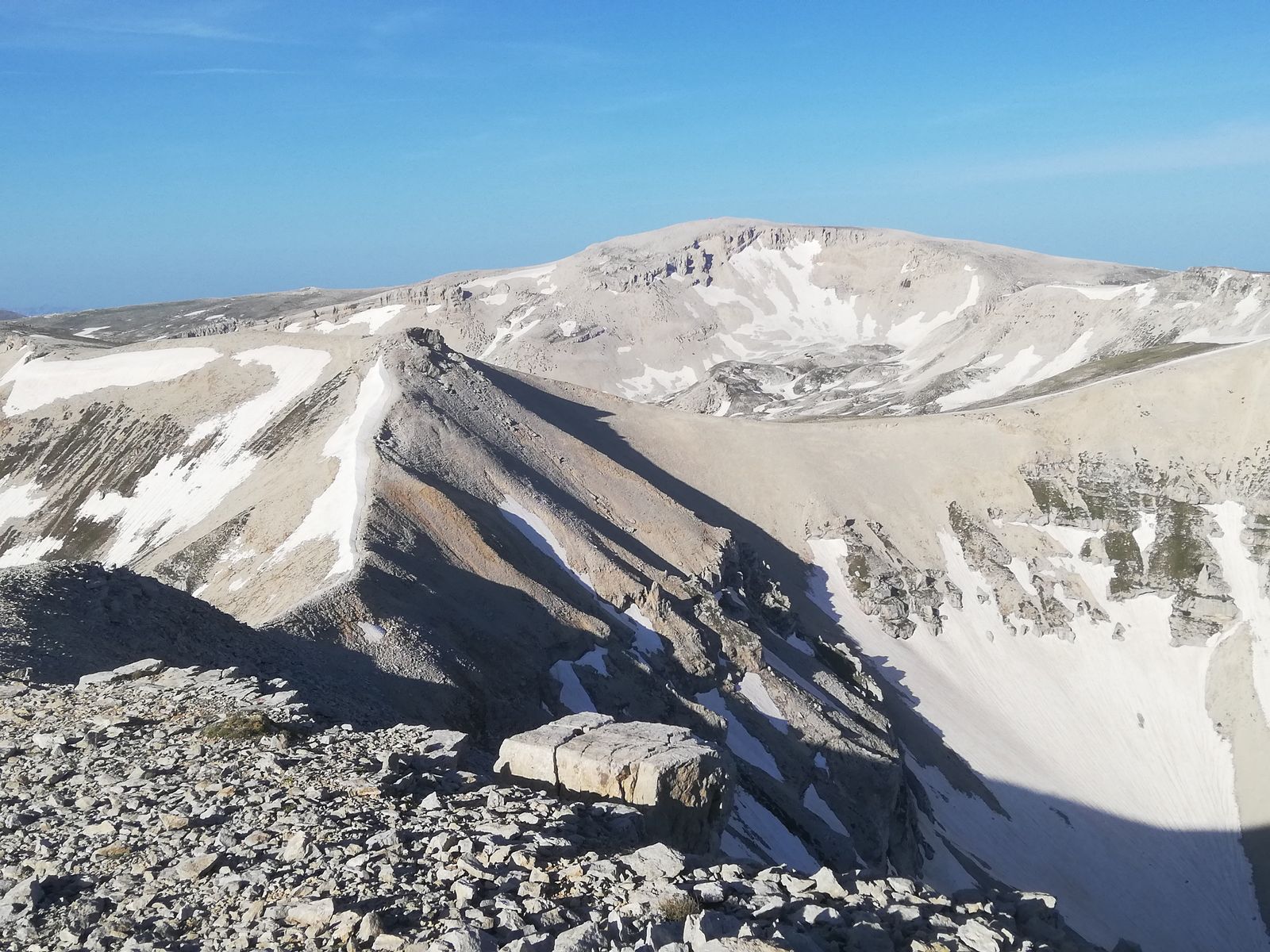 Vom Rifugio geht es zunächst auf der restlichen Straße bis zu einer Kapelle /Madonna, ab dieser dann auf deutlichem Steig nach links in die Flanke und länger auf und ab durch Latschen bis zum Sella Aquaviva mit der letzten Quelle auf der Tour. Ab hier geht's auf Steig durch Gelände, wie man es aus den Kalkapen kennt, hoch zum Monte Focalone. Danach macht man vorallem km. Erst über Gratrücken etwa 120Hm runter und etwa 100Hm rauf zur Cima Pomilio, wieder ca 100Hm runter, an einer Erhebung in der Flanke vorbei und ca 100Hm rauf auf einen Punkt, der (wohl) die Cima Tre Portoni ist, wieder flach etwa 50Hm runter auf eine Art Hochebene und in großem Bogen nach links knapp 200Hm auf den Monte Amaro. Das waren dann gut 13km und rund 1250Hm und man steht auf dem nach dem Gran Sasso zweithöchsten Berg der Abruzzen und der gesamten Appeninnen.