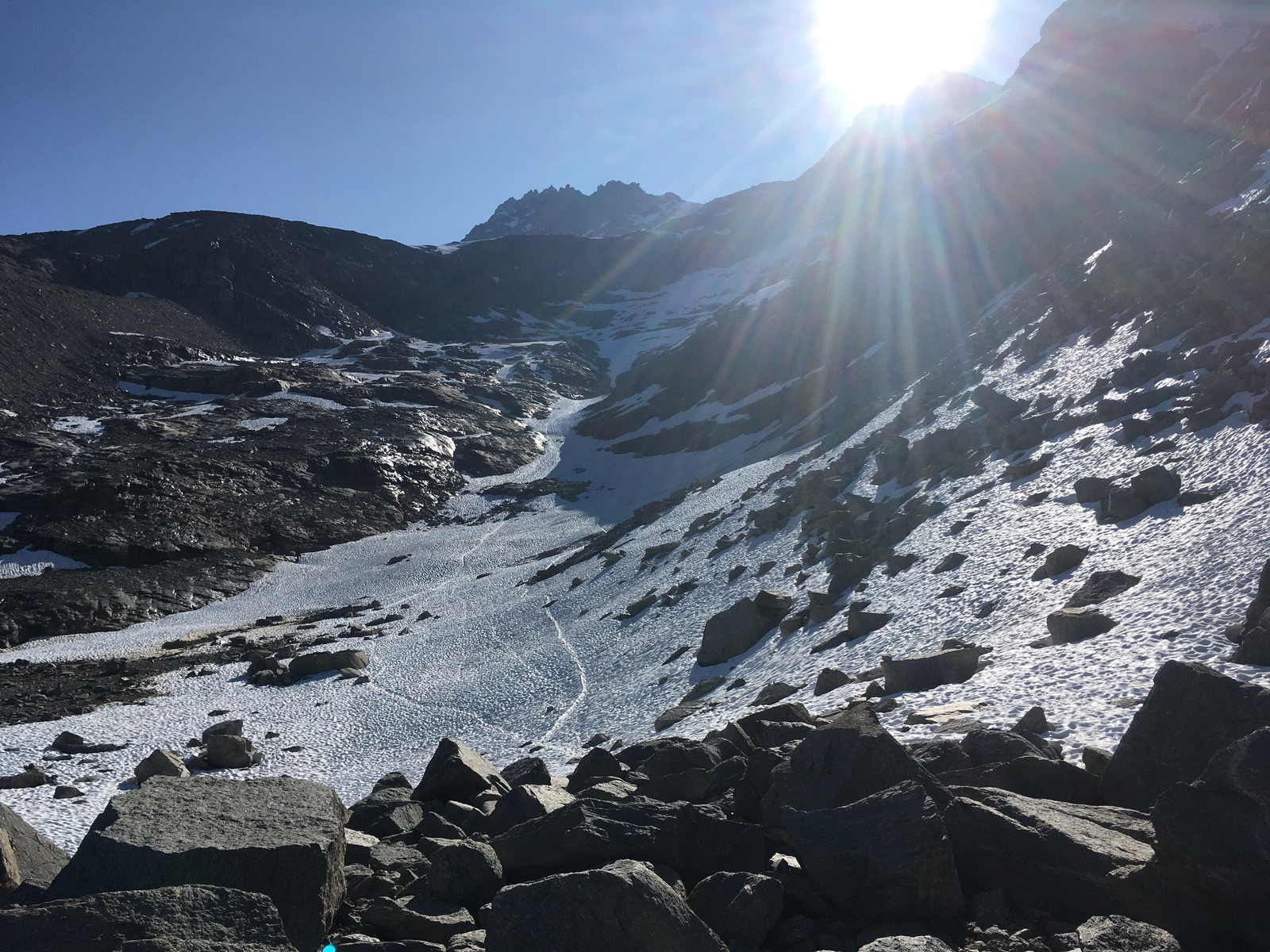 Am Brückentag (Freitag) konnte ich nach von Bayern aus sich wirklich ziehender Anfahrt am Vortag (für absolute Skitouren-Fanaten: Am Großen Sankt Bernhard-Pass liegen noch letzte Schneefelder - bei früherem Aufbruch wäre sich da vielleicht noch eine "Anfahrtstour" ausgegangen) den Gran Paradiso von Pont im Valsavarenche-Tal aus besteigen. Im Tourentipp-Archiv gibt es eine Routenbeschreibung, wobei die sich auf die "klassische" Skitourenzeit bezieht.