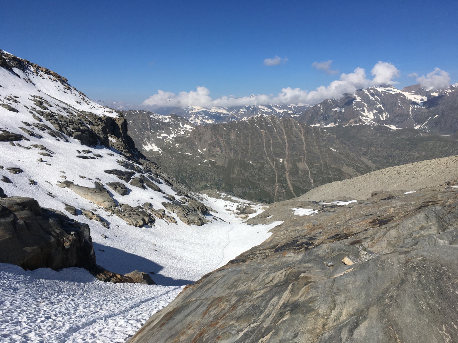 Die Abfahrt um 13 Uhr bot oben noch recht harten Schnee, der Mittelteil war recht gut und dann erwiesen sich die tiefen "Kacheln" des Sommerschnees als etwas mühsam. Aber natpürlich immer noch besser als zu Fuß. Auf dem letzten Schneeband ging es noch bis ca. 2.850 m hinunter. Aufgrund der Wetterprognose (Regen / Gewitter am Nachmittag) und der sichtbaren Quellungen habe ich auf eine Einkehr in der Hütte verzichtet und kann zu dieser mithin nichts sagen. Allerdings lockte mich der im Umkreis der Hütte massiv herumliegende Müll auch nicht gerade - keine Ahnung, warum sich die Hüttenwirte oder die zuständige CAI-Sektion nicht bemüßigt fühlen, etwas zu machen. Ganz so viel Müll faste meine kleine Mülltüte auch nicht ...