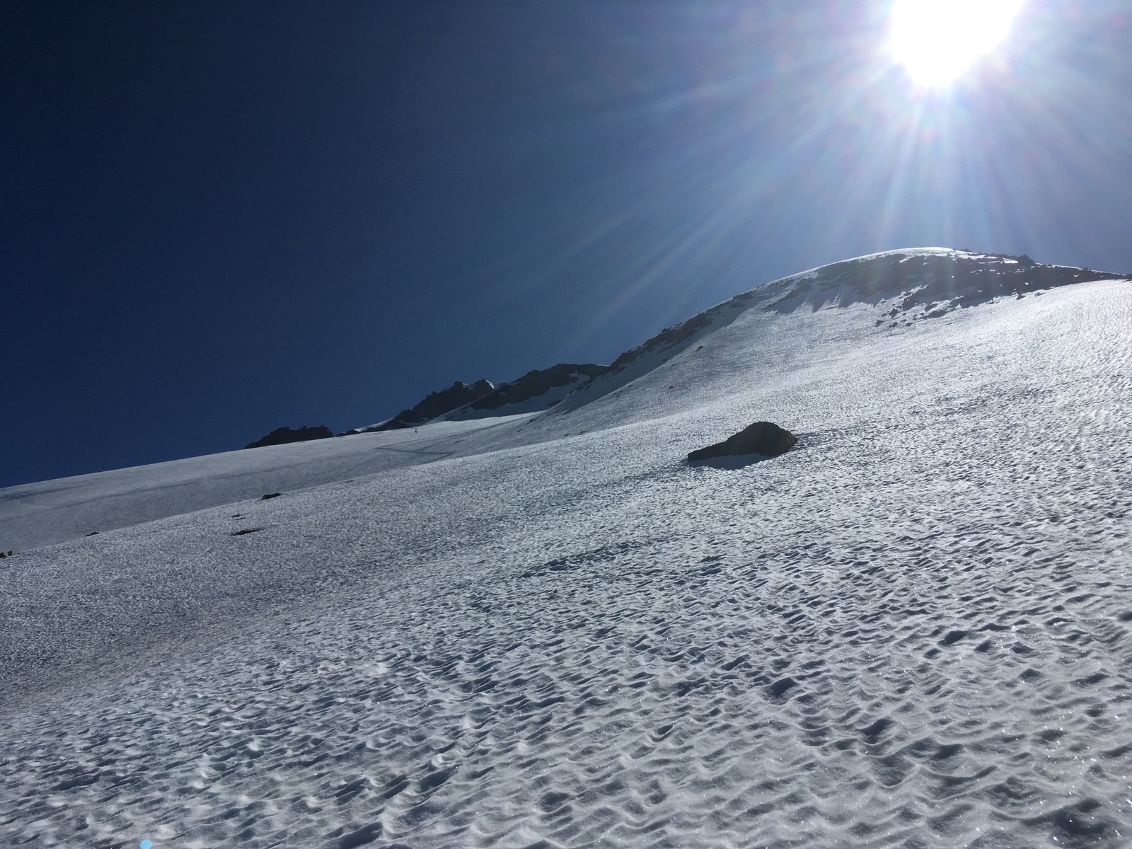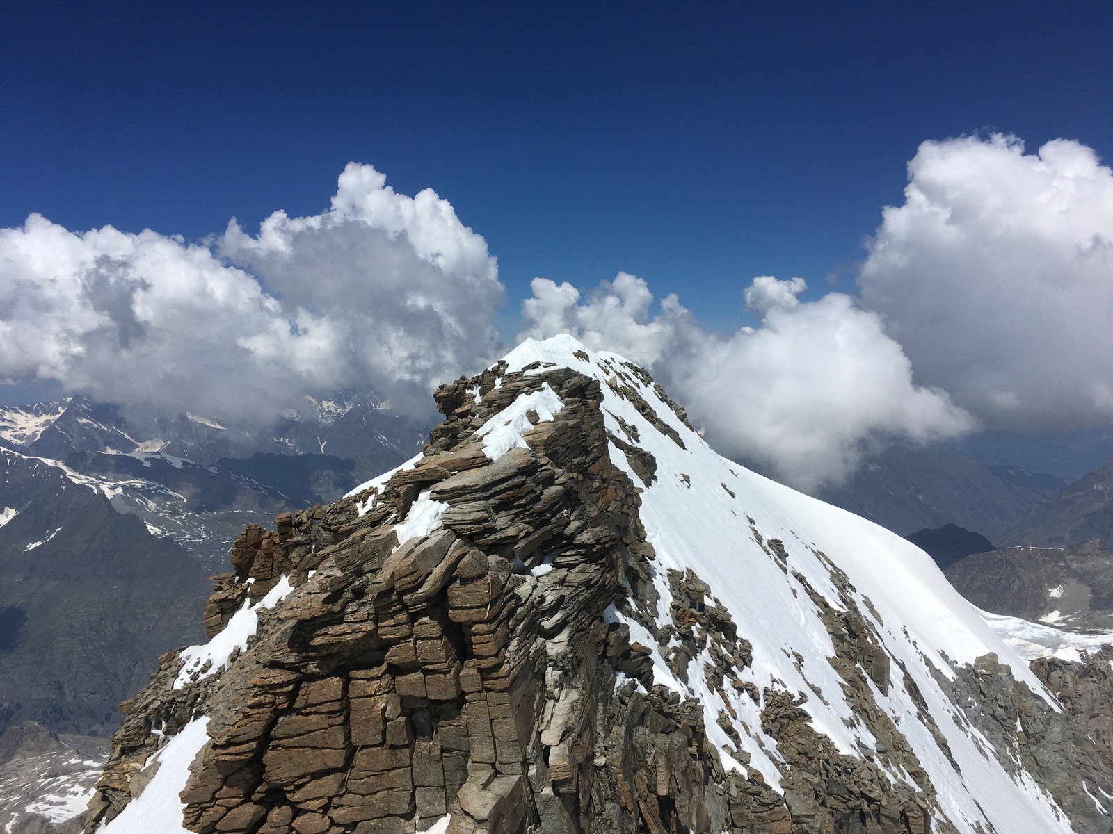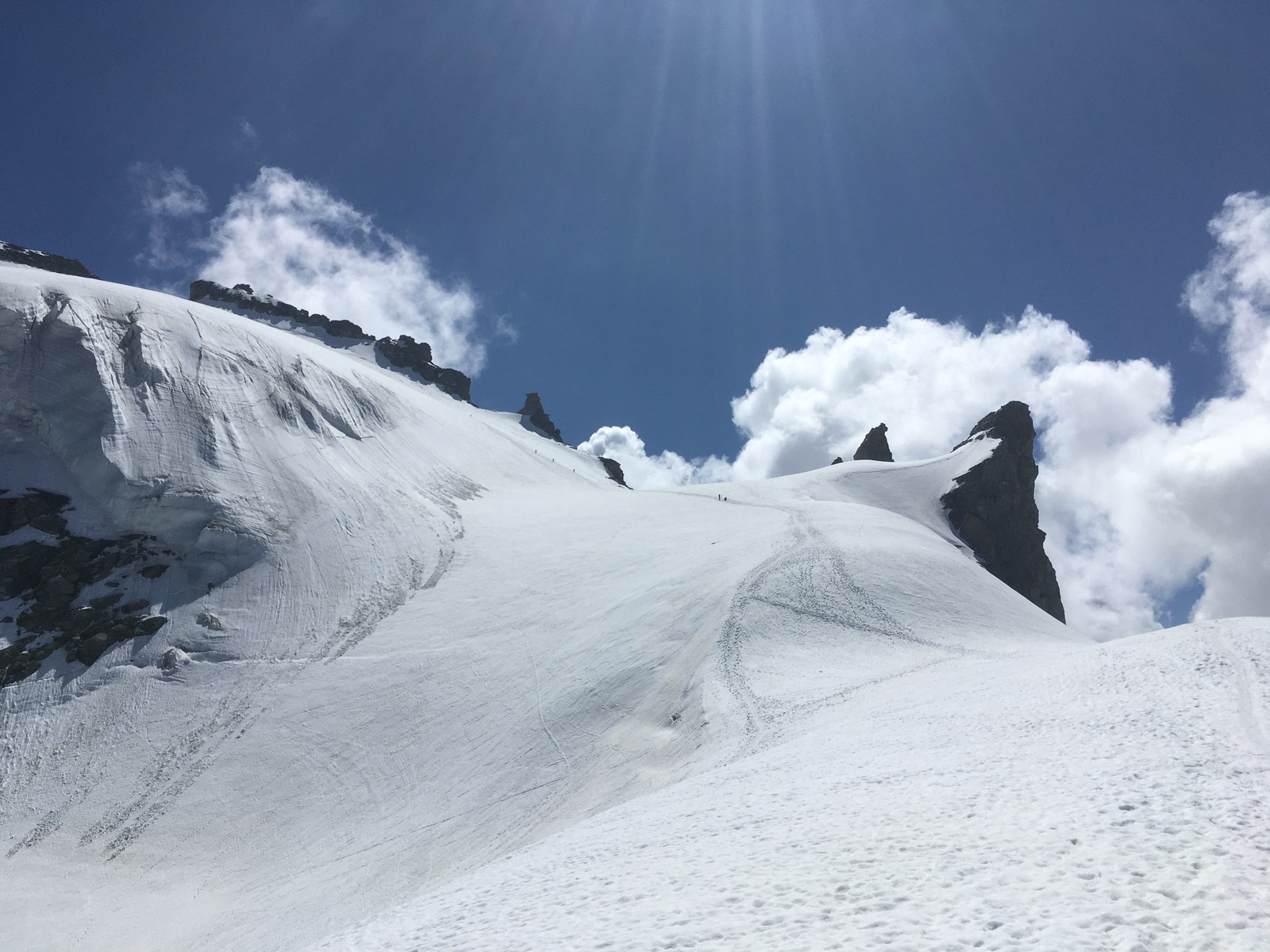 Etwas ausgesetzt ist der kurze Schnee-/Felsgrat zum höchsten Punkt, für Schwindelfreie aber kein Problem: