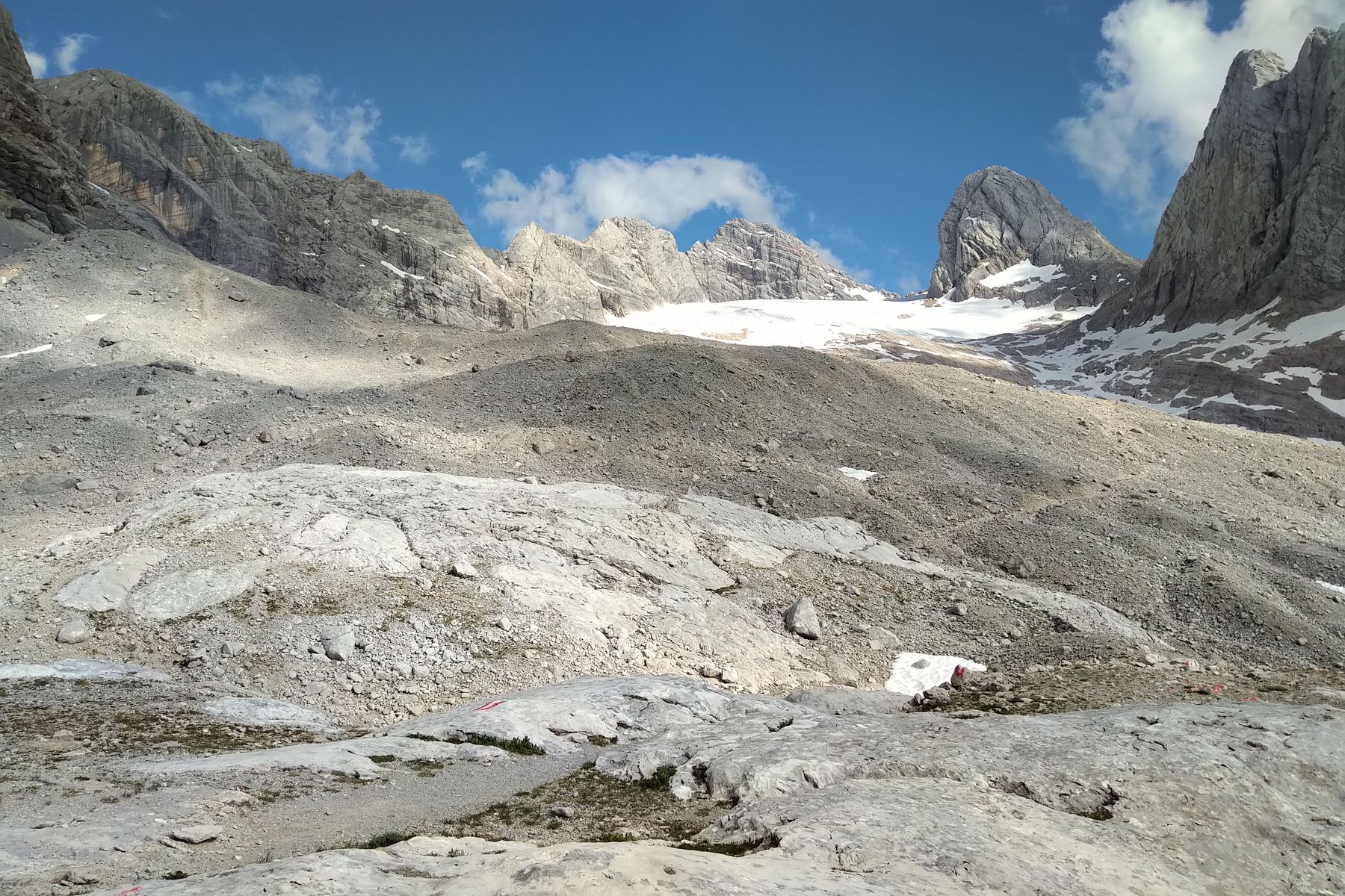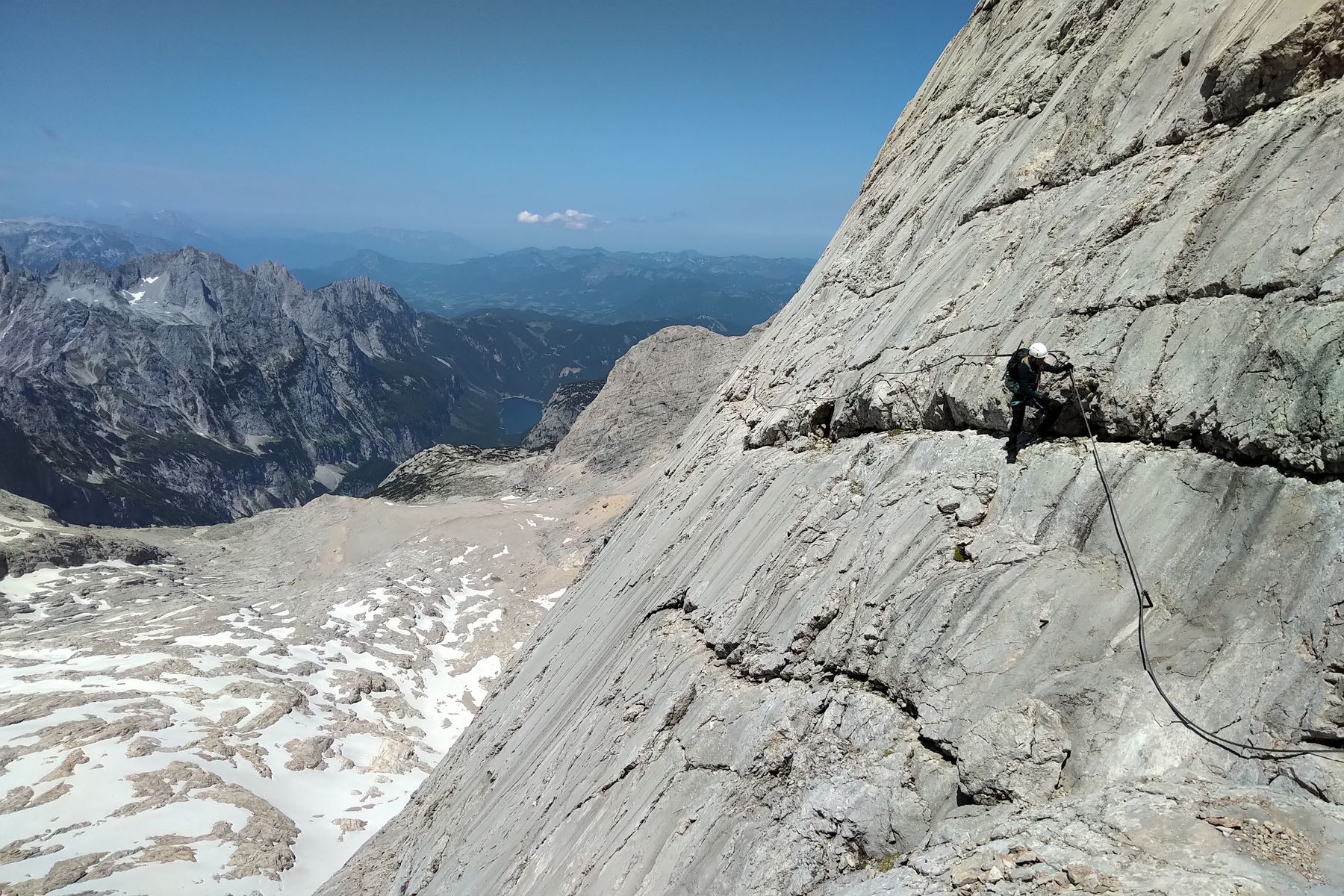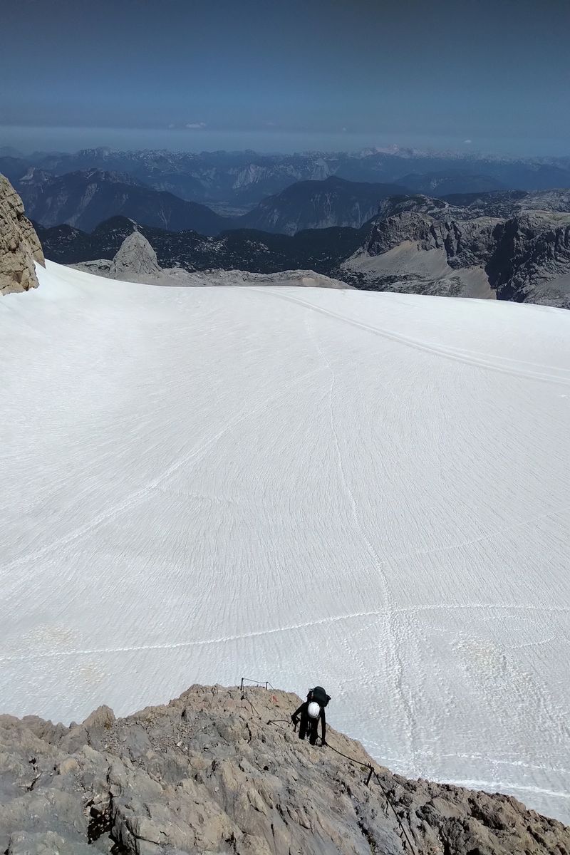 Nochmal aufsteigen zur Steinerscharte (einfacher Klettersteig), hinten der Hallstätter Gletscher Richtung Simonyhütte: