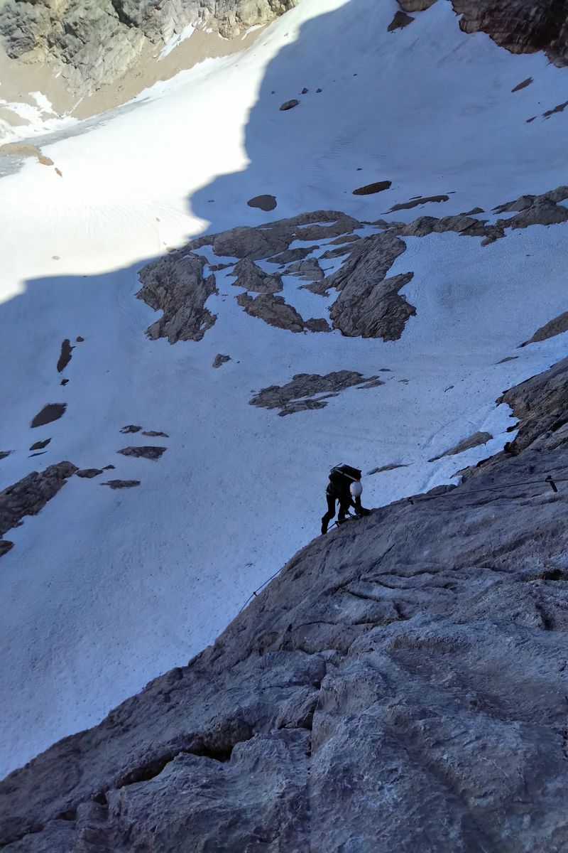 Im unteren Teil vom Amon-Klettersteig. Die Randkluft ist momentan noch gut zu überwinden: