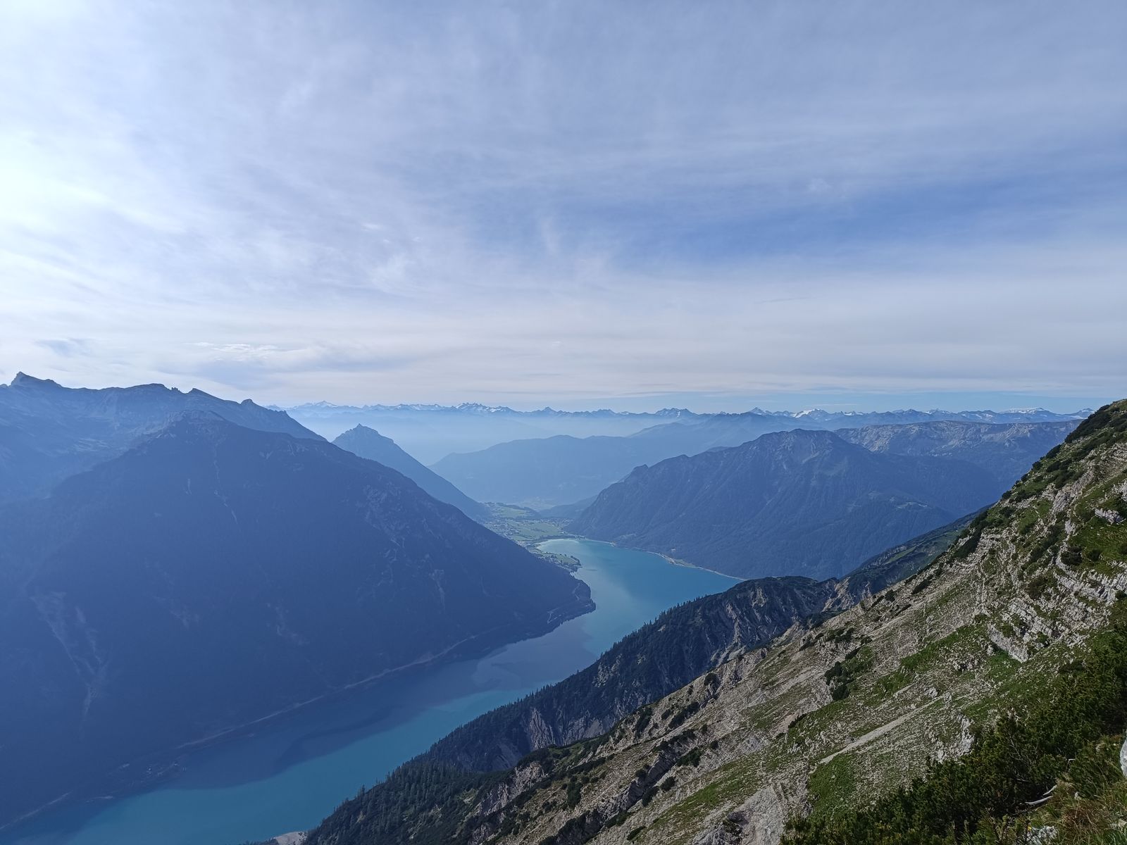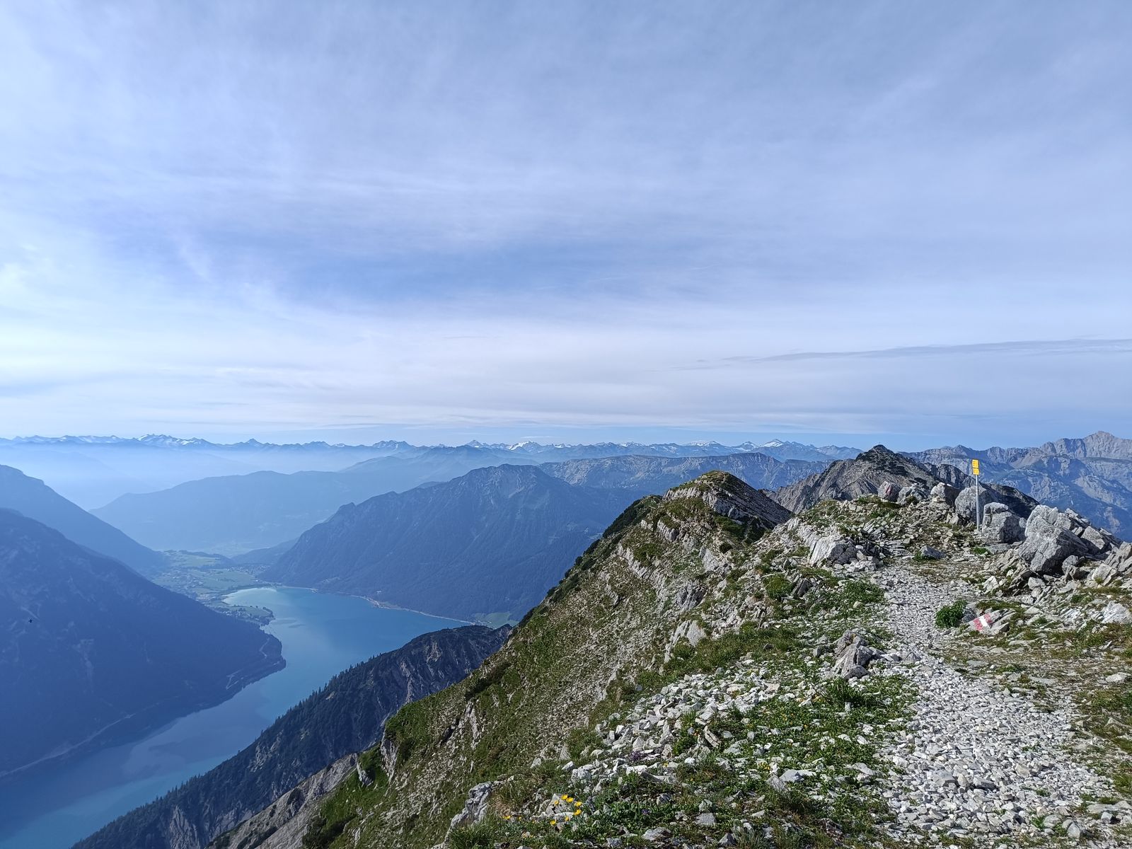 So, genug gescherzt... Ich bin heute sehr früh los, um noch vor der Arbeit die tolle Überschreitung hoch überm Achensee zu machen. Perfekte Bedingungen mit einem angenehmen Lüfterl am Kamm oben.