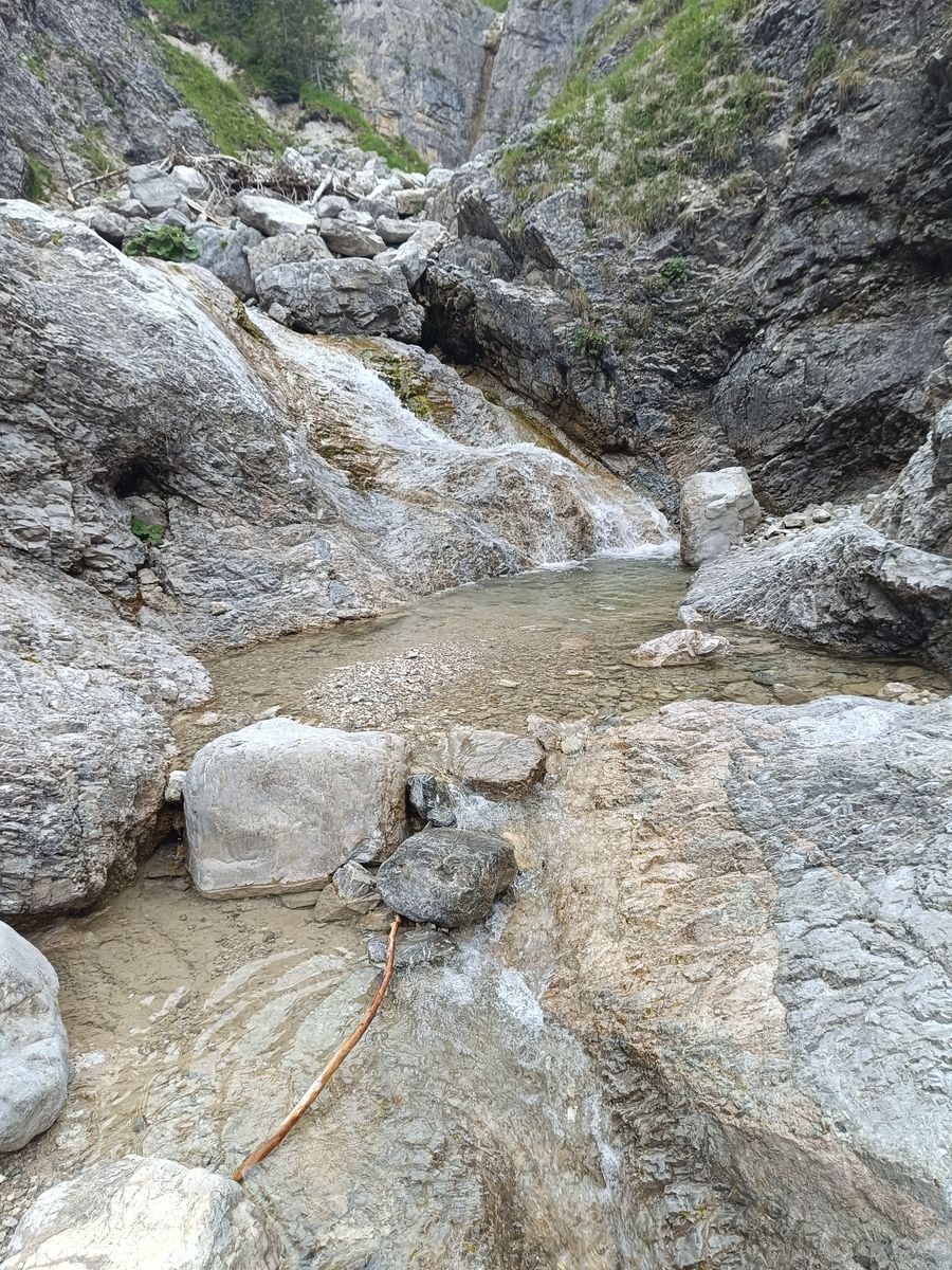 Die Tour mache ich sonst wegen der sonnigen Lage und der Lichtstimmungen meist im Herbst, aber heute hatte ich Lust drauf. Los war wie immer gar nichts - genau noch zwei andere hier unterwegs. Neben der Länge der Tour liegt das vor allem wohl auch daran, dass sie im Tal nicht ausgeschildert ist. Dennoch einfach zu finden: Vom PP einen knappen Kilometer an der Straße zurück, dann links auf eine Forststraße, über eine Brücke, dort links und hinauf zur Paindlalm (Abkürzen der Forststraße auf altem Karrenweg möglich). Nun auf der Forststraße weiter bis sie sich zu einem Steig verjüngt. Nach 10-15 Minuten zweigt der Steig zum Galgenstangenjoch rechts nach oben ab. Das Schild hier ist sehr ungünstig platziert, sodass man es von unten nicht sieht. Auf sehr angenehmem Weg (ein ehemaliger Reitsteig wie viele Wege im Gebiet) geht es über die Hütten der Grafenherberge zum Kamm hinauf und mit gewaltiger Aussicht immer an diesem entlang zur KKS. Jenseits hinab, zur Gumpenkarspitze und steil hinunter zum Sattel der "Jägersruh". Nun noch ein gutes Stück hinab Richtung Fereinalm und nun aufpassen: Der Paindlsteig, über den es zurückgeht, ist nicht angeschrieben und man kann den Abzweig leicht verpassen. Er zweigt genau bei einem alten, fast unlesbaren Blechschild 160 Grad nach links ab. Der Paindlsteig ist ebenfalls ein alter Reitsteig und führt durch die Flanken des KKK, wobei im unteren Teil mehrere schöne Bachgräben gequert werden. Mittlerweile ist er viel besser in Schuss als ich ihn in Erinnerung hatte. Das liegt in erster Linie paradoxerweise daran, dass die maroden alten Sicherheitsinstallationen in den Gräben fast komplett weg sind; früher waren sie eher im Weg als dass sie einem geholfen haben... Jetzt zeigt sich, dass sie eh überflüssig waren.