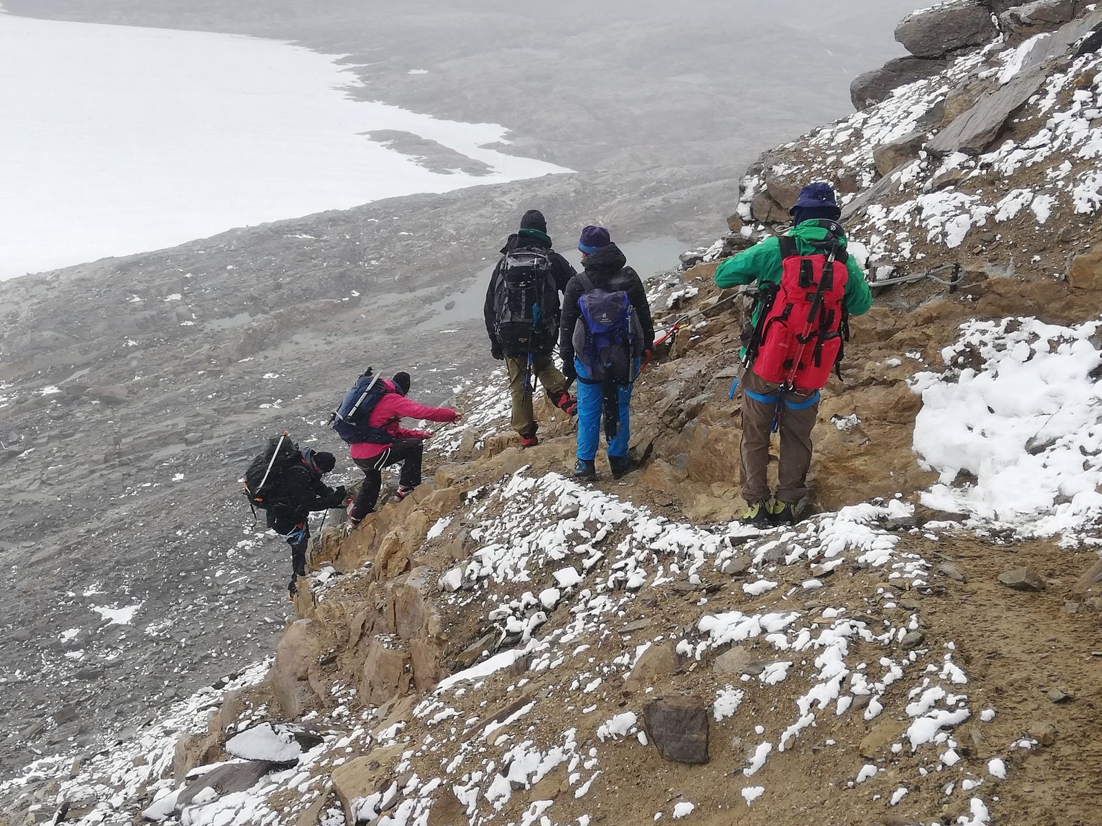 Abstieg am Donnerstag, nachdem in der Früh der Hauptkamm wieder in Wolken steckte. Abstieg durch den Klettersteig aufgrund ca. ein cm Neuschnee über Nacht leicht erschwert.