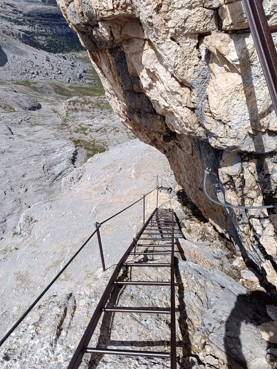 Anforderungen: Wie ich im Juni schon geschrieben habe, können die kleinen Klettersteige an den Fanes-Wasserfällen (ein Naturwunder sondergleichen) von Geübten ohne Ausrüstung gegangen werden. Das Gleiche gilt für den Furcia-Rossa-Klettersteig. Da sind nur kurze Stellen versichert und die mit C bewertete "Schlüsselstelle" ist ein Witz: Völlig harmlose Bügelkletterei (5 Meter senkrecht) und die erste Sicherung, die einen Sturz hemmen würde, ist auch bei 5 Metern - man kugelt also mit oder ohne KS-Set 5 Meter runter... Kein Absturzgelände unterhalb. Und auch die ausgesetzten, tollen Leiterpassagen im Abstieg von der FR III sind nicht wild, weil auf beiden Seiten ein Stahlseil-Geländer angebracht ist. Bei der Länge der Tour kann man sich als versierter Bergsteiger das Zusatzgewicht der KS-Ausrüstung gut sparen.