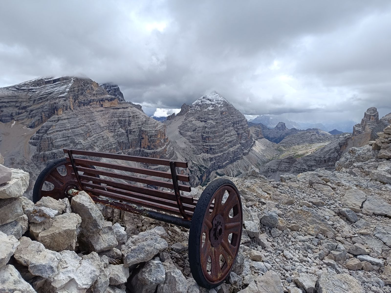 8: Originelle Gipfelbank mit leider unschönem historischen Hintergrund an der Furcia Rossa III mit Tofana-Blick.