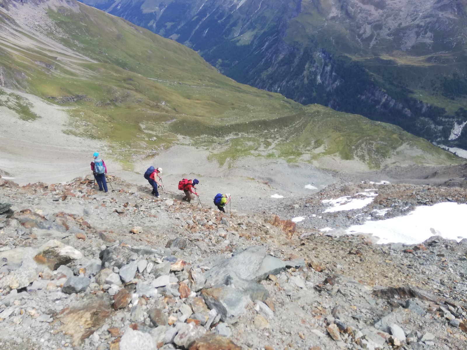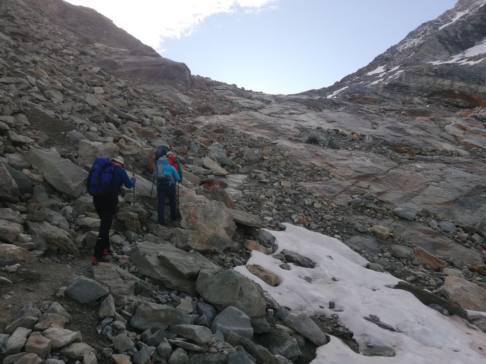 Abstieg über den Nordgrat zurück zum Col. (es ist auch möglich, den Gipfel nach Süden zu überschreiten und am Rand des Moirygletschers zur Hütte zurück zu kehren; hierfür ist aber Gletscherausrüstung notwendig). Entweder nun auf dem Aufstiegsweg zurück oder - wie wir - Abstieg auf die Ostseite in das große Kar "La Le". Da geht es die ersten ca. 50 Hm durch sehr steiles Gelände (gut 40 Grad) auf schmalem Steig, aber mit Ketten, hinab, dann wird das Gelände flacher. Am Dienstag hier keine Schneeberührung mehr (bei Altschnee ist dieser Abschnitt heikel und erfordert mindestens (!) Grödel).