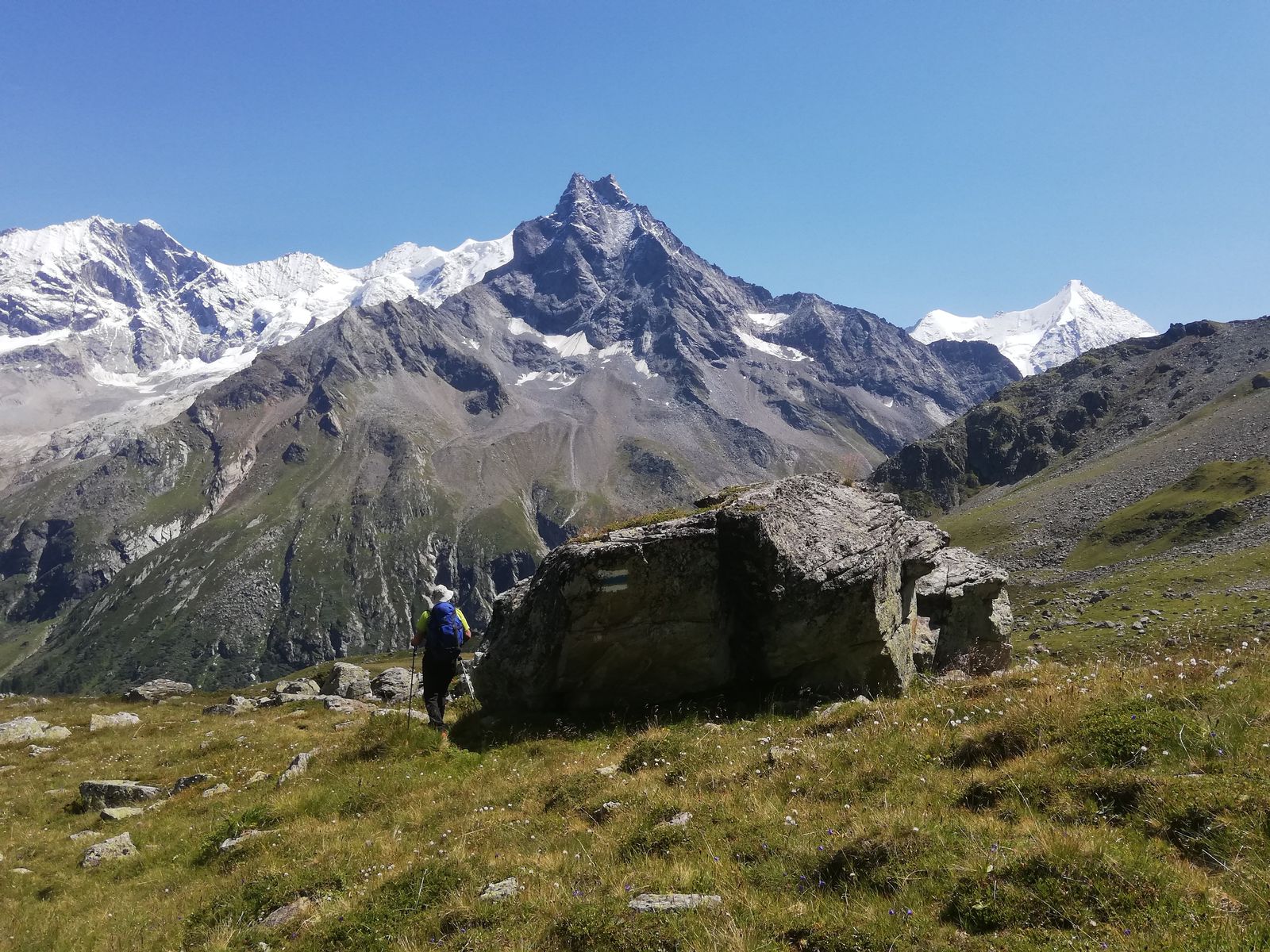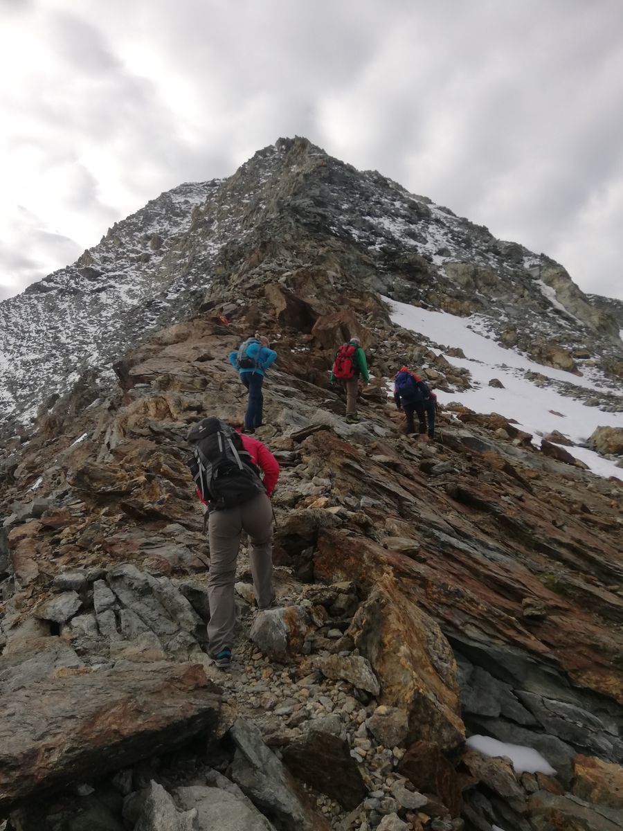 Am nächsten Morgen auf einem Steig mit blau-weißen Markierungen durch viel Blockwerk auf den Col du Pigne, 3135m und über den Nordgrat zum Gipfel. Durchwegs einfache Blockkletterei, max. I+ (eine Stelle), stellenweise etwas ausgesetzt.