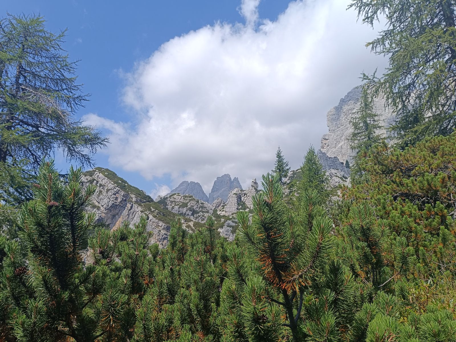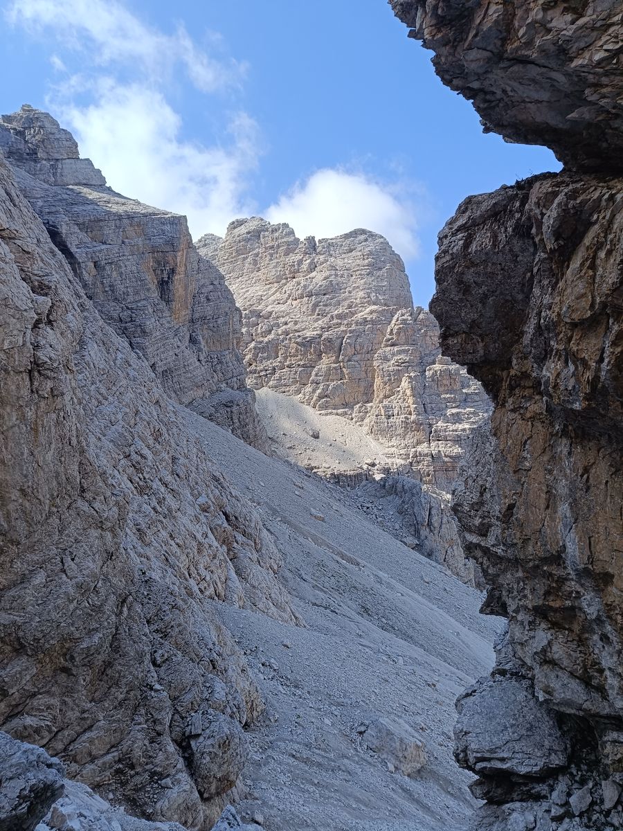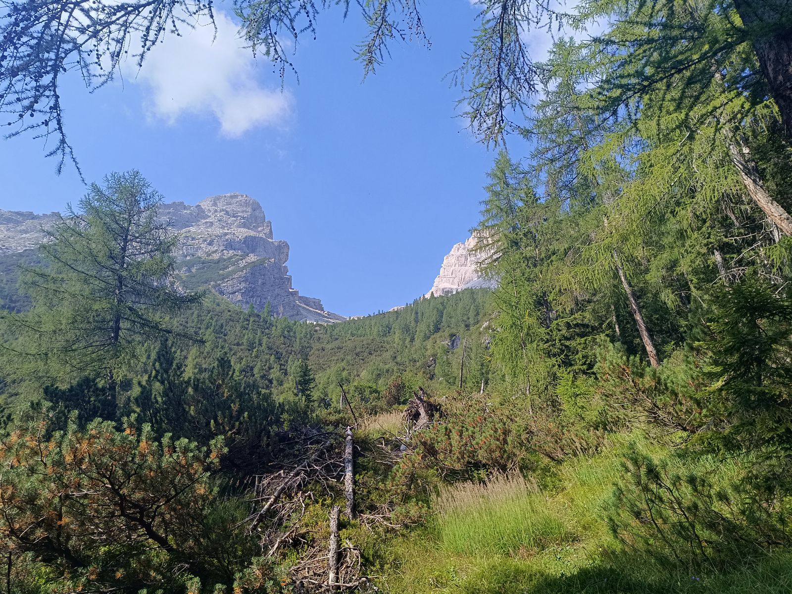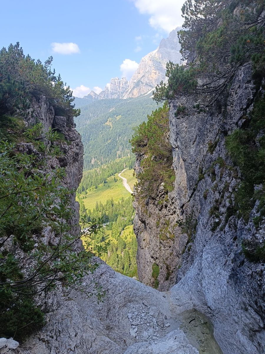 Route: Vom PP zum Col de Michiel und dort dem Steig 536 folgen, bis links der Anstieg zur Porta del Tamer abzweigt. Von hier könnte man noch den Tamer Grande besteigen (sehr anspruchsvoll und hohe Steinschlaggefahr), aber angesichts der Länge der Tour und weil ich den Tamer schon vor ein paar Jahren vom Passo Duran (Bericht vorhanden) aus bestiegen habe, habe ich das heute sein lassen. Nun hinab durch das sehr ruppige Van di Caleda. Der zweite Teil der Tour ist im Grunde einfach der Westliche Tamer-Höhenweg, der normalerweise vom Passo Duran startet (gehört auch zum Dolomiten-Höhenweg 1). Das ist aber ein ziemlicher Umweg und es gibt eine sehr steile Abkürzung: Man folgt dabei einem Schild Richtung Ponte Caleda und erreicht die Passstraße bei knapp unter 1500 Metern. Dieser "Steig" ist wirklich abenteuerlich und hält etliche IIer-Kletterstellen bereit, ohne aber wirklich ausgesetzt zu sein (T5). Nun weiter um die ganze westliche Tamer-Gruppe herum in die Forcella Moschesin und jenseits über die Pramper-Alm zum PP zurück. Die erste Stunde des Höhenwegs ist ein bisserl fad, aber dann wird's landschaftlich wieder erstklassig mit sehr urigen Wäldern.