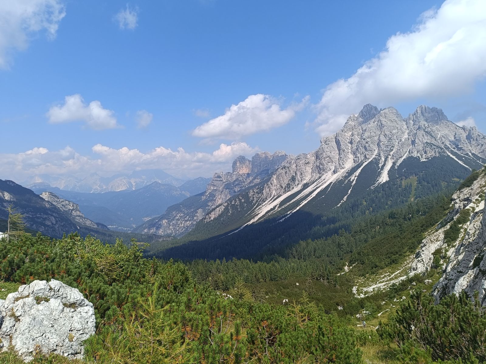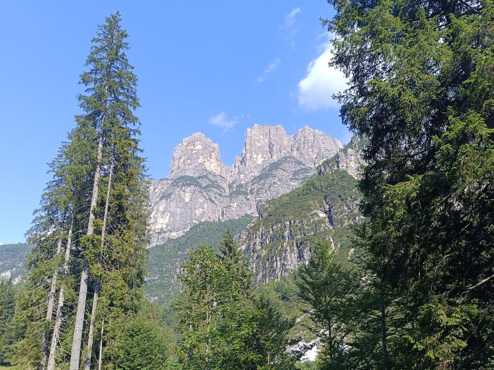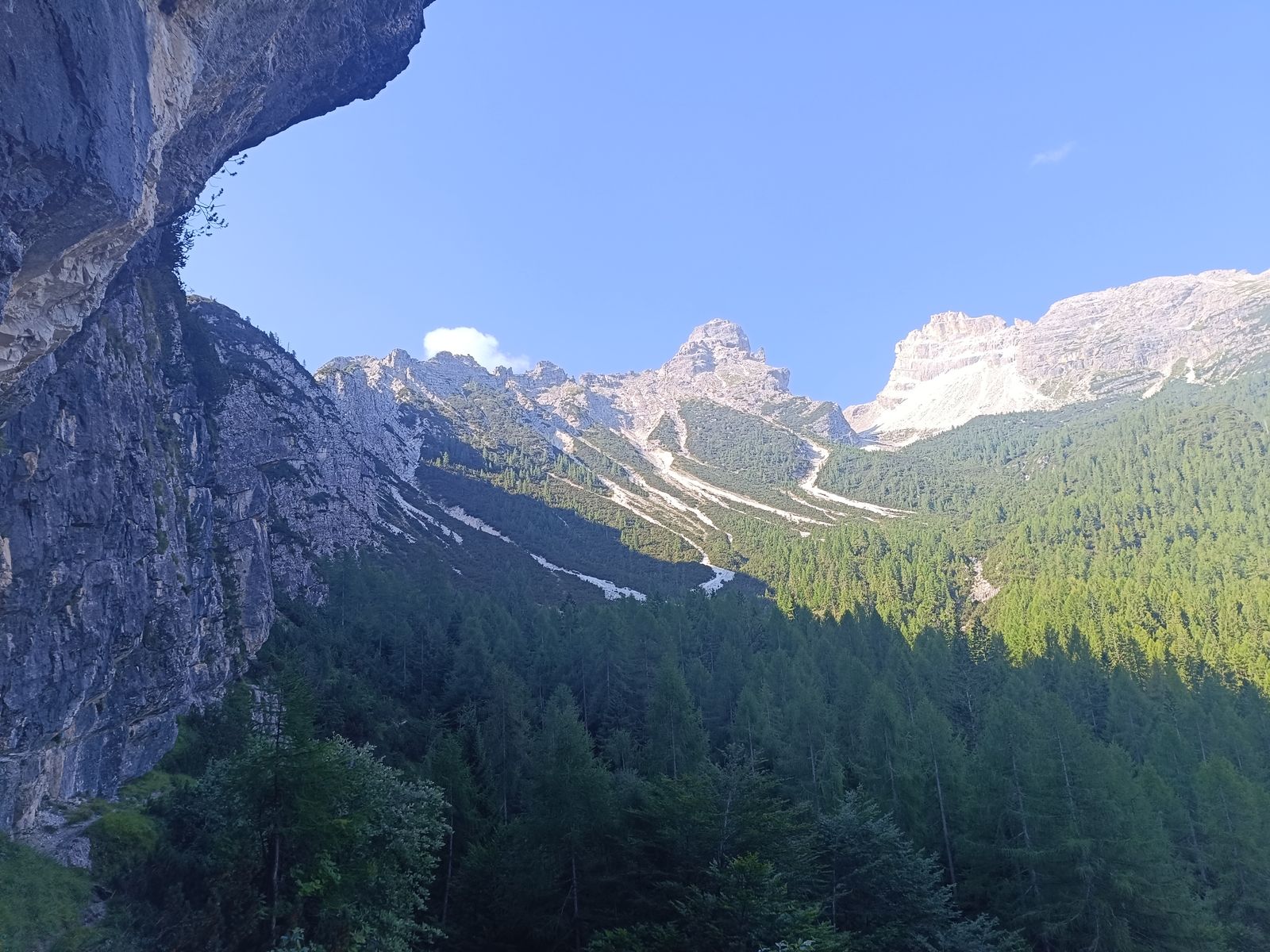 Route: Vom PP zum Col de Michiel und dort dem Steig 536 folgen, bis links der Anstieg zur Porta del Tamer abzweigt. Von hier könnte man noch den Tamer Grande besteigen (sehr anspruchsvoll und hohe Steinschlaggefahr), aber angesichts der Länge der Tour und weil ich den Tamer schon vor ein paar Jahren vom Passo Duran (Bericht vorhanden) aus bestiegen habe, habe ich das heute sein lassen. Nun hinab durch das sehr ruppige Van di Caleda. Der zweite Teil der Tour ist im Grunde einfach der Westliche Tamer-Höhenweg, der normalerweise vom Passo Duran startet (gehört auch zum Dolomiten-Höhenweg 1). Das ist aber ein ziemlicher Umweg und es gibt eine sehr steile Abkürzung: Man folgt dabei einem Schild Richtung Ponte Caleda und erreicht die Passstraße bei knapp unter 1500 Metern. Dieser "Steig" ist wirklich abenteuerlich und hält etliche IIer-Kletterstellen bereit, ohne aber wirklich ausgesetzt zu sein (T5). Nun weiter um die ganze westliche Tamer-Gruppe herum in die Forcella Moschesin und jenseits über die Pramper-Alm zum PP zurück. Die erste Stunde des Höhenwegs ist ein bisserl fad, aber dann wird's landschaftlich wieder erstklassig mit sehr urigen Wäldern.