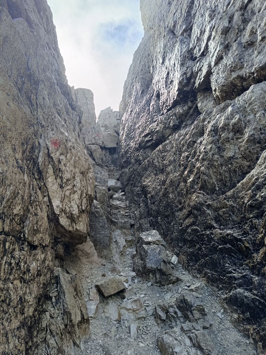 Route: Vom Passo Cibiana zur Forcella Ciavazoles und hier links auf gutem, unverständlicher Weise nicht ausgeschildertem Steig zur Westschulter des Sfornioi (2200m), wo auch ein Kreuz steht. Bis hier T3, aber danach wird es rasch alpin und es folgen einige Kletterstellen im I. Grad und die Schlüsselstelle, eine nasse Rinne (fast ein Kamin), ist mit II zu bewerten (gesamt T5). Alles aber kein Hexenwerk, da sich die Ausgesetztheit in Grenzen hält. Die Route ist ab der Westschulter mit roten Punkten und Steinmännern super markiert, verlangt aber dennoch aufgrund einiger abrupter Richtungswechsel Aufmerksamkeit - viele falsche Steigspuren zeugen hier von häufigen Verhauern. Vorhin hab ich einen Bericht aus 2020 zum Sfornioi gelesen, wo von grausligem Bröselzeugs auf der Route zu lesen war (Alpengeist). Entweder der Autor hat sich ordentlich verstiegen oder es wurde seitdem "sauber gemacht". Ich tippe fast auf Zweiteres, denn ich habe einen Bergführer mit Kunden (sonst niemanden) getroffen und könnte mir durchaus vorstellen, dass hier jemand sich eine schöne Route für einfach verdientes Geld hergerichtet hat. Abstieg wie Aufstieg.
