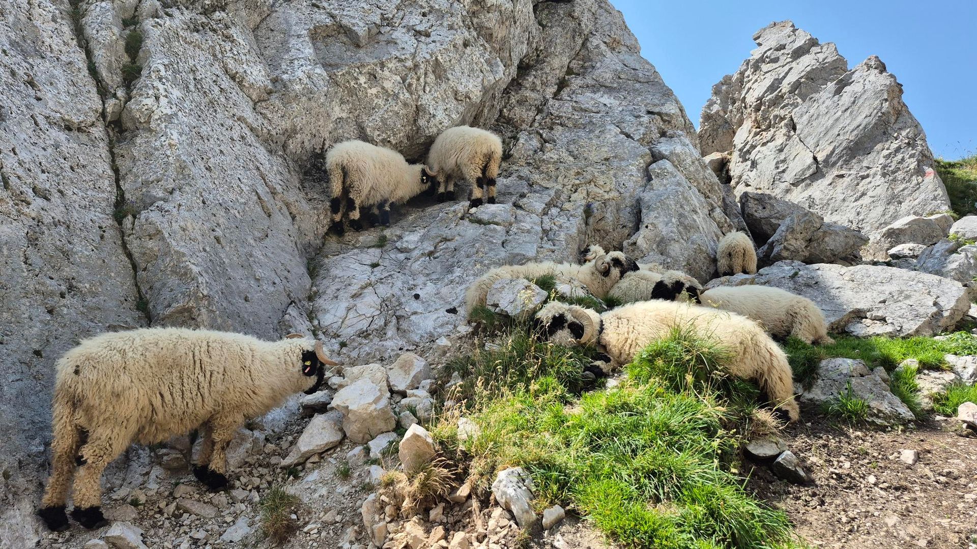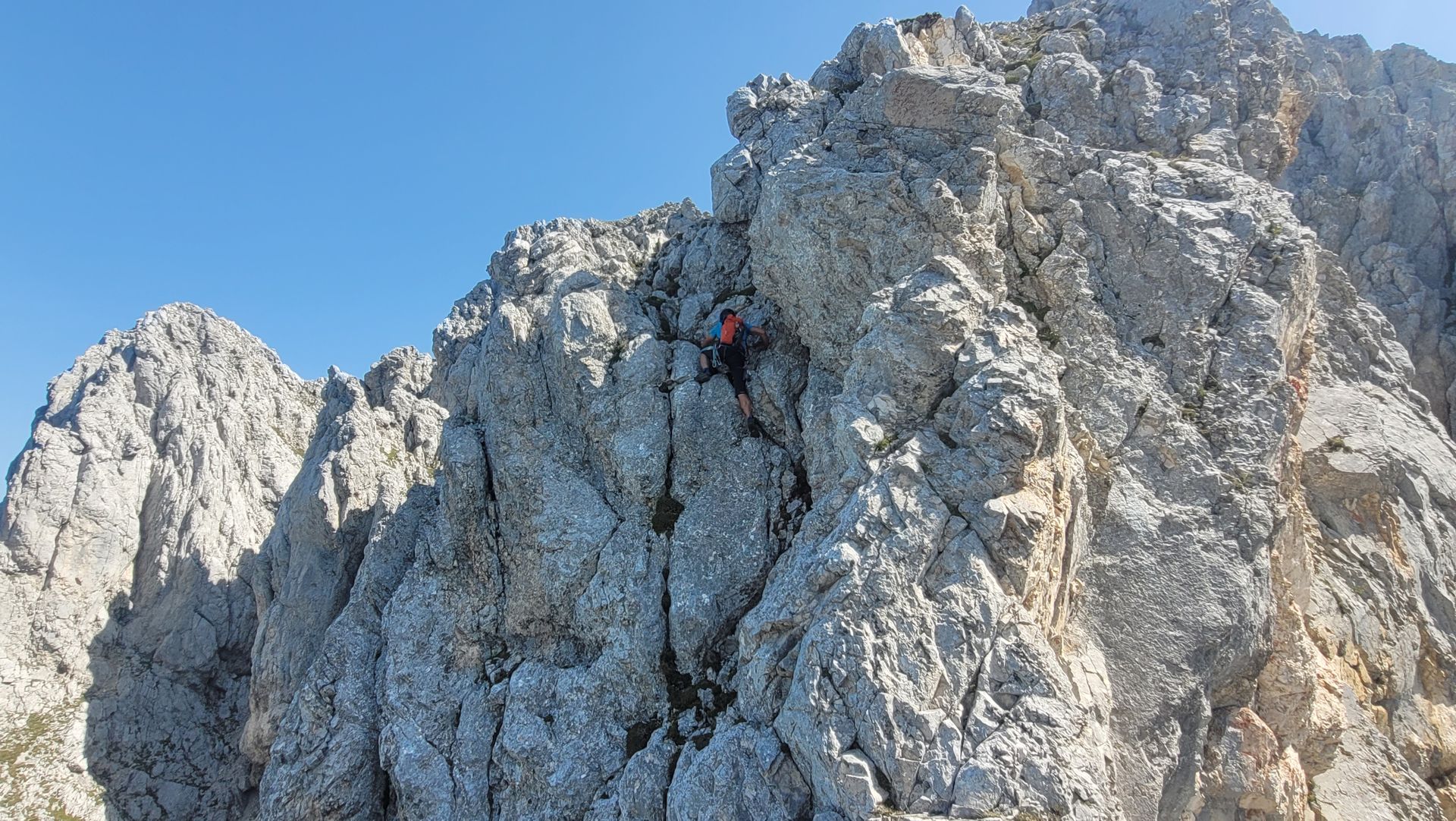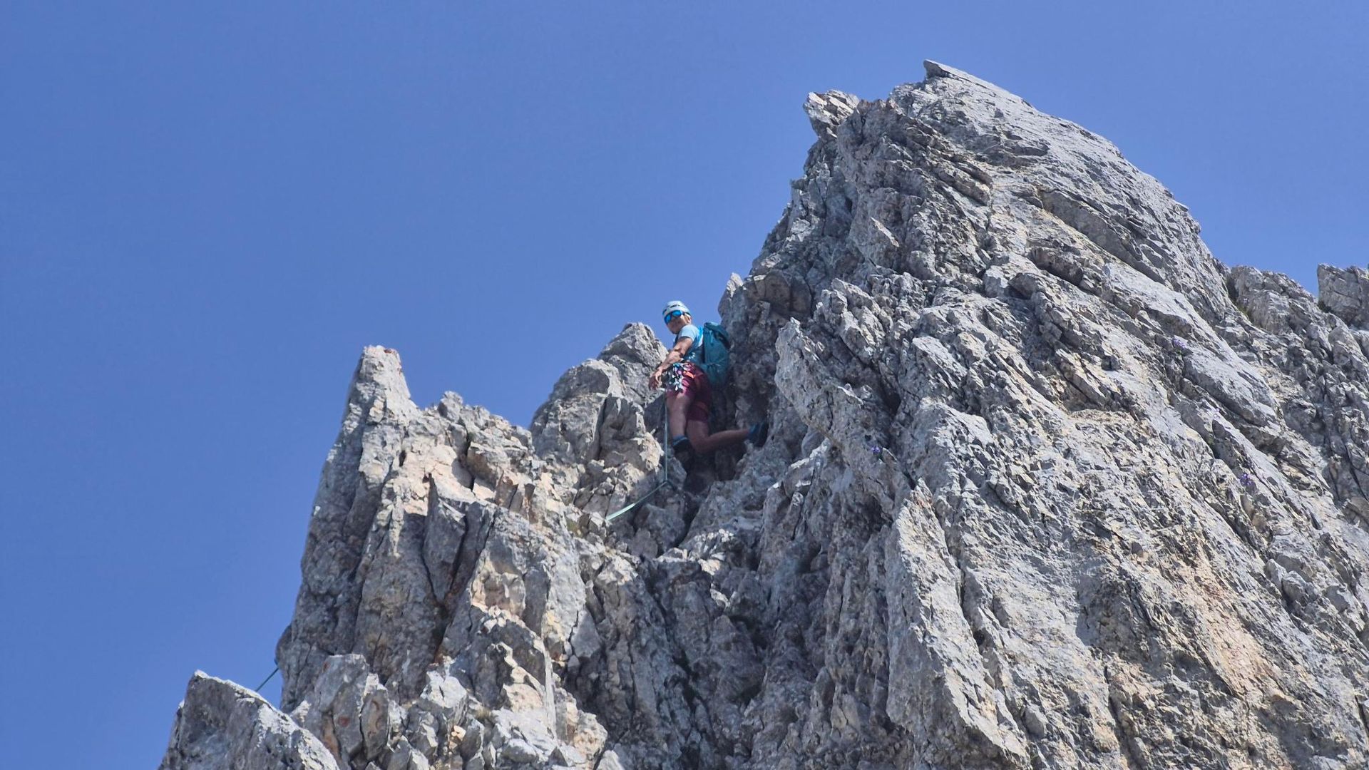 Abstieg kurz Drahtseil versichert, I-II. Die glatte II- er Verschneidung wurde mit Klammern entschärft.
