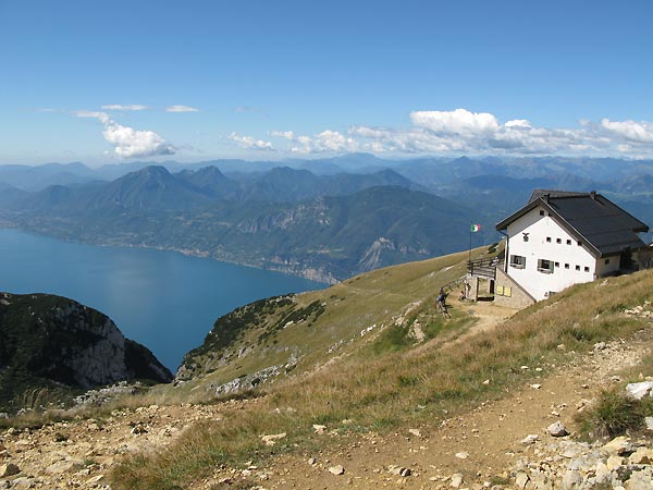 Tourenverhältnisse: Nachdem das Wetter die letzten Tage auch am Gardasee wechselhaft und vor allem sehr gewitrig war, zeigte sich am Freitag wieder die Sonne. Es hatte etwas abgekühlt und die Luft war klar und frisch, die Fernsicht entsprechend gut. Auf 1200 m hatte es nur 12 Grad und es wehte ein starker Wind am Ausgangspunkt. Die Wegverhältnisse waren trotz der massiven Niederschläge der letzten Tag gut und trocken. Sehr schöne Tour mit einer Hütte direkt am Gipfel. Die Hütte ist ab 15. September jedoch nur noch sproadisch an schönen Wochenenden geöffnet.