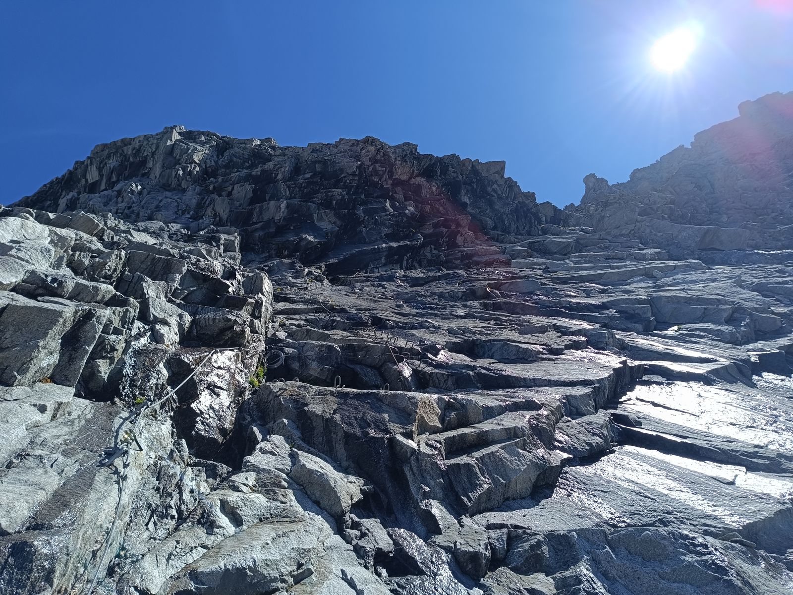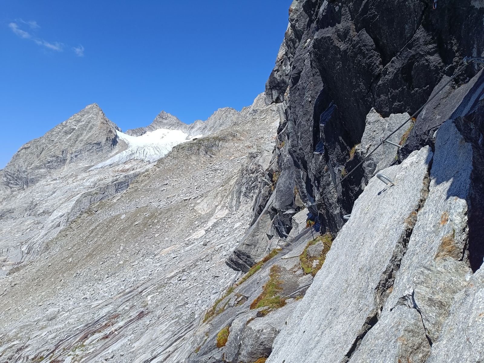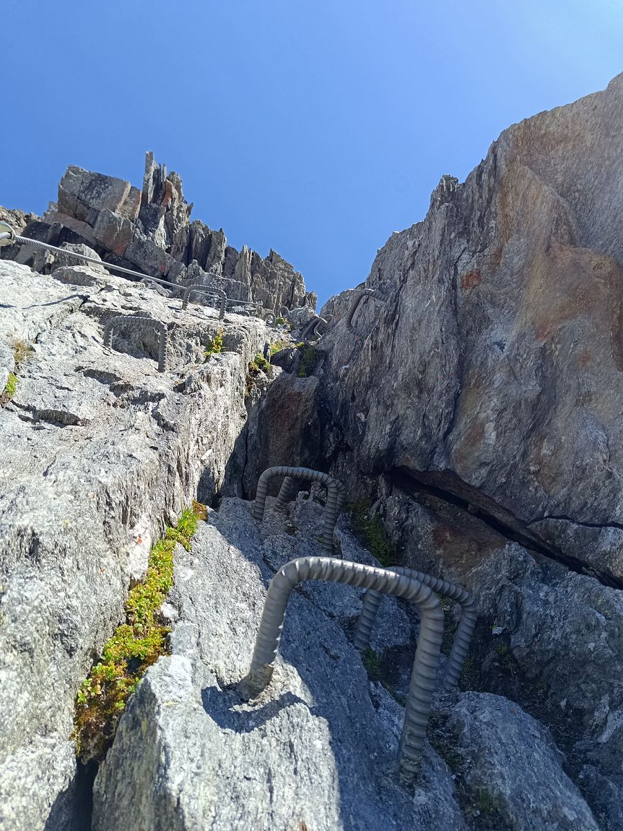Hinweis zum Klettersteig: Am besten das Set schon ein paar Minuten vor dem eigentlichen Startpunkt anlegen, da dieser offensichtlich steinschlaggefährdet ist. Das sieht man vor allem auch daran, dass die massiven Krampen auf den ersten 15-20 Metern fast alle kaputt sind. Und das ist nicht die Schuld von Knödel-Karlchen oder Bernd dem Bierbauch... Trotz der geringen technischen Schwierigkeiten sollte man bei diesem KS den sehr alpinen Charakter berücksichtigen - die Richterspitze ist auf dieser Route keine Tour für "Anfänger".