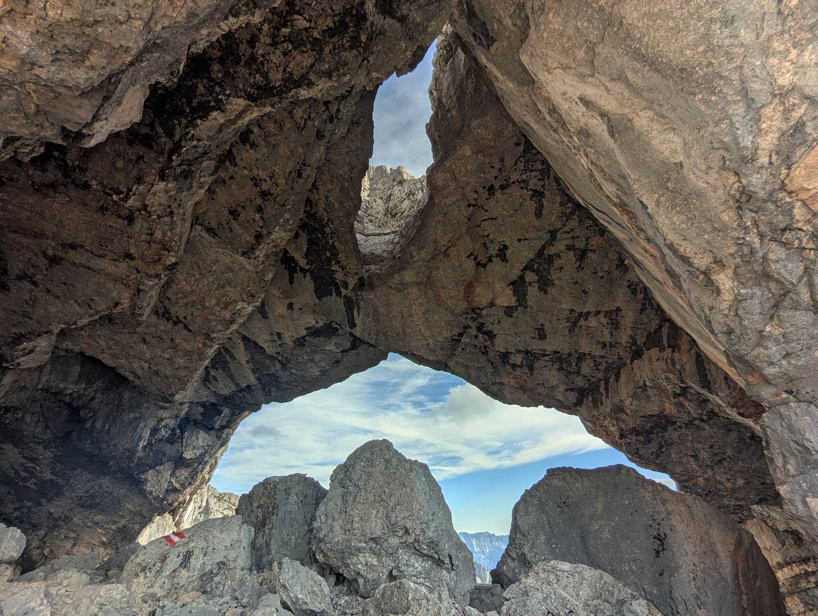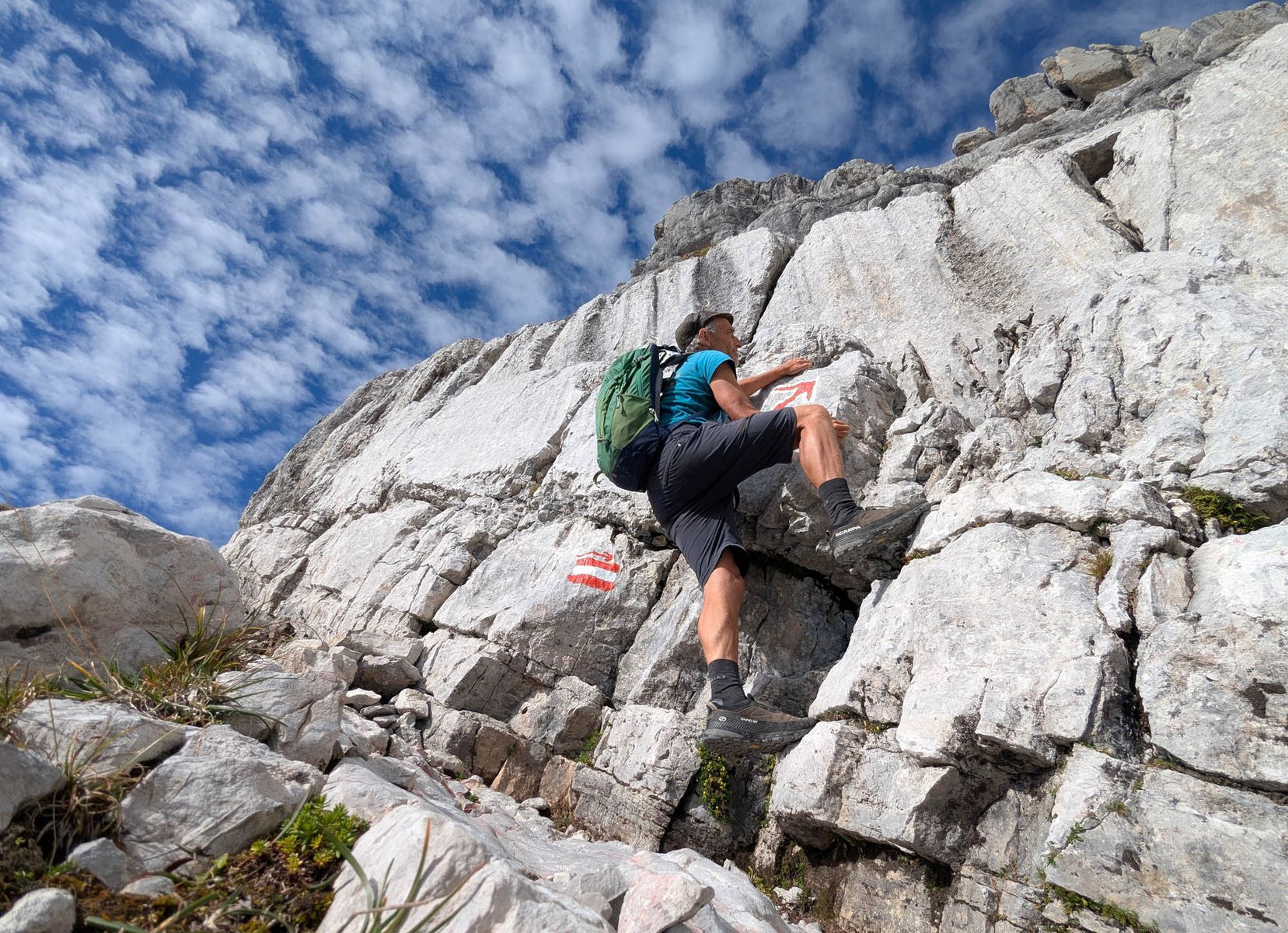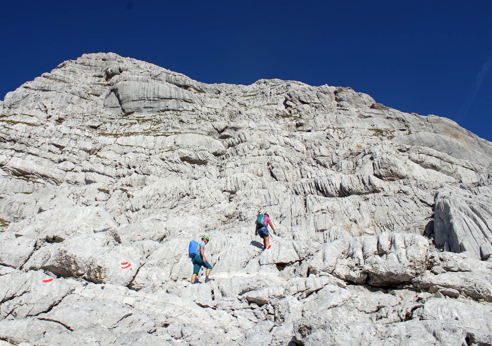 Schon vom Startpunkt aus baut sich die 1300 Meter hohe Südostwand des gewaltigen Kalkmassivs vor einem auf. Auf dem Weg zum Gipfel durchwandert man das grandiose Melkerloch, kommt an versteinerten Megalodonten vorbei und darf auch hier und da mal kräftig an den Fels langen. Seilsicherungen gibt es am Südanstieg zum Glück nämlich nicht.