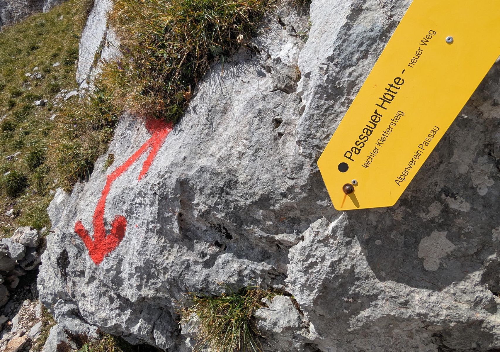 Beim Abstieg über die Kuchelnieder Sattel ist zu beachten: Wegen Steinschlaggefahr ist der alte Abstieg vom Sattel nicht mehr möglich. Es wurde ein neuer Klettersteig (B) angelegt.