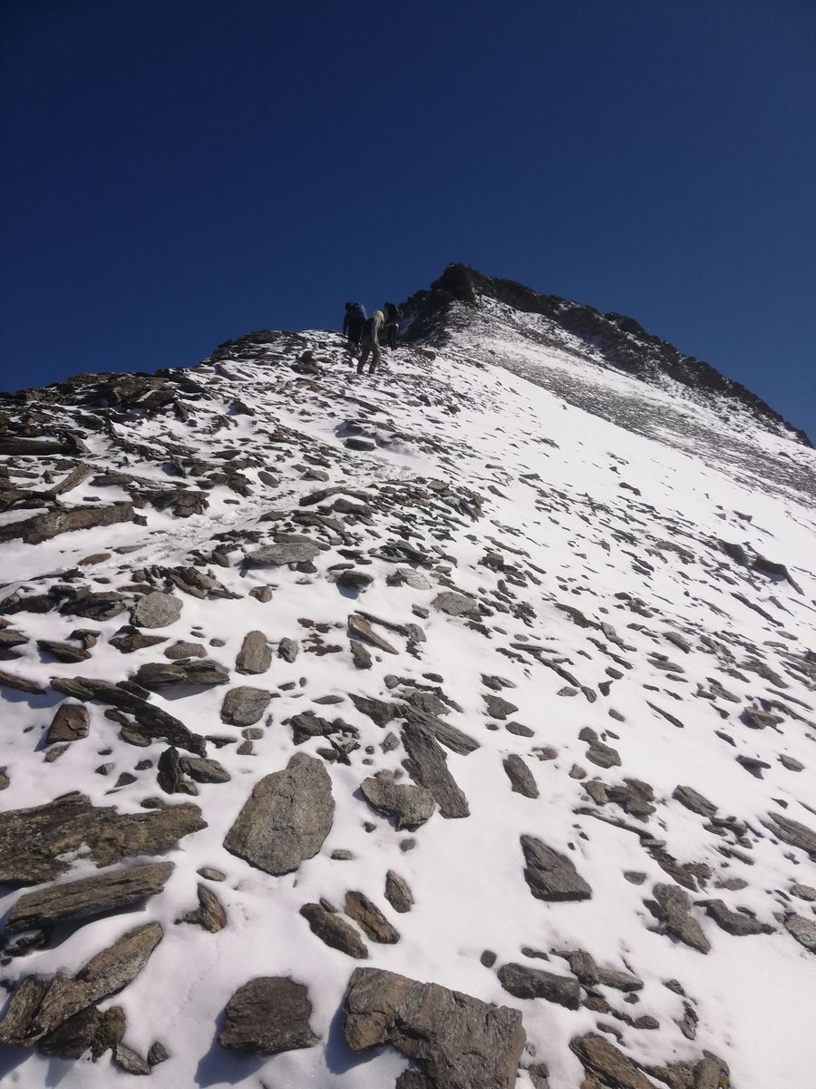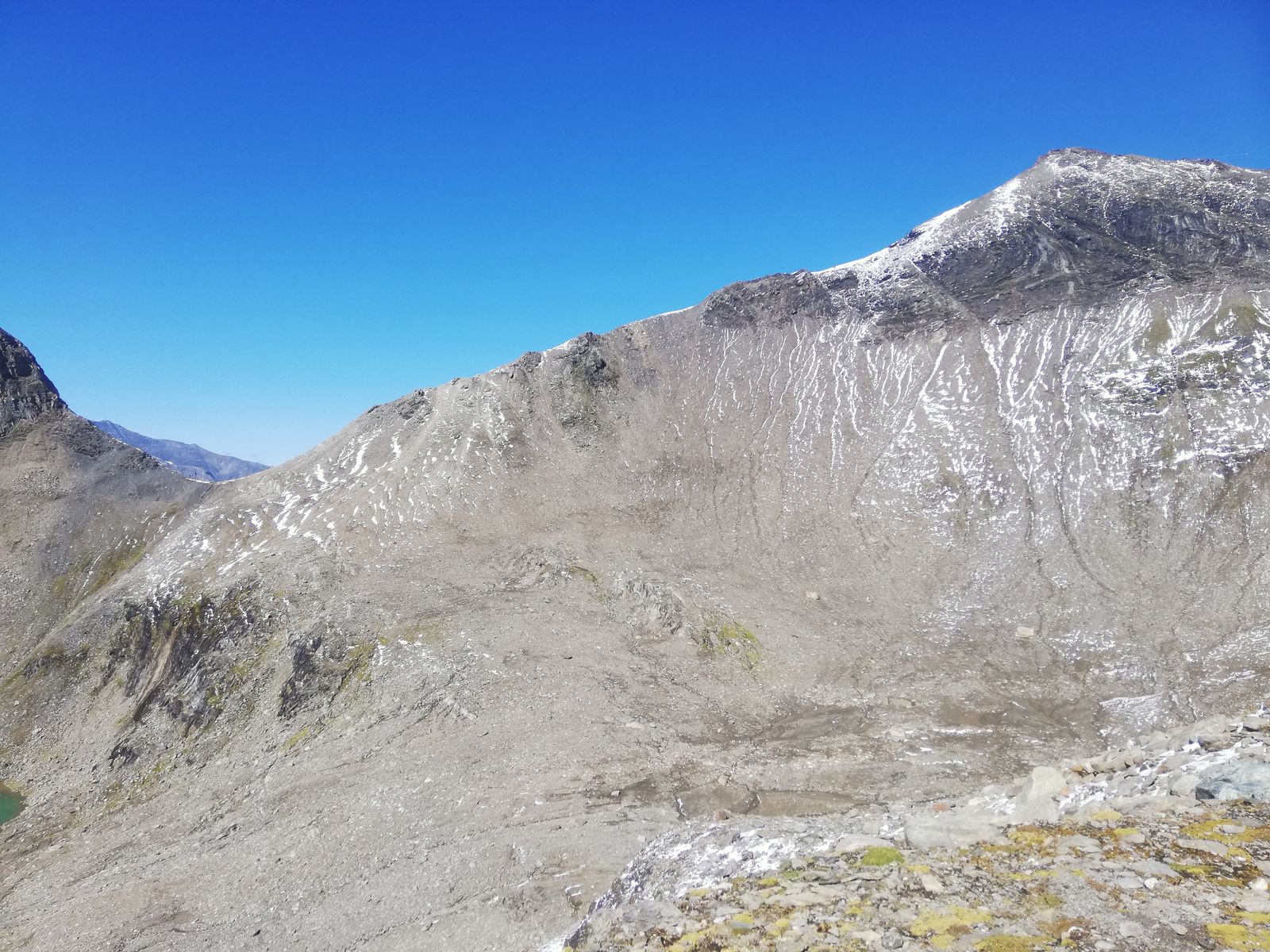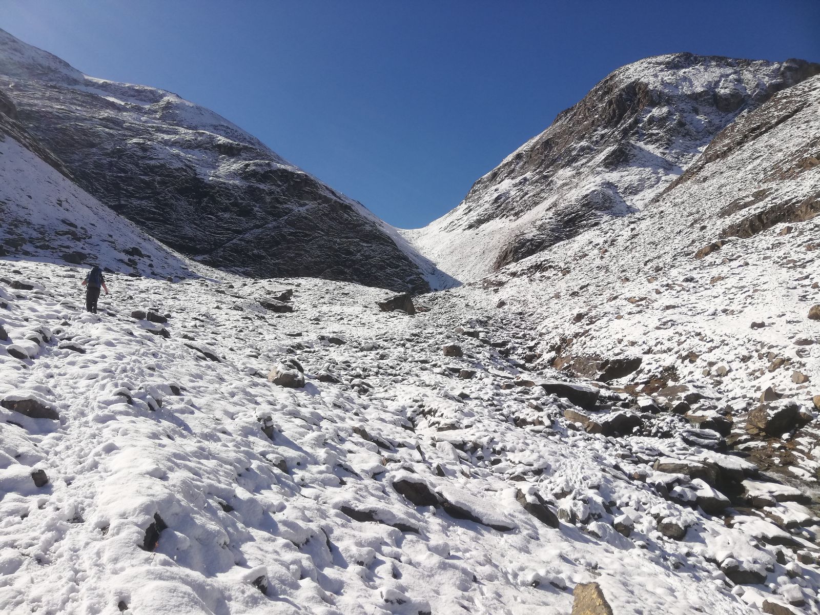 Ab ca 2450m führt der Steig durch Schuttgelände, das noch vor wenigen Jahren eisbedeckt war. Hier ist vieles noch ziemlich locker und der Wegabschnitt ist recht mühsam, der Steig noch nicht besonders ausgeprägt; man muss genau auf die Markierungen achten. Bei uns kam erschwerend hinzu, dass ab etwa 2200m ein paar cm Neuschnee lagen, der das Ganze noch rutschiger machte.