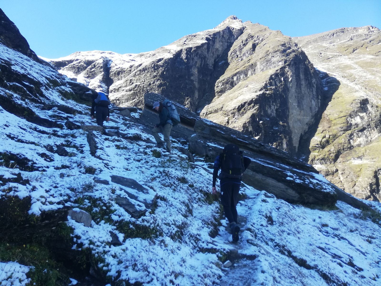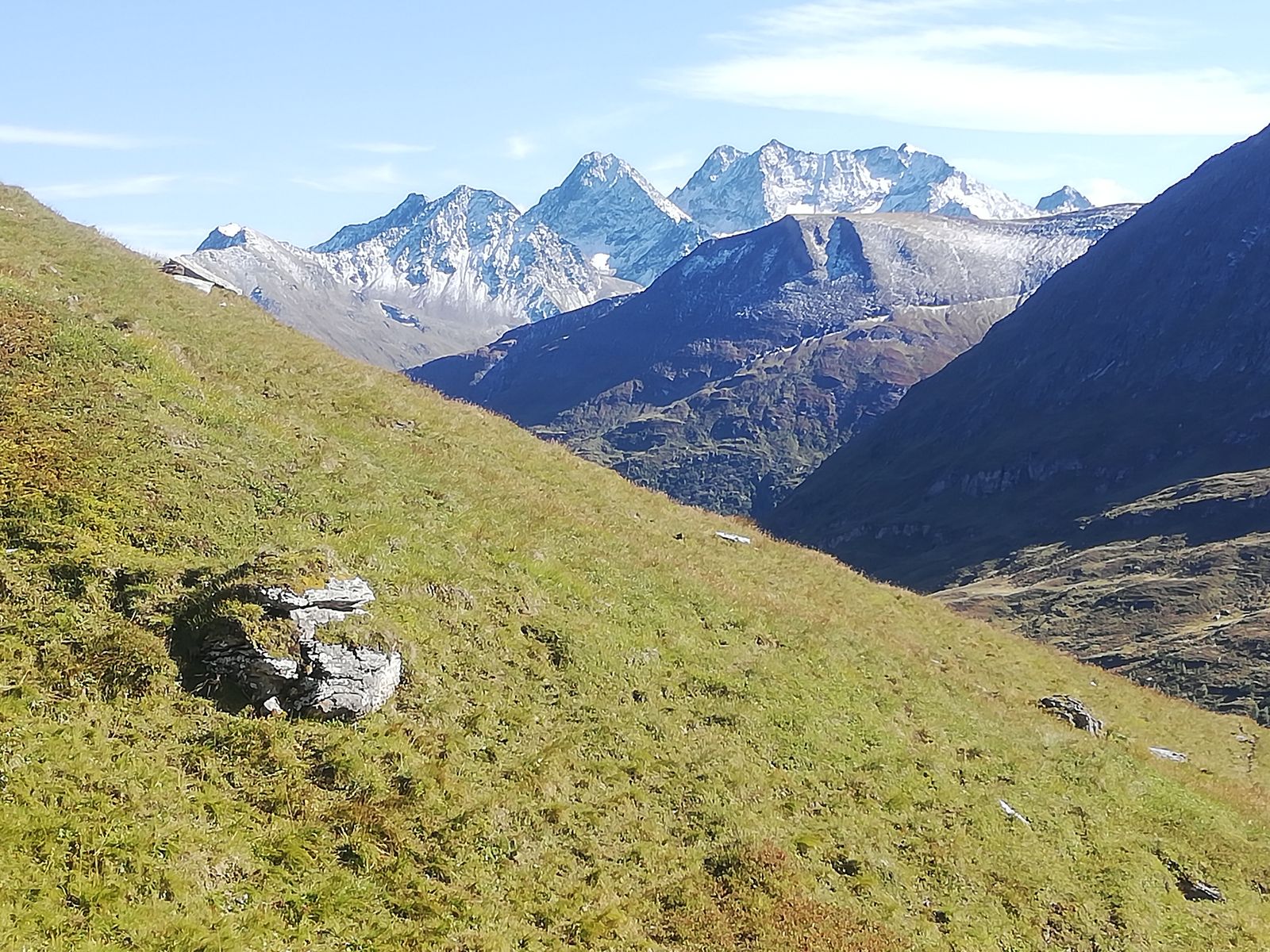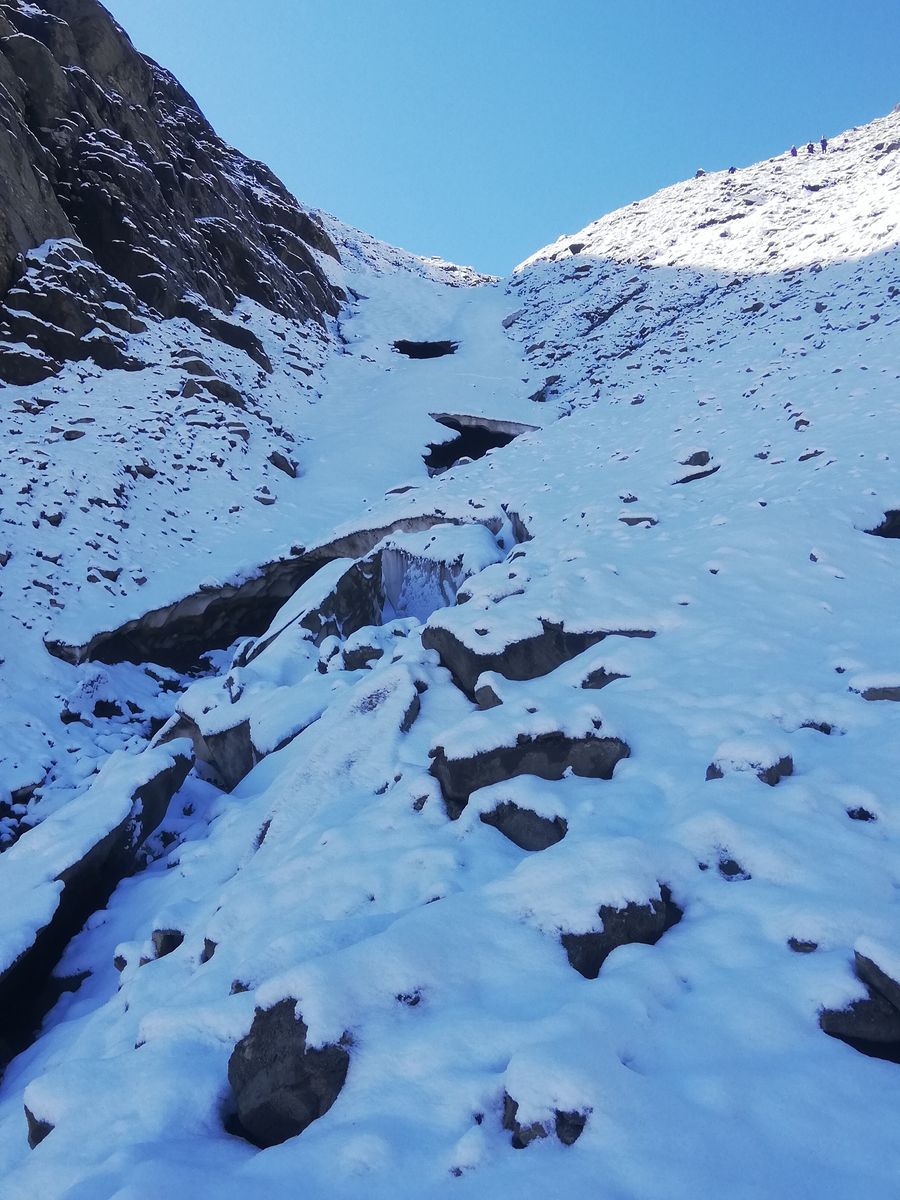 Ab ca 2450m führt der Steig durch Schuttgelände, das noch vor wenigen Jahren eisbedeckt war. Hier ist vieles noch ziemlich locker und der Wegabschnitt ist recht mühsam, der Steig noch nicht besonders ausgeprägt; man muss genau auf die Markierungen achten. Bei uns kam erschwerend hinzu, dass ab etwa 2200m ein paar cm Neuschnee lagen, der das Ganze noch rutschiger machte.