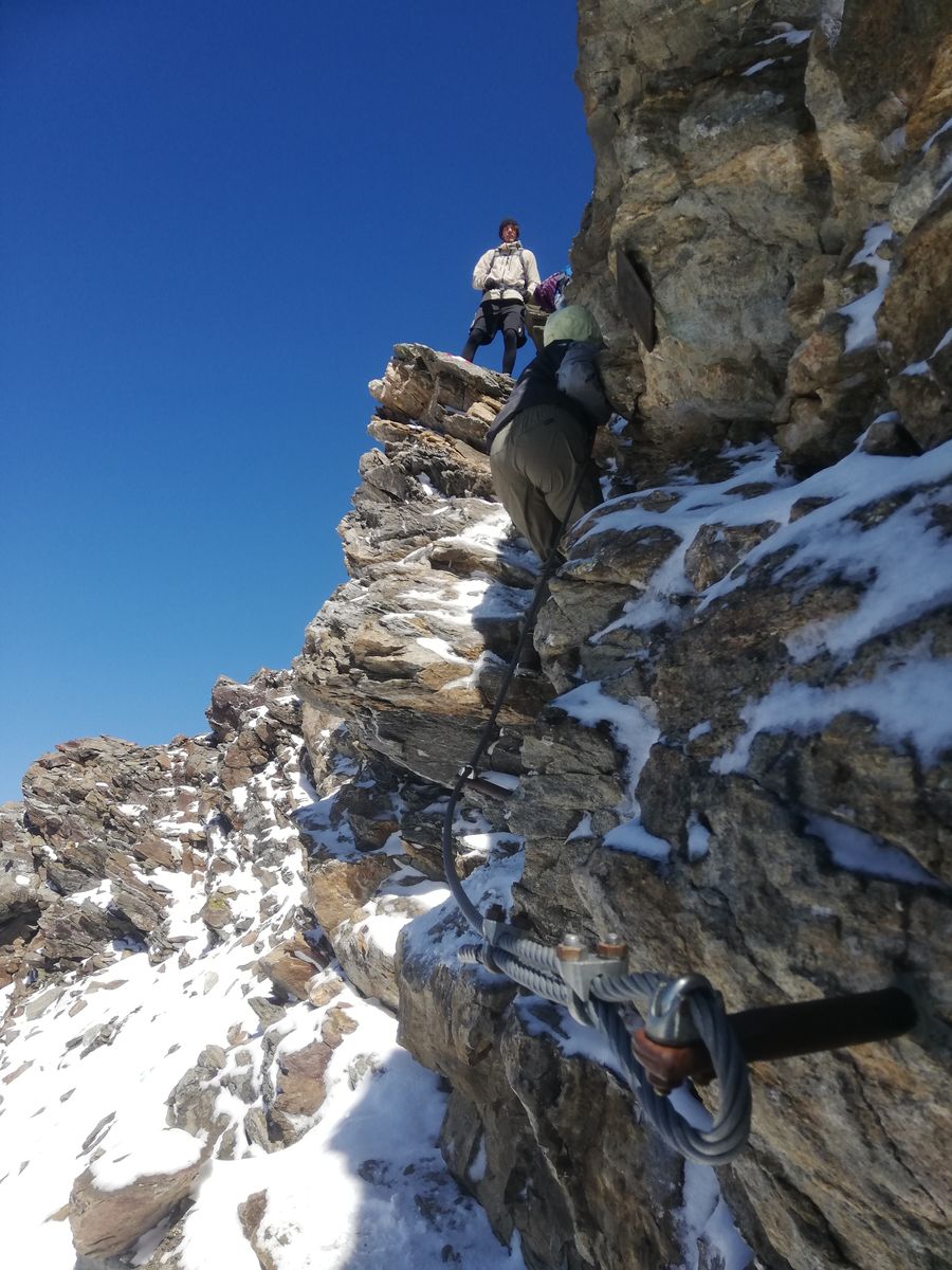 Von der Scharte geht es dann, ebenfalls auf markiertem Steig, immer am Westgrat entlang, zum Gipfel des Spielmann. Das Gelände ist einfach, ein opder zwei Stellen dürften den I. Grad erreichen und erforderten (nur) aufgrund des Neuschnees größere Vorsicht. Die letzten fünf Meter zum Gipfel sind mit einem Stahlseil gesichert. Ohne dieses wohl I - II und bei unseren Verhältnissen schwierig.
