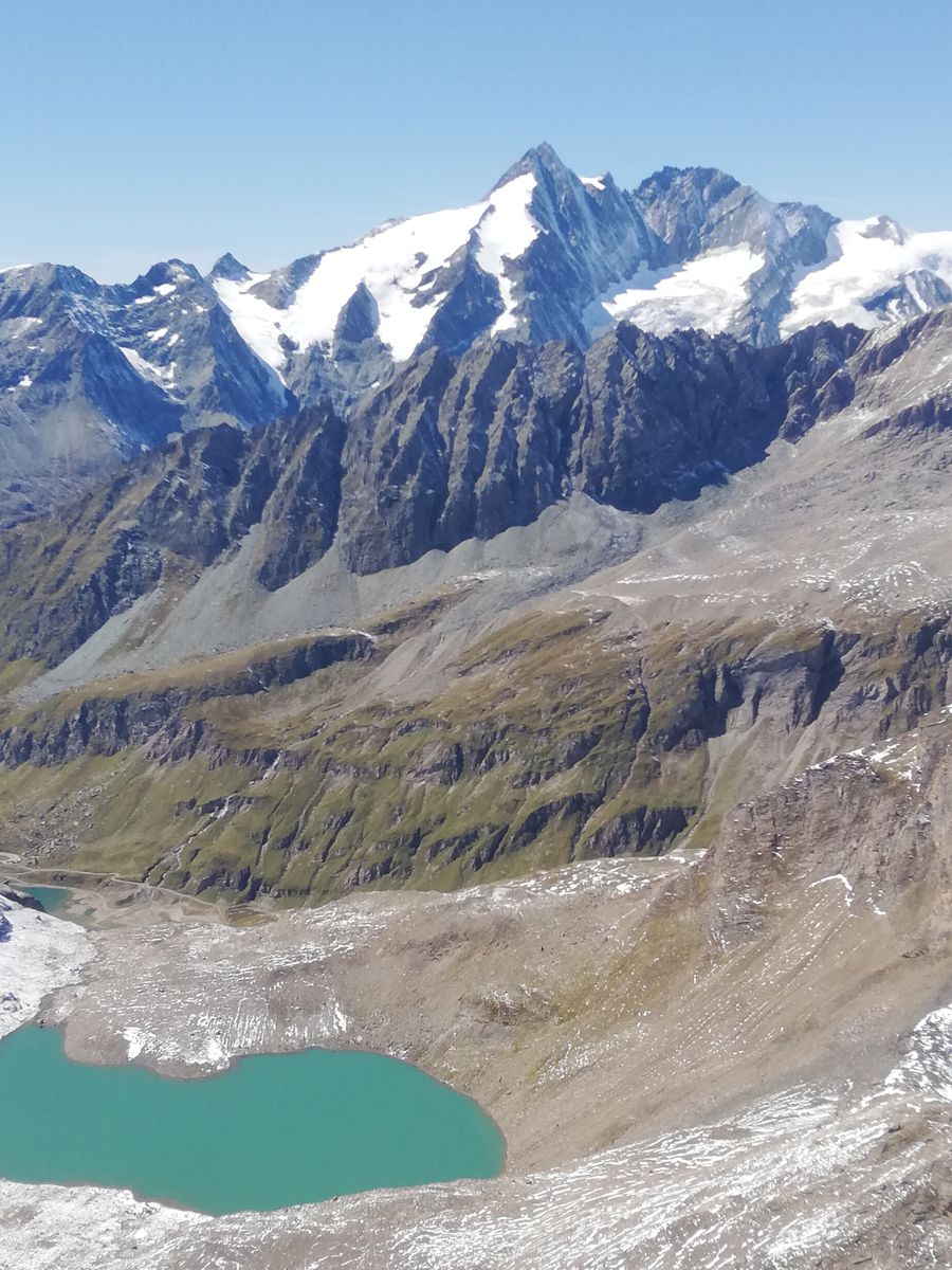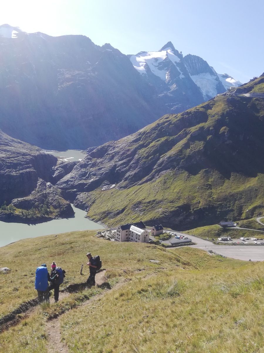 Wir sind dann nach Süden zum Glocknerhaus abgestiegen. Dazu von der Pfandlscharte auf markiertem Steig zunächst etwa 80Hm in einen Karboden mit See, dann wieder etwa 80Hm hinauf auf einen Hügel und über Westhänge hinab zum Haus, das direkt an der Glocknerstraße liegt.