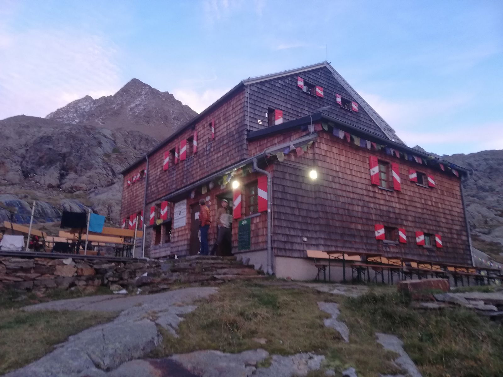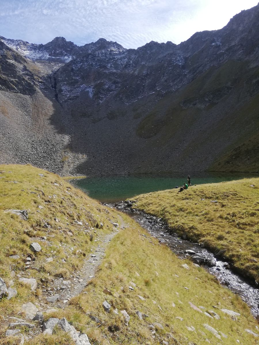 Kurz nach der Äußeren Ebenalm (= einzige bewirtschaftete Alm bis zur Elberfelder Hütte; etwas rechts oberhalb des Weges gelegen) muss man sich entscheiden, welchen Weg man zur Hütte gehen will: Entweder auf der rechten Talseite gemächlich ansteigend das Tal weiter oder auf der linken Talseite steil hoch an der Wirtsbaueralm (evtl. früher im Jahr bewirtschaftet (?)) vorbei bis auf eine Höhe von etwa 2050m und dann immer auf kleinem Steig hoch über dem Talboden taleinwärts und in leichtem Auf und Ab bis maximal 2440m an den drei Langtalseen vorbei zur Hütte. Wir haben die letztere Variante gewählt, die allerdings auch ca zwei Stunden länger ist als der Weg durchs Tal. Es waren insgesamt ca 18km und wir waren - mit Pausen - rund neun Stunden (reine Gehzeit etwa 7,5 Stunden) unterwegs.