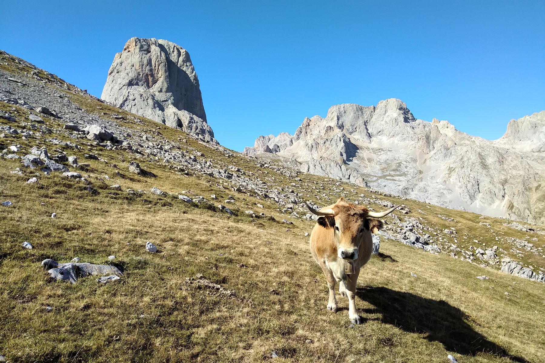 Am Übergang angekommen, gab es einen kleinen Kulturschock: es waren massenweise Leute unterwegs! Später haben wir gesehen, dass man von Süden aus ziemlich einfach von Fuente Dé über die Seilbahn zur Cabaña Verónica kommt. Die Biwakschachtel hat nur Übernachtungs-Plätze für 6 Personen, wird aber gerne auch von Tagesgästen besucht. Beim Rückweg waren wir ab dem Sattel wieder fast allein unterwegs.