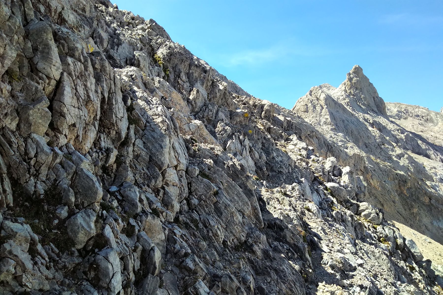 Kurz nach dem Einstieg in den nicht mehr versicherten Steig auf der Nordseite der Cabaña Veronica (Horcaos Rojos), gut markiert mit gelben Punkten: