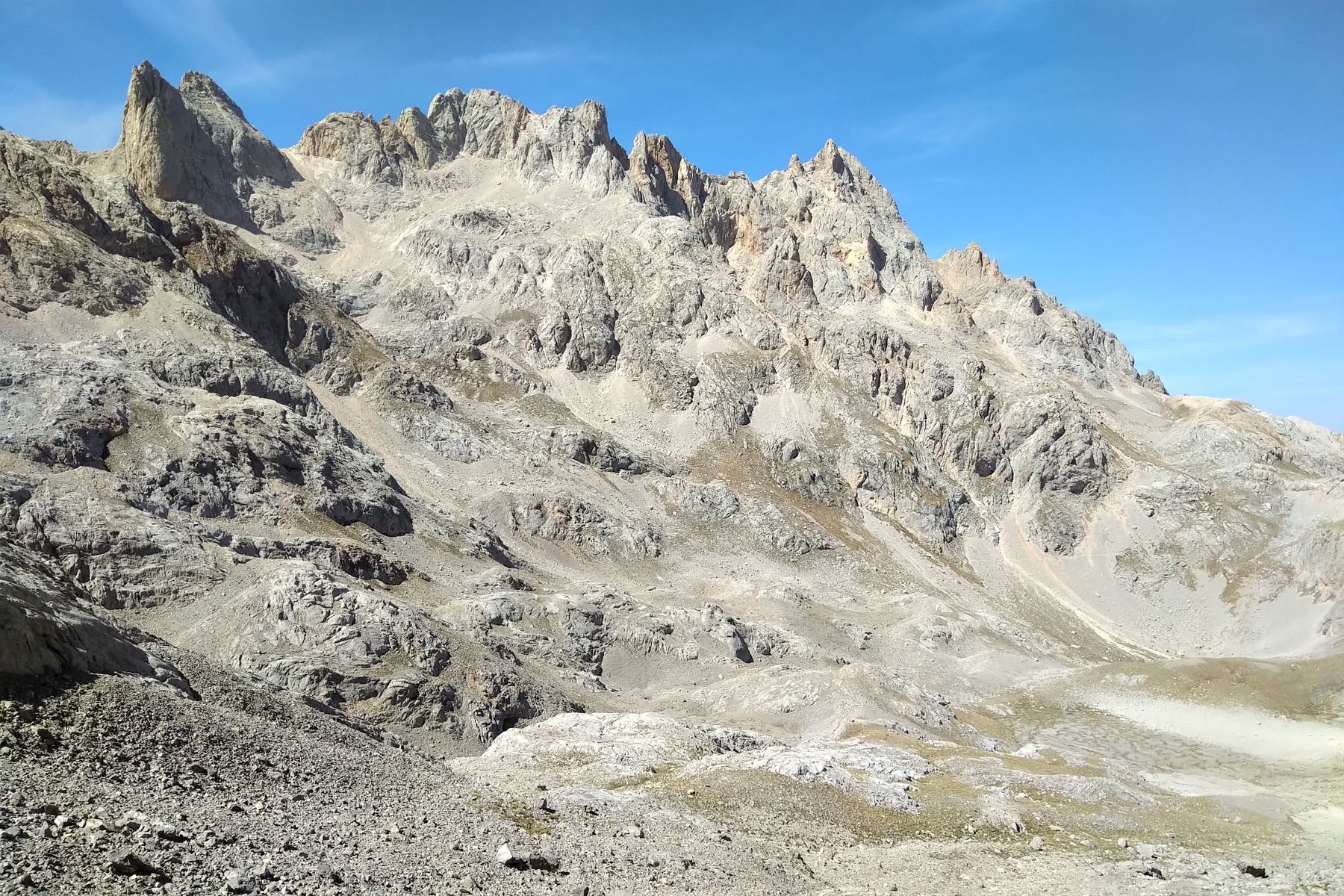 Kurz vor dem Collau Cambureru, beim Aufstieg zum Peña Castil. Hinten links der Pico Uriellu, hinten rechts das Gelände beim Weiterweg zur Cabrones-Hütte (ganz rechts der Arenera-Pass):