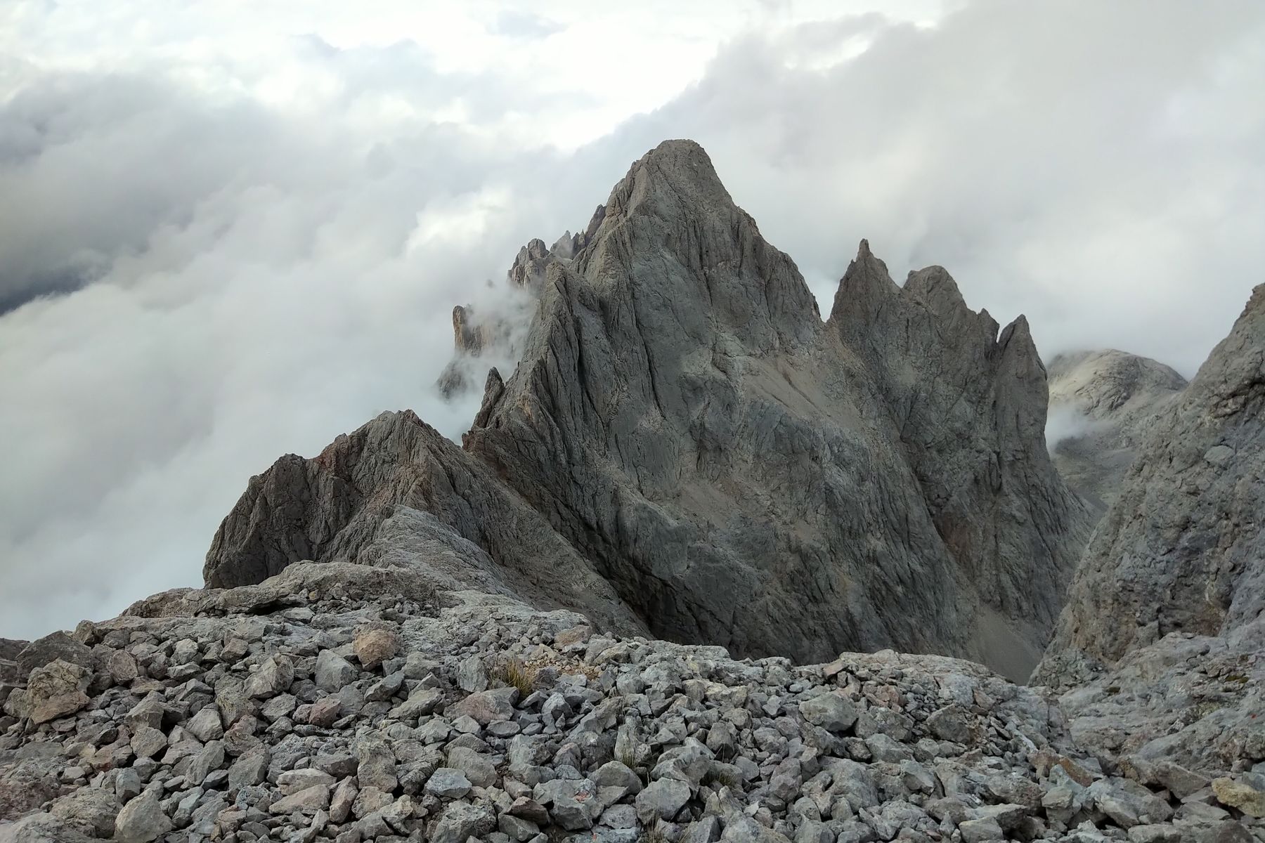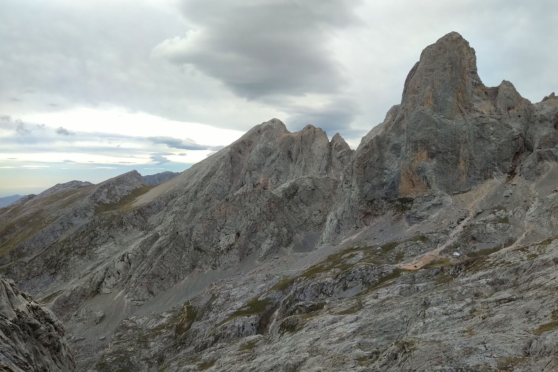 Tag 7: Die Wettervorhersage war für die erste Tageshälfte sowieso mau, da haben wir mal ausgeschlafen. Später wurde es besser, da habe ich schonmal den Weg zum Collado Cuebre erkundet. Davon wurde berichtet, dass er schwierig zu finden wäre, da das eine alte, selten begangene Route ist, die lange nicht mehr gewartet wird. Ich fand es von der Orientierung her ok, aber durch die Vor-Erkundung haben wir am nächsten Tag sicher eine halbe Stunde Zeit gespart. Ich bin vom Cuebre-Pass noch etwas weiter gestiegen, um einen Blick auf den Weiterweg zur Turonero-Scharte zu bekommen.