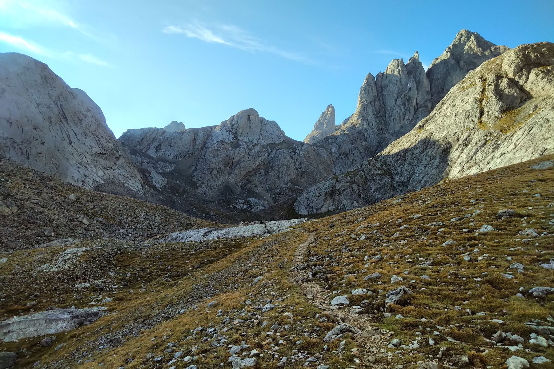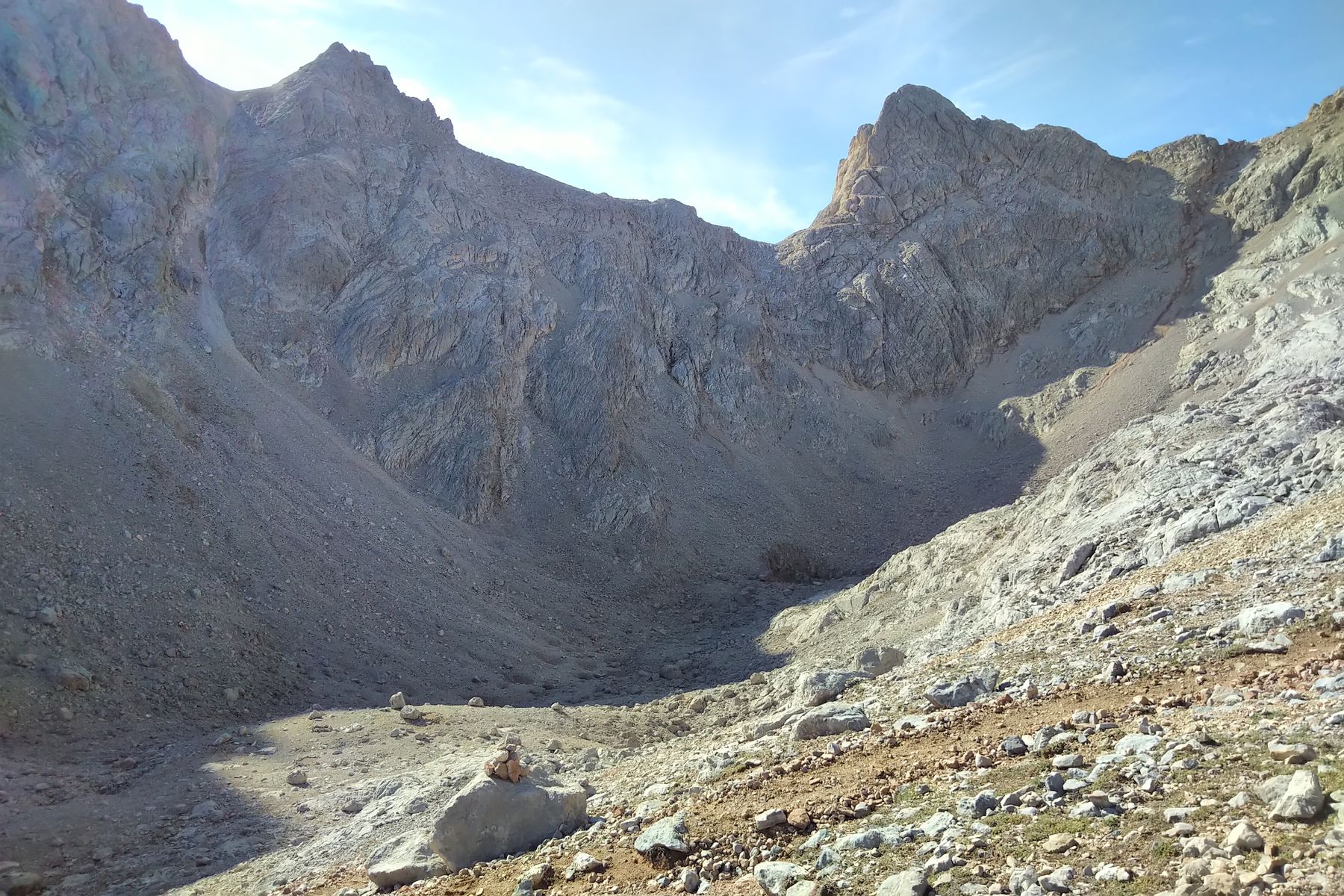Im Jou de Cerredo, hinten in der Mitte sieht man andeutungsweise die steile Rinne, die man zum ersten Arenizas-Pass aufsteigen muss (Arenizas Altas bzw. Horcada de Don Carlos):