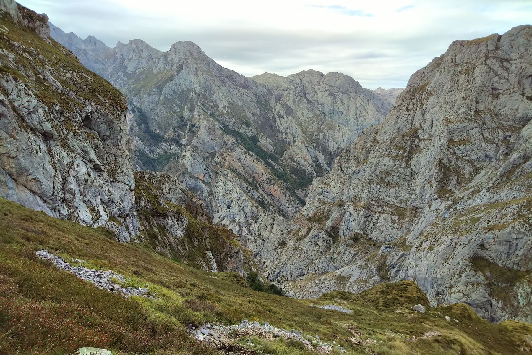 Wir sind am Vortag 100 Höhenmeter in den Canal del Agua abgestiegen. Dieser Teil sah ok aus, man konnte es aber nicht weiter einsehen. Da man sich wegen der Sperrungen in der Cares-Schlucht sowieso kaum Höhenmeter spart, haben wir uns auch für den längeren Abstieg über die Arenizas-Pässe entschieden. Wegen der Sperrungen müsste man später wieder zur Collada del Cuebre aufsteigen (300 Hm), was nicht viel weniger ist als die Gegenanstiege über die Arenizas-Route (ca. 500 Hm).