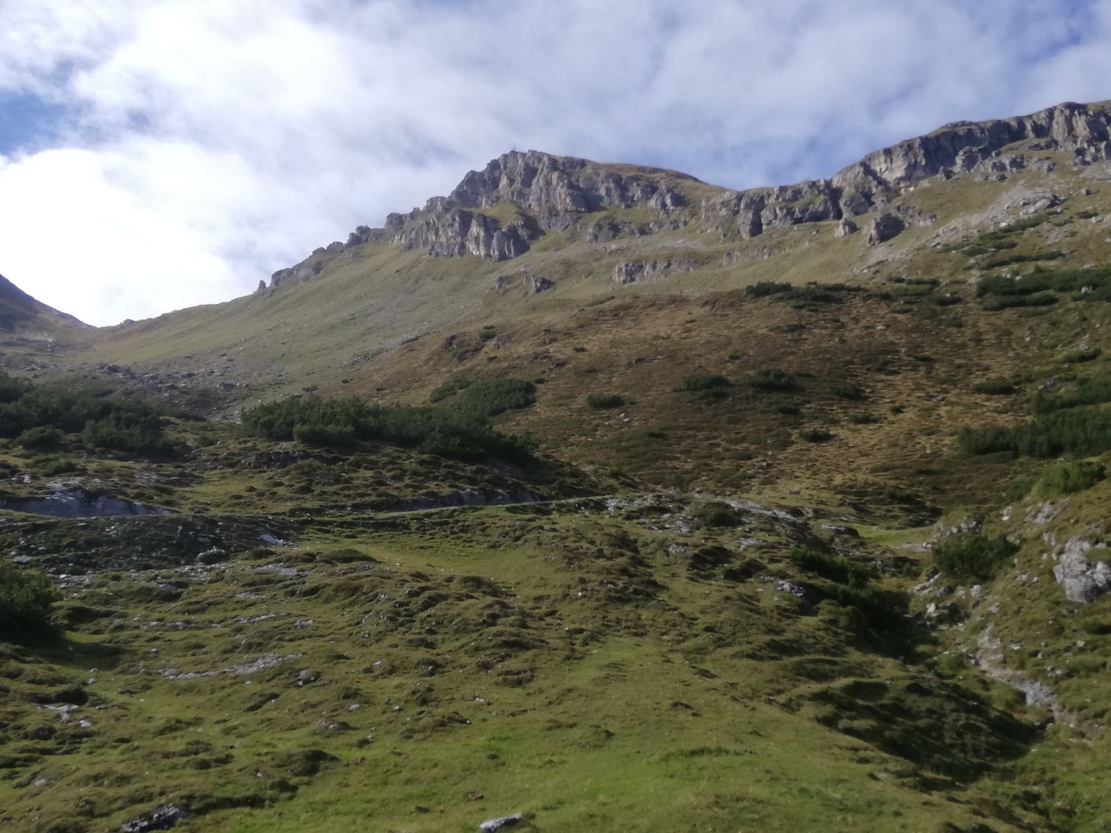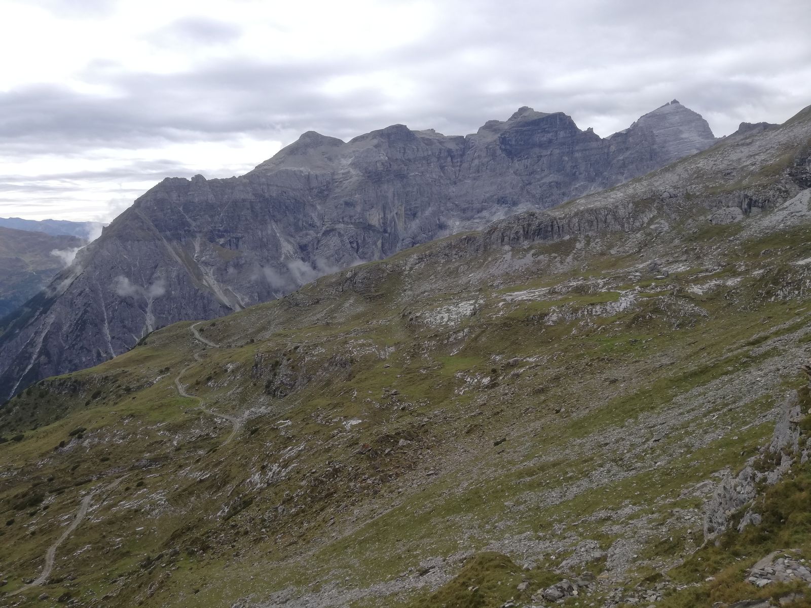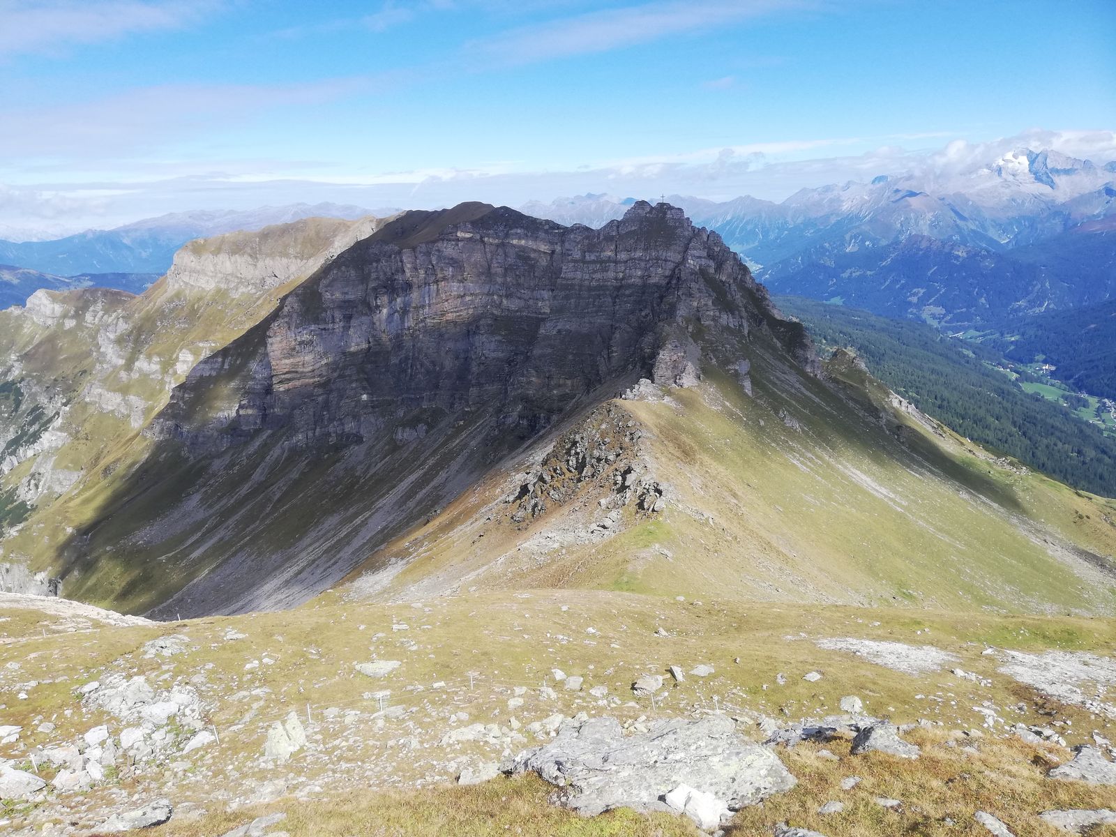 Anschließend auf dem Aufstiegsweg (egal welche der beiden Varianten) zurück zum Abzweig von Weg 126 auf 2300m und weiter auf dem markierten Steig zum Muttenjoch und von dort auf ebenfalls markiertem (verblasst) Steig zum Muttenkopf mit seiner weiten Gipfelfläche.