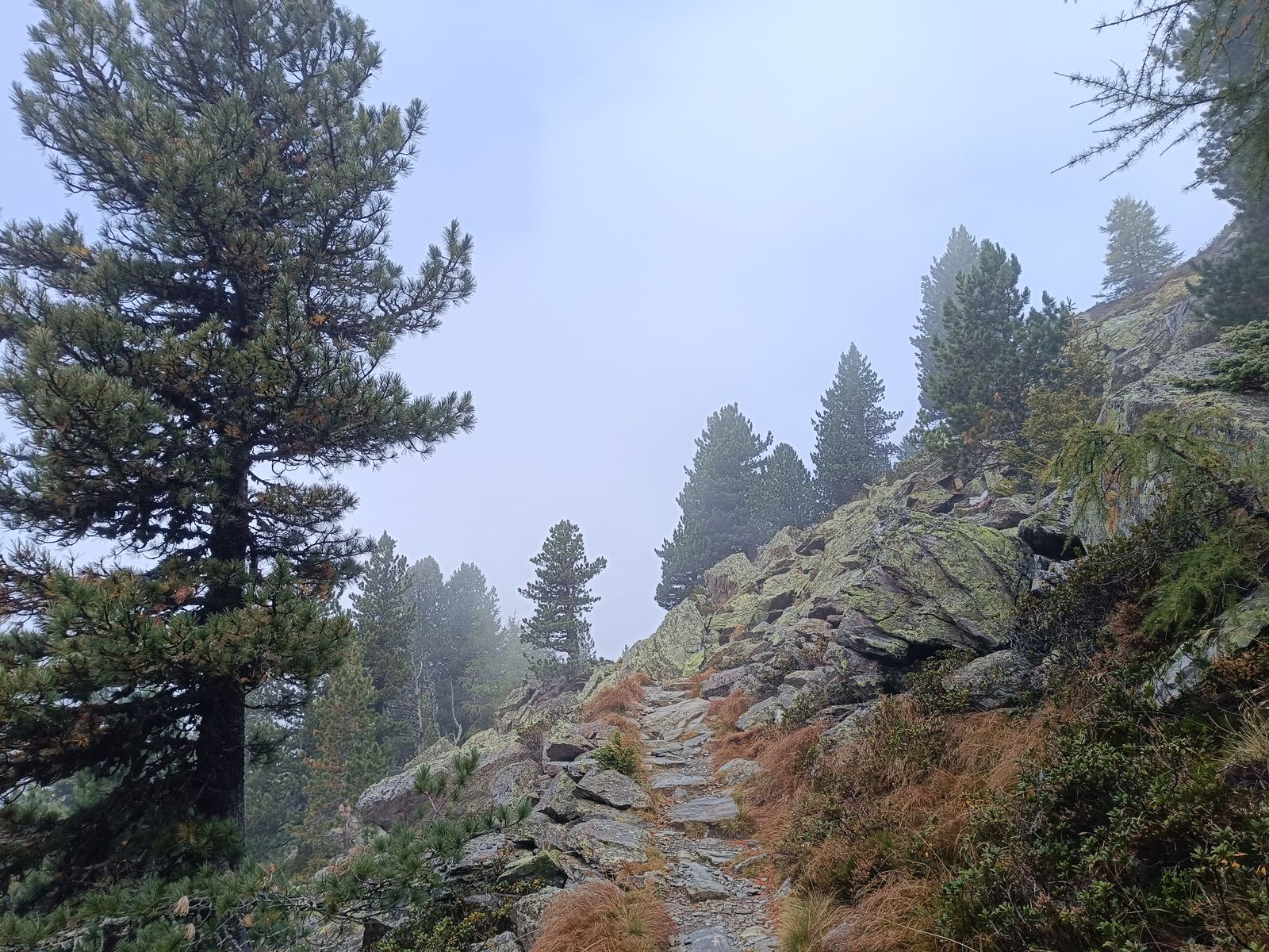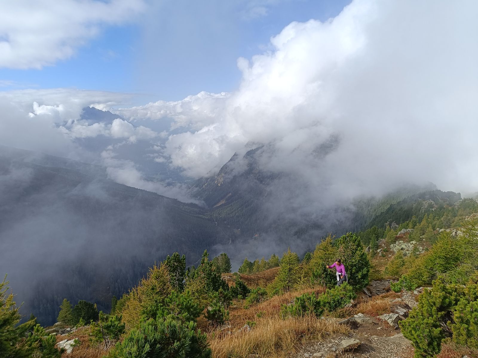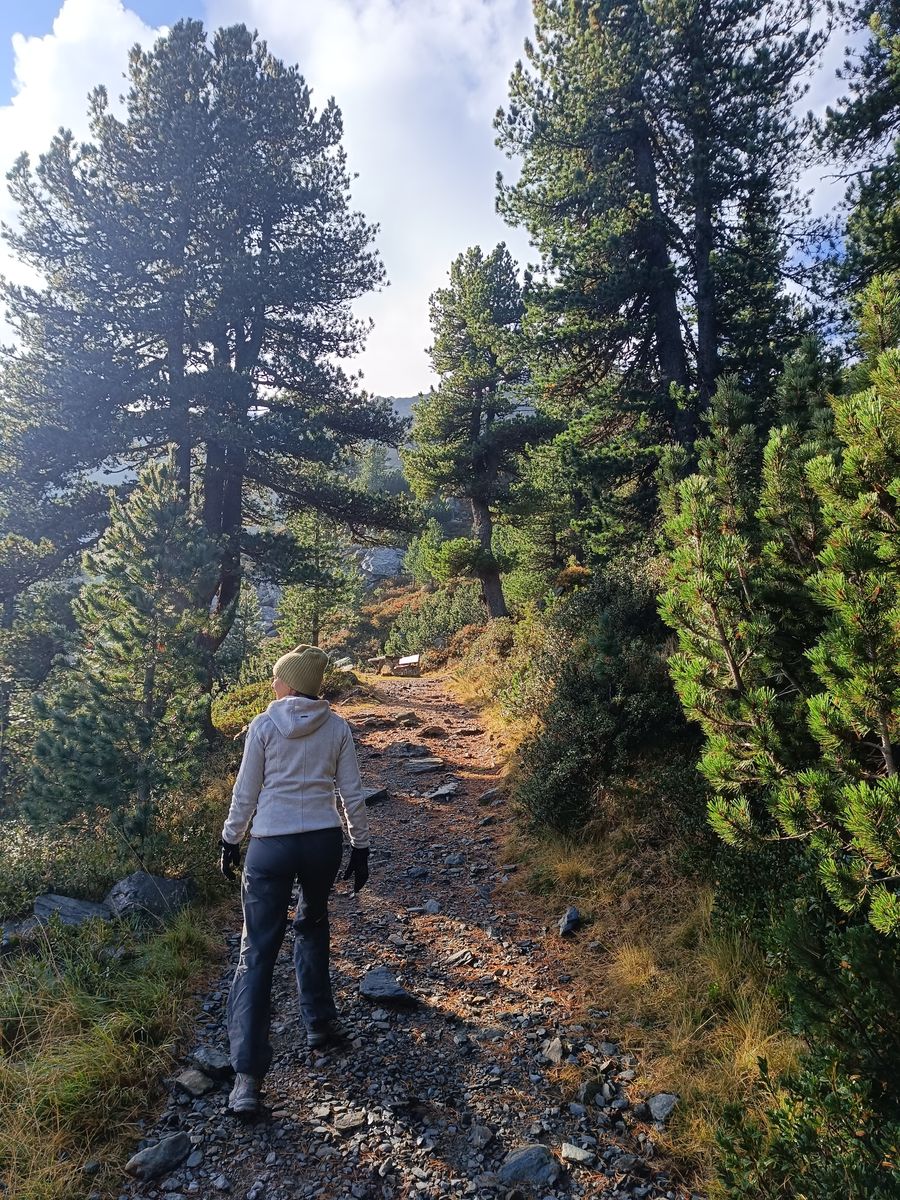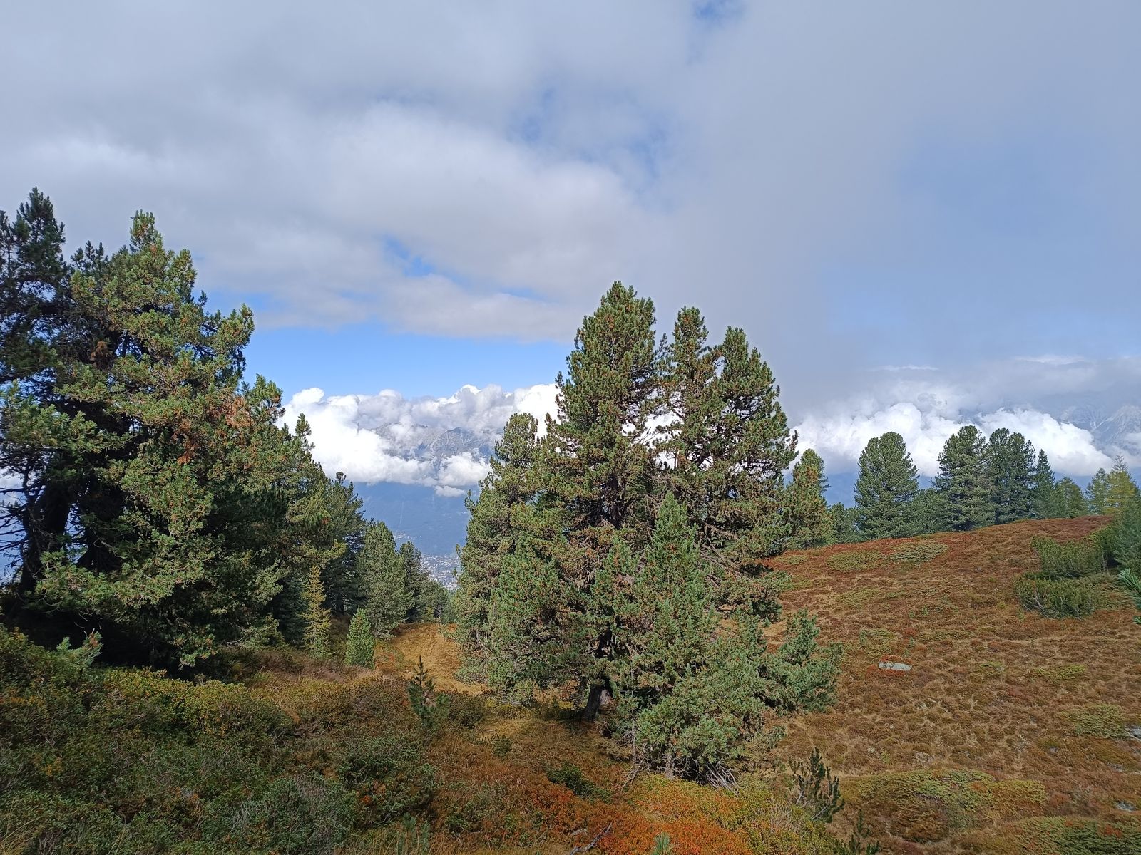Daher ging es mit der ersten Gondel (auch das mach ich sonst nie) um halb 9 hoch zur Bergstation Tulfein und auf dem Zirbenweg Richtung Patscherkofel, bis der Steig zur Viggarspitze abzweigt. Dank des frühen Starts waren Daniela und ich bis hier allein und erst im Abstieg vom Gipfel kamen uns die ersten Wanderer entgegen. Wir sind dann nicht bis zum Patscherkofel weiter, sondern kurz vor dem Gasthaus Boscheben rechts abgezweigt. Abstieg über Aldranser und Rinner Alm nach Rinn und via Speckbacherweg zurück zum PP der Glungezer-Bahn.