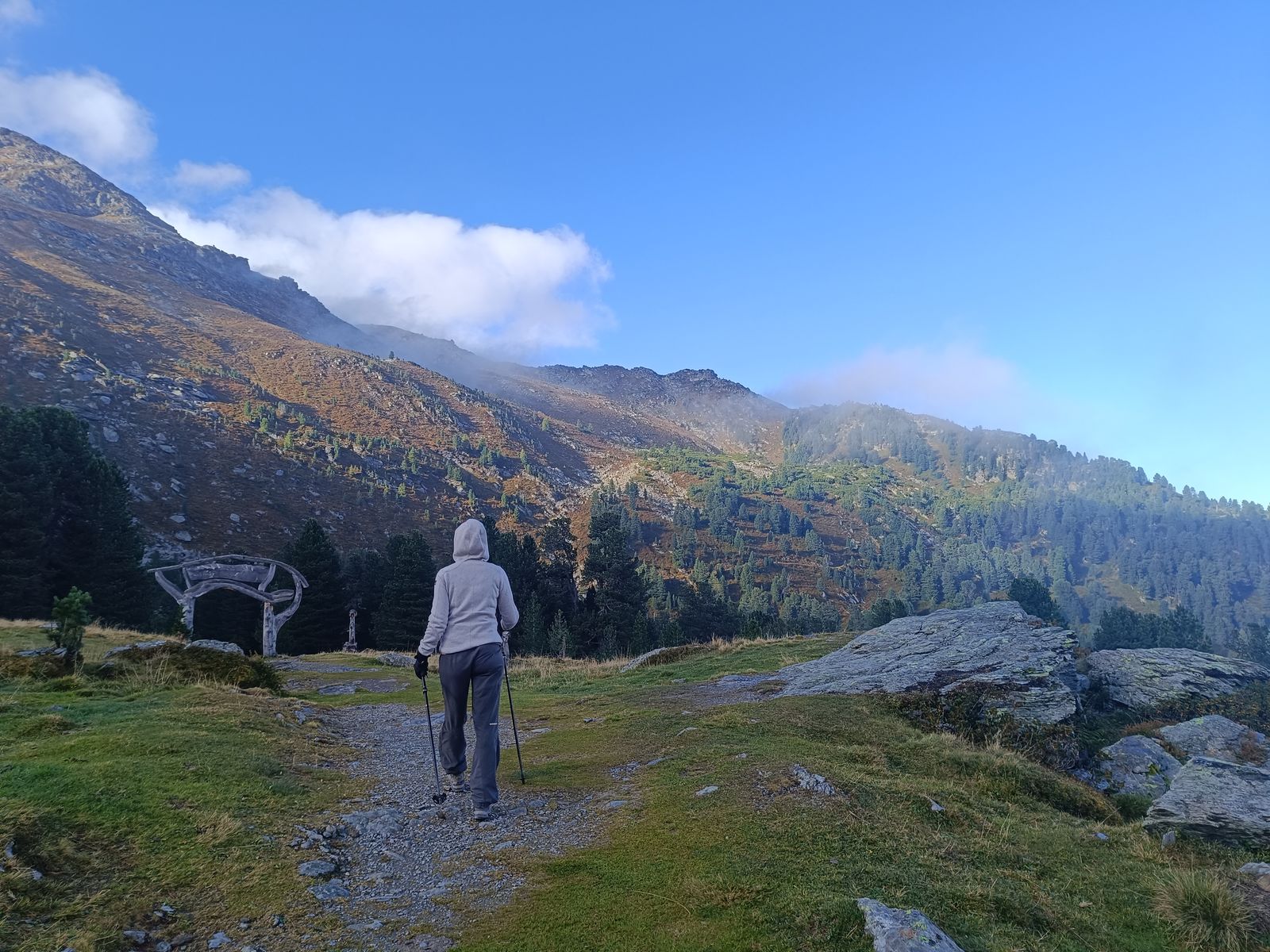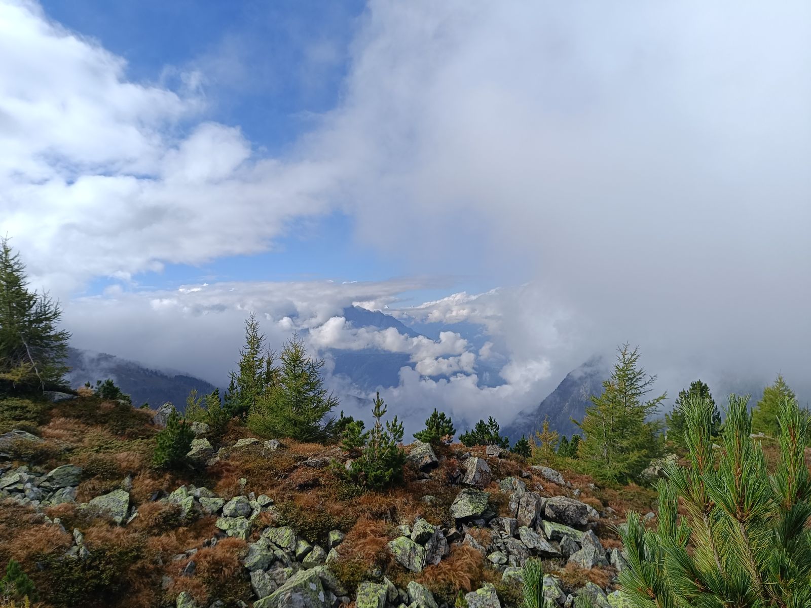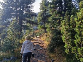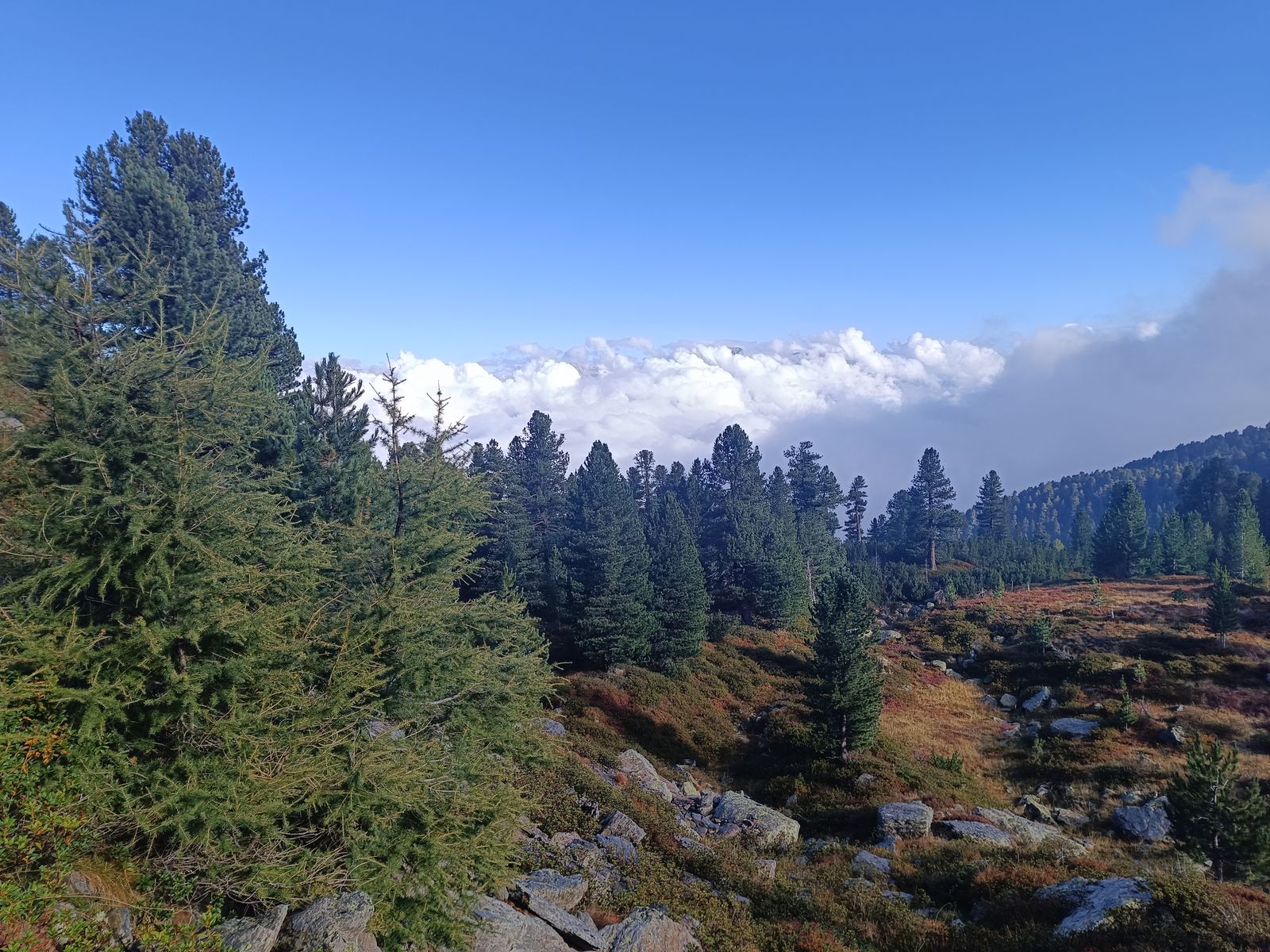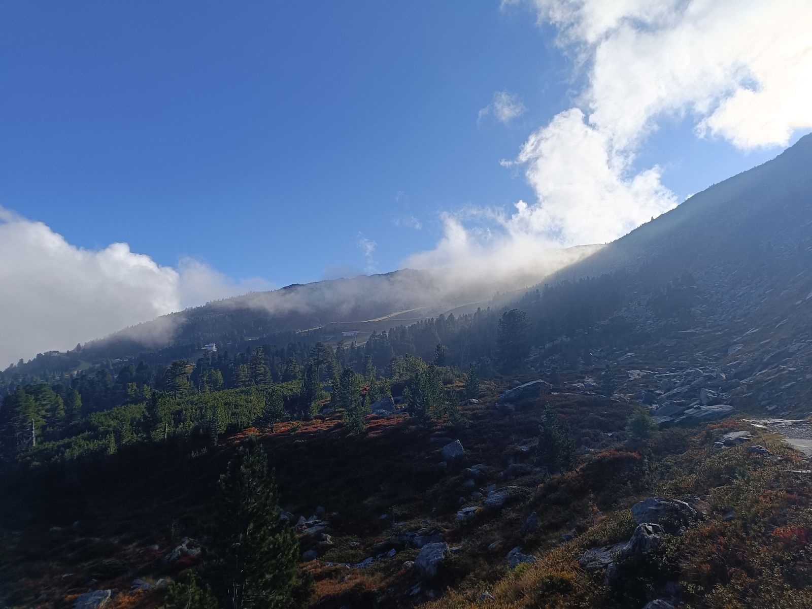 Daher ging es mit der ersten Gondel (auch das mach ich sonst nie) um halb 9 hoch zur Bergstation Tulfein und auf dem Zirbenweg Richtung Patscherkofel, bis der Steig zur Viggarspitze abzweigt. Dank des frühen Starts waren Daniela und ich bis hier allein und erst im Abstieg vom Gipfel kamen uns die ersten Wanderer entgegen. Wir sind dann nicht bis zum Patscherkofel weiter, sondern kurz vor dem Gasthaus Boscheben rechts abgezweigt. Abstieg über Aldranser und Rinner Alm nach Rinn und via Speckbacherweg zurück zum PP der Glungezer-Bahn.