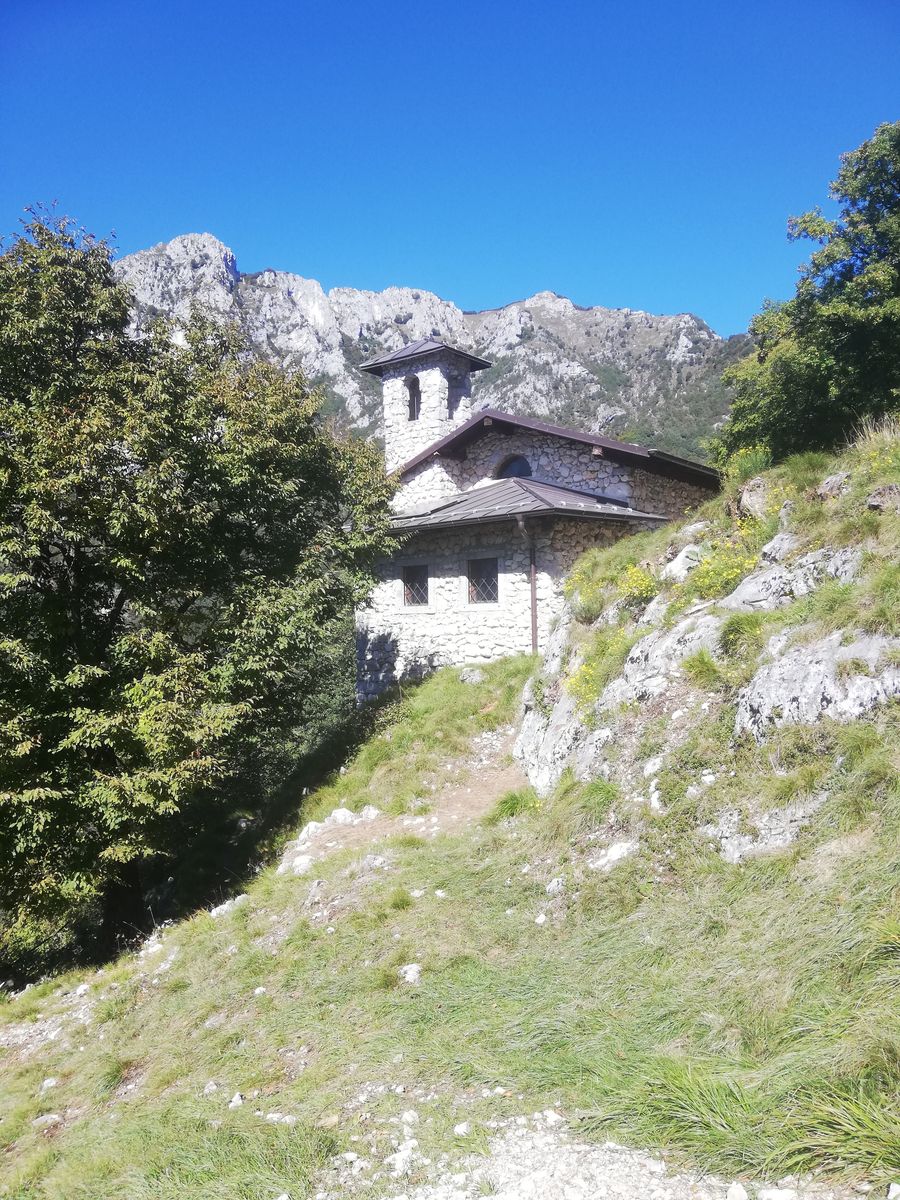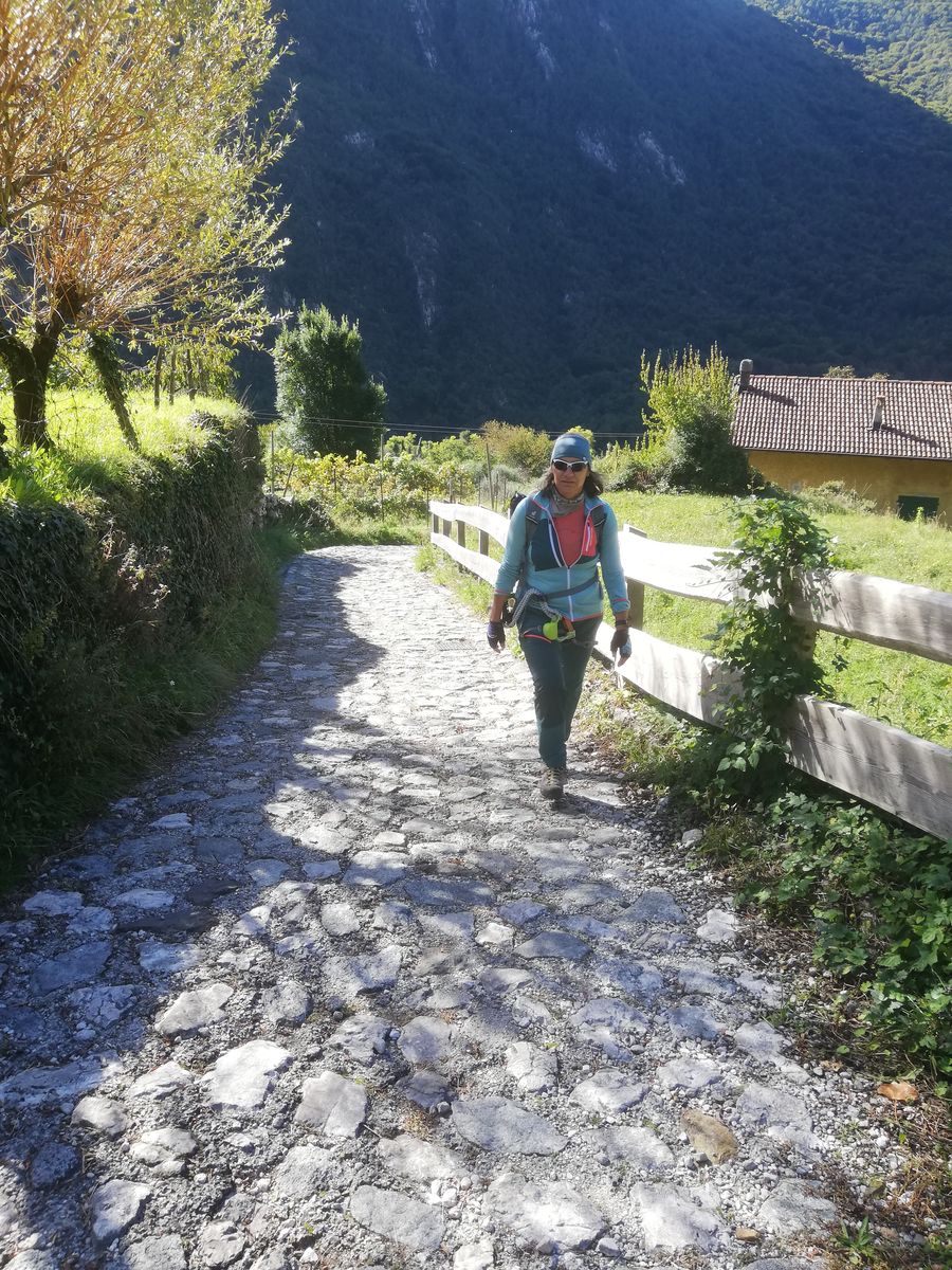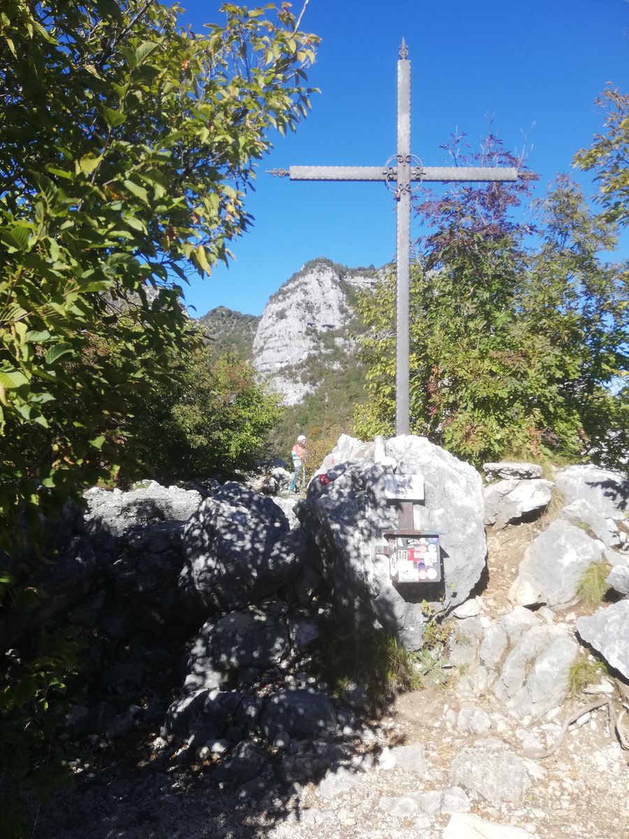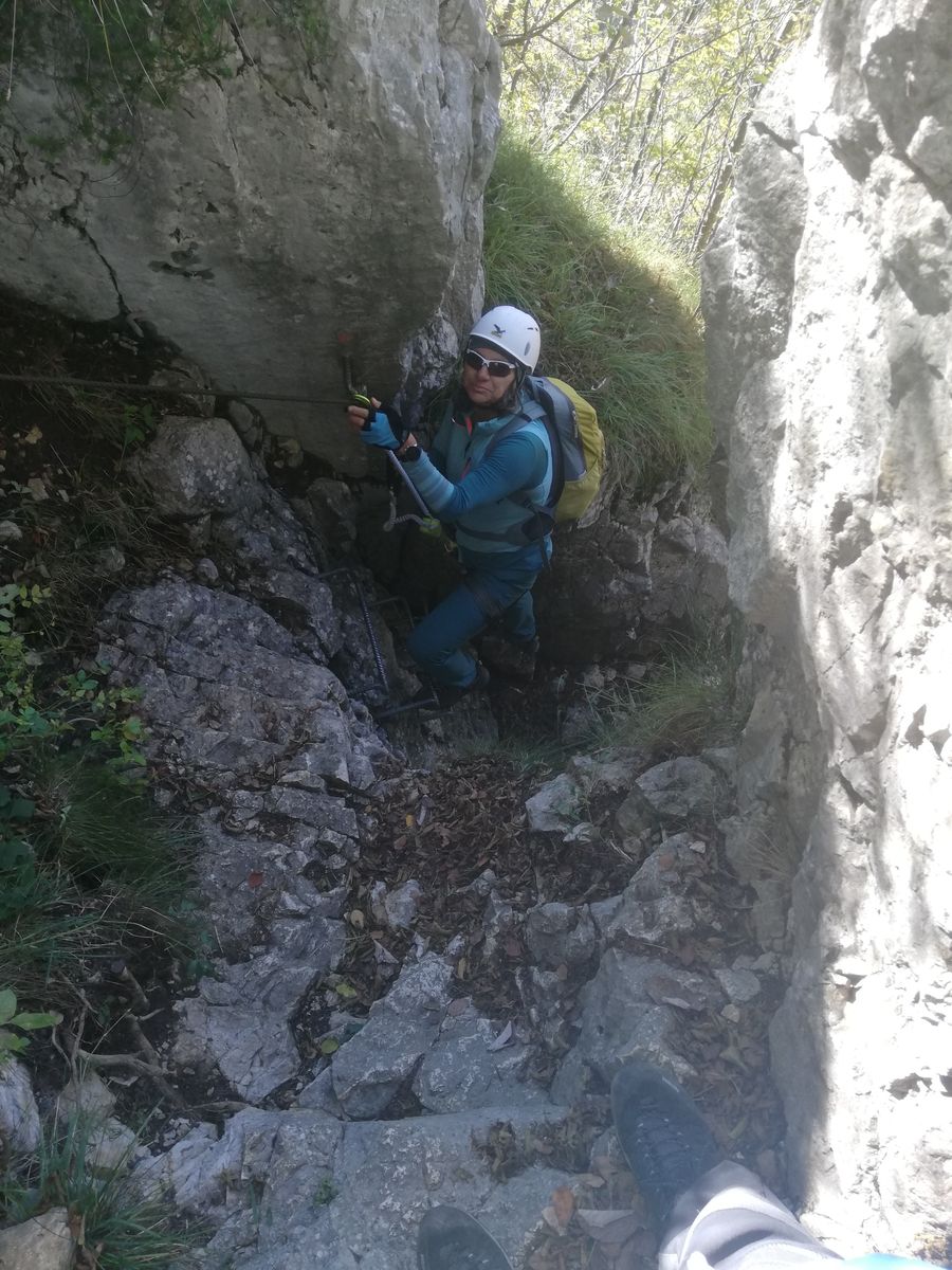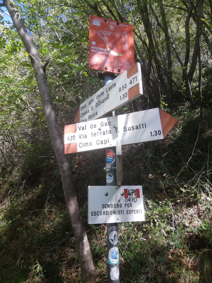 Zunächst auf Weg 470 (Senter dei Beach) Richtung Cima Capi. Bald zweigt der Weg 471 ab und führt als Klettersteig "delle Laste" nach links hoch zur Kapelle San Giovanni. Stahlsicherungen sind nur an einigen Stellen vorhanden, max. Schwierigkeitsgrad B, der Rest ist ein Steig. Von San Giovanni weiter dem Wegweiser folgend zur Cima Rocca. Ein paar kurze Tunnelpassagen, einmal führt eine Eisenleiter aus einem Tunnel raus, Lampe notwendig. Vor dem Eingang des langen Tunnels, der den Gipfel unterquert, rechts auf Steig (Wegweiser) zum Gipfel.