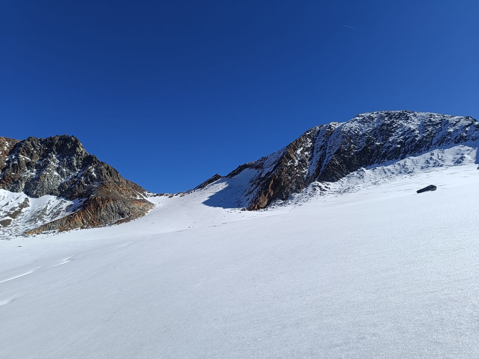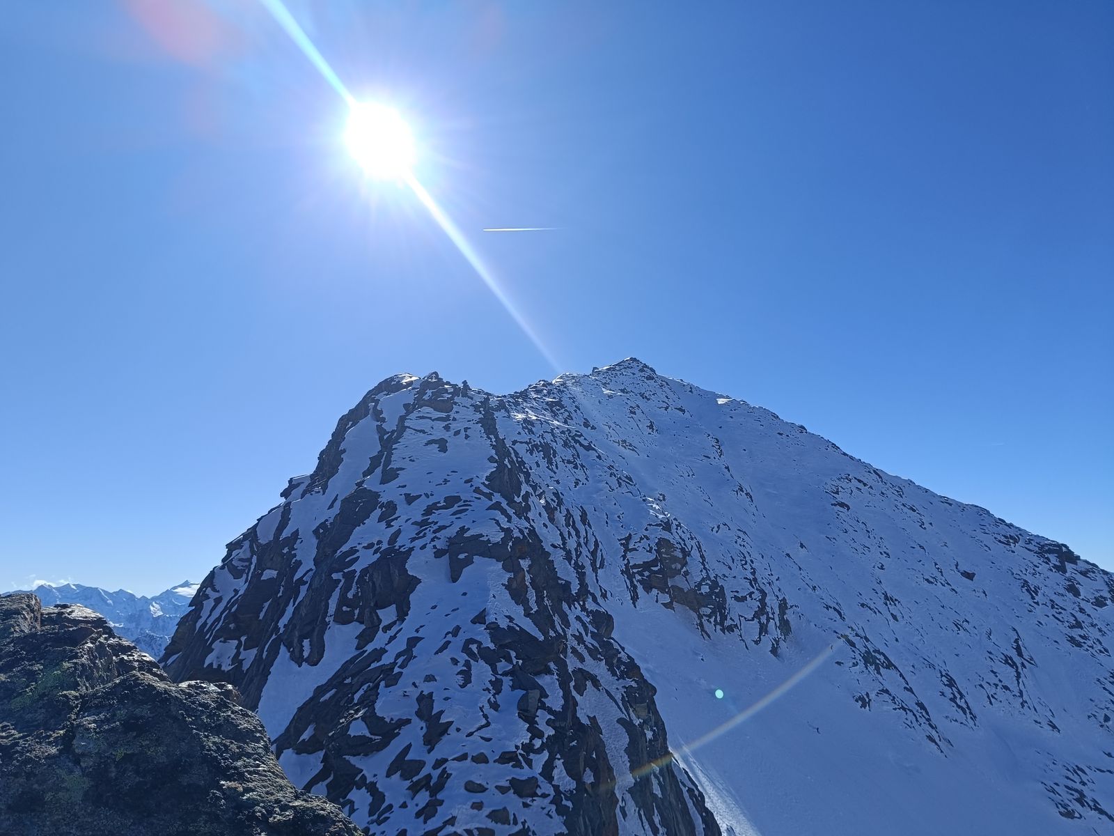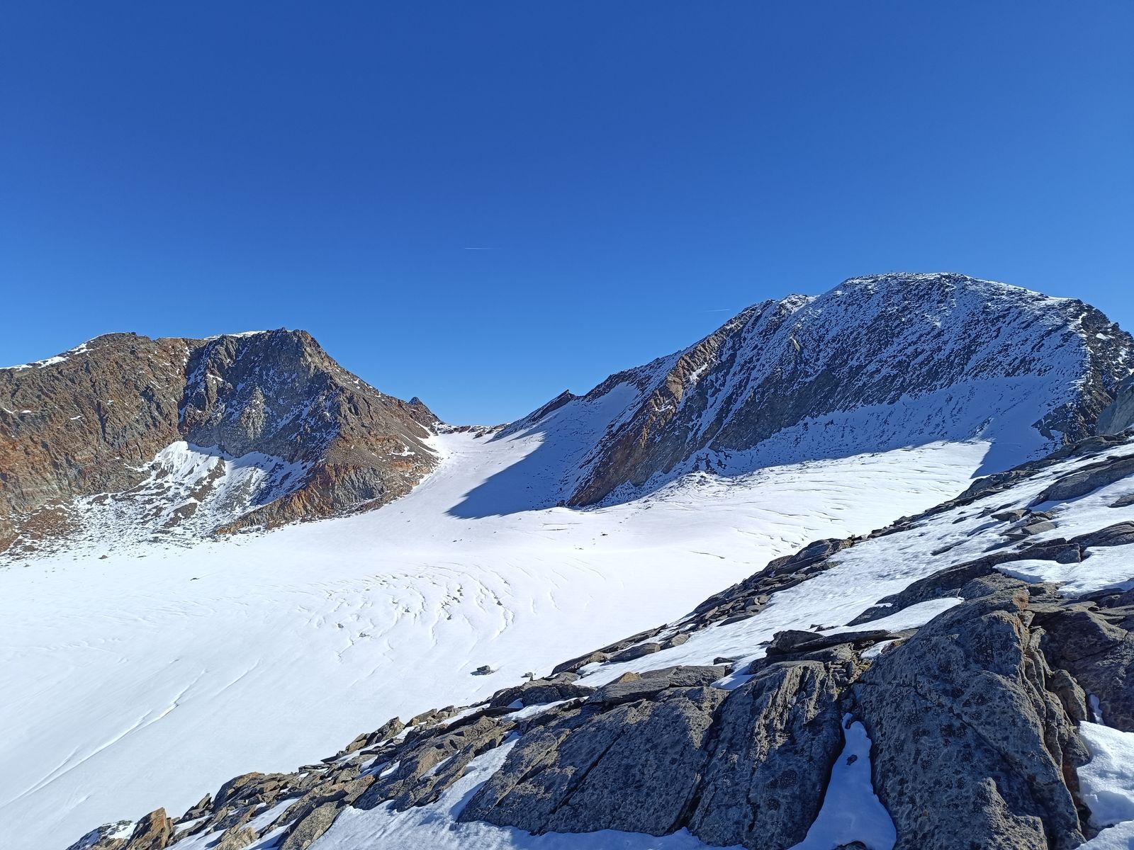 Anders als am Alpenrand hatte es inneralpin die ganze Woche schönes, nebelfreies Wetter, was dazu geführt hat, dass der Schnee sonnseitig bis 3400 Meter hinauf fast ganz weg ist. In Nordhängen liegt (sehr wenig) Schnee ab etwa 2700 Metern; geschlossene Schneedecke nur auf Gletschern.